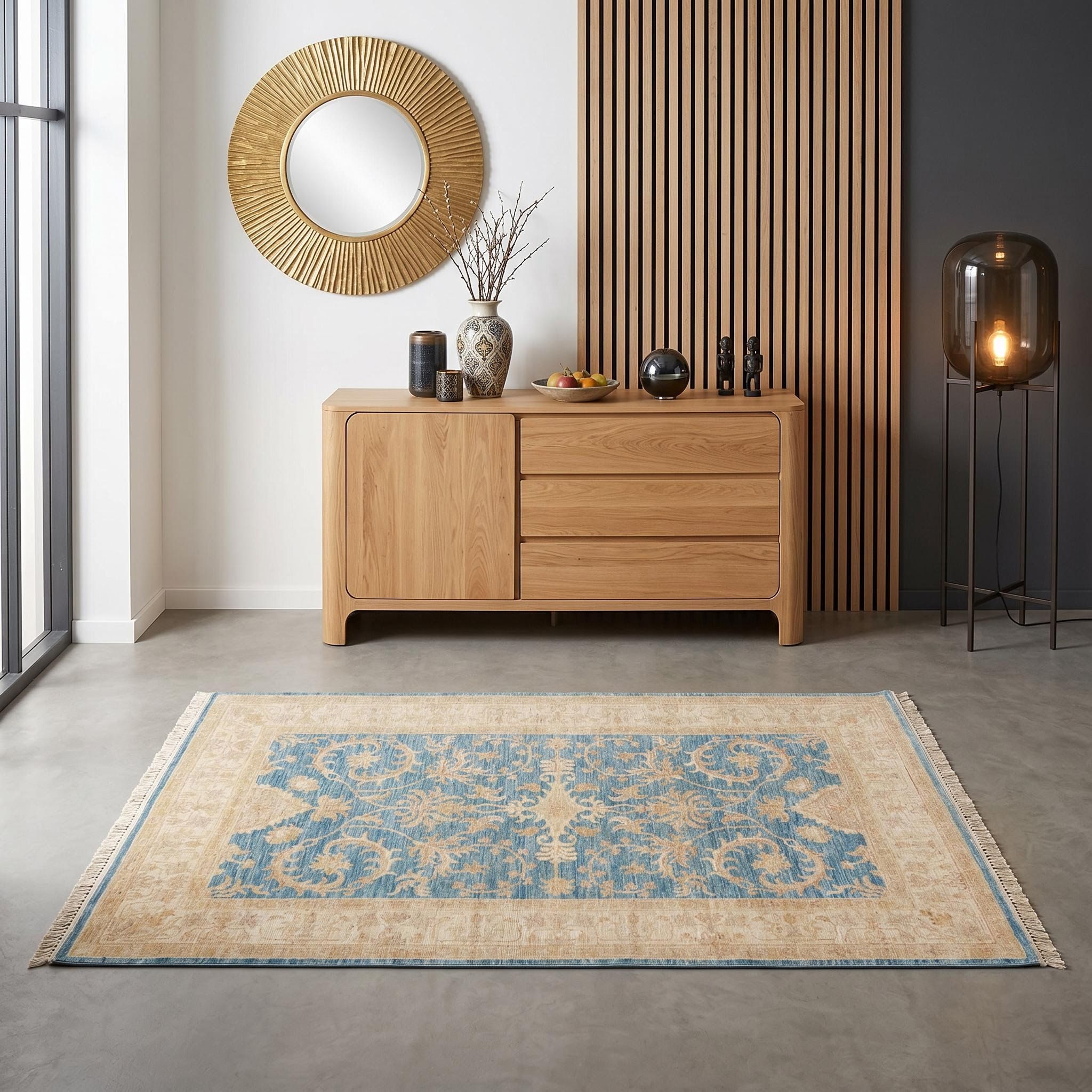 Als bewusster Stilbruch eingesetzt, entfaltet dieser Teppich eine faszinierende Wirkung vor der rauen Kulisse von Beton, unbehandeltem Backstein und kühlem Metall. Die zarten floralen Ornamente und die weiche, handversponnene Wolle bilden einen spannenden, sanften Kontrast zum herben, maskulinen Charme des Industrie-Lofts. Das seltene Hellblau greift die Kühle von Stahlelementen auf, während die hochwertige Materialität dem Raum die Härte nimmt und für Wohnlichkeit sorgt. So verwandelt der Ferahan-Ziegler einen funktionalen Raum in einen stilvollen Wohnbereich mit einem kunstvollen, qualitätsbewussten Statement.