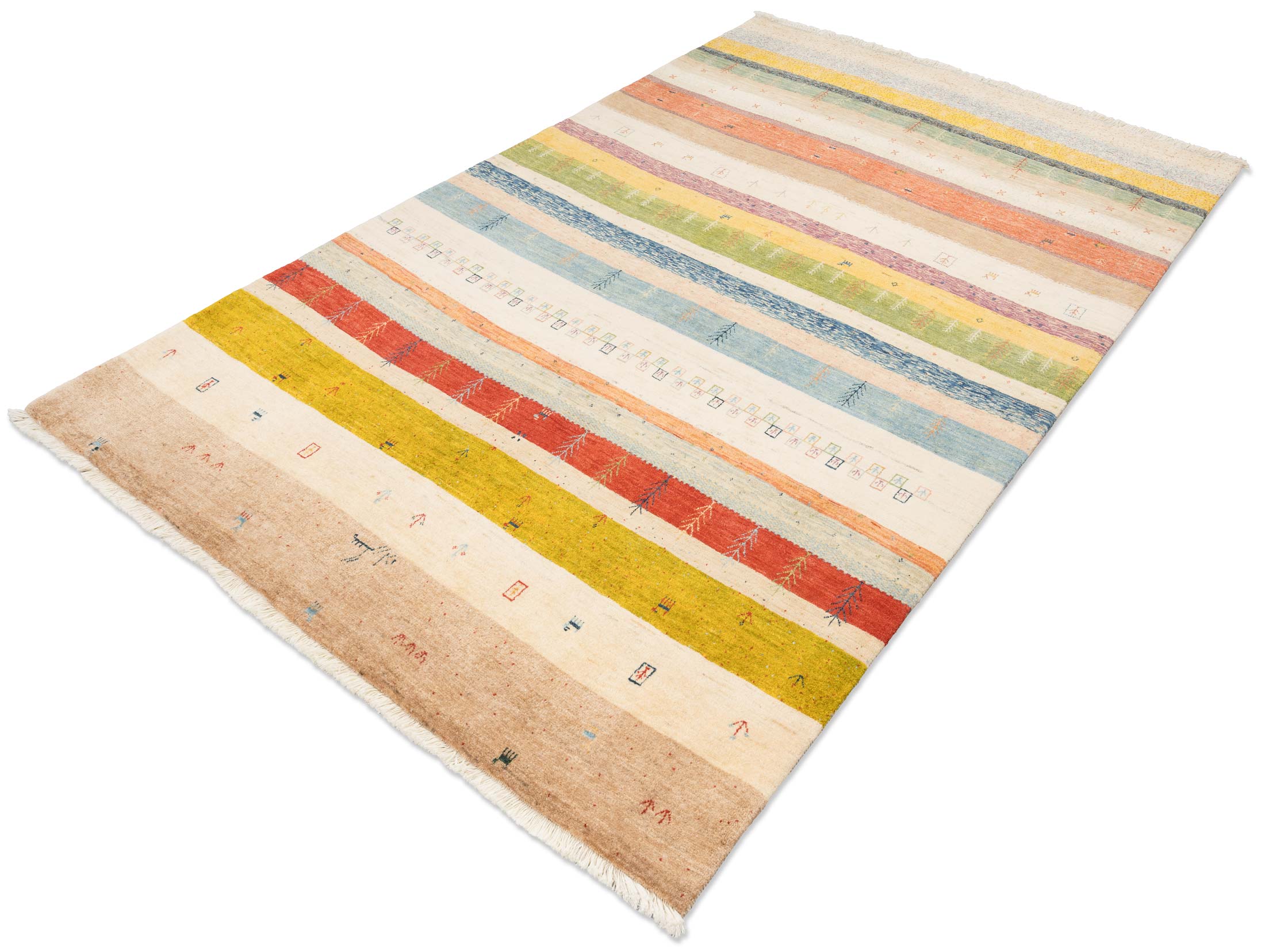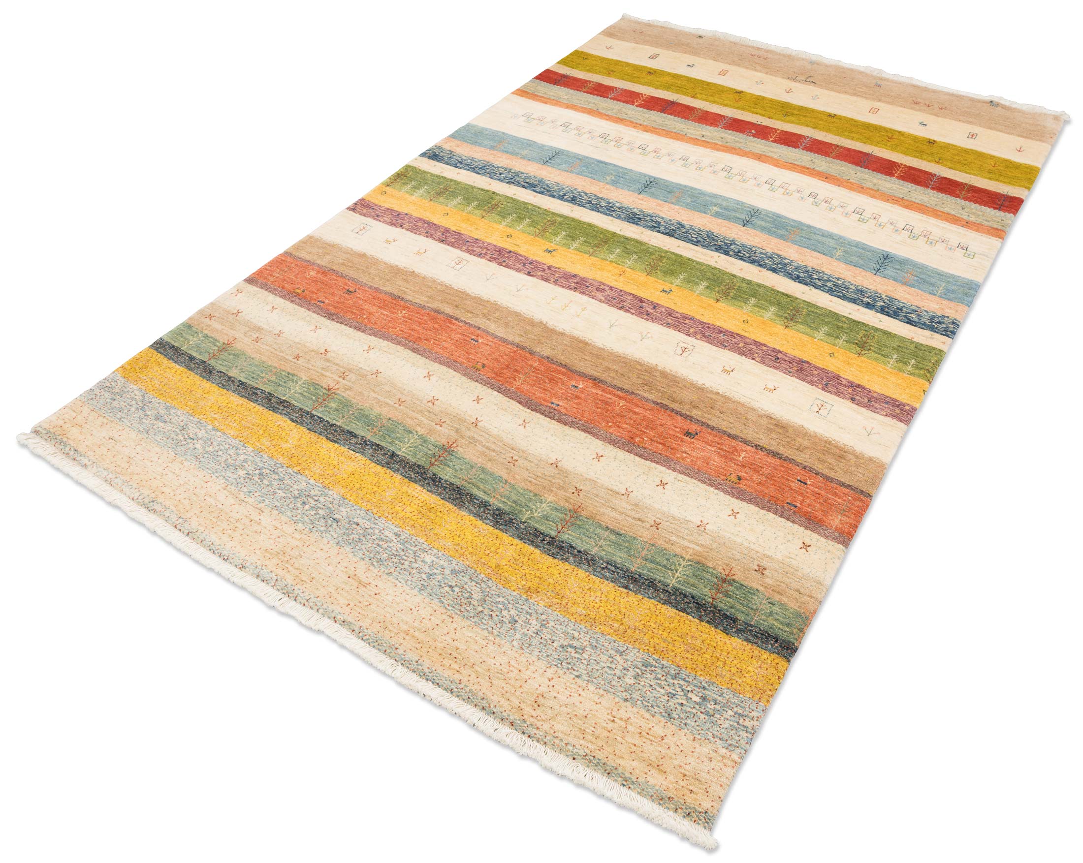 Dieser Teppich ist wie geschaffen für den Boho-Style, da dieser Einrichtungsstil das Unkonventionelle liebt und von einem lebendigen Mix aus Farben, Mustern und kulturellen Einflüssen lebt. Die bunten Streifen in Kombination mit den kleinen, verspielten Nomaden-Motiven unterstreichen den weltoffenen und künstlerischen Charakter, der für das „Bohemian Living“ essenziell ist. Durch die Verwendung von handversponnener Schafwolle und Naturfarben strahlt das Unikat genau jene authentische und entspannte Wärme aus, die ein gemütliches Boho-Zuhause ausmacht. Zudem bricht die freie, nicht nach strenger Vorlage gearbeitete Musterung die Normen auf und sorgt für den gewünschten individuellen Ausdruck von Freiheit und Kreativität.