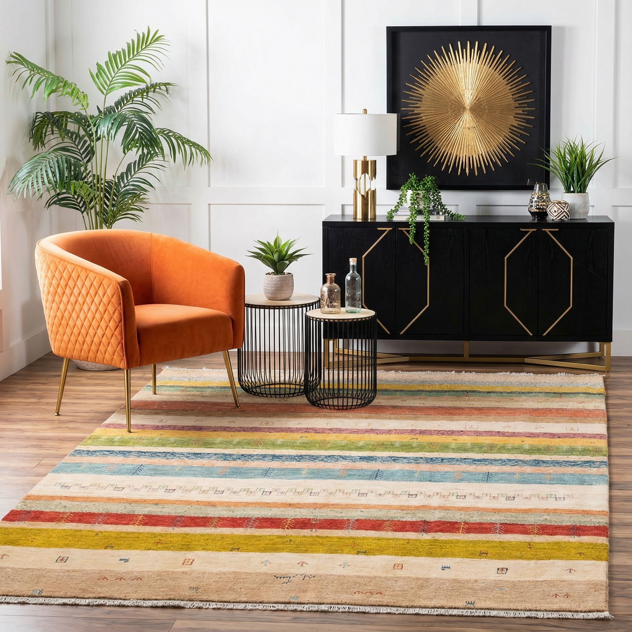 Dieser Teppich harmoniert wunderbar mit dem New-Country-Style, da er durch seine hochwertige Schurwolle und die warme, erdige Farbgebung genau die Behaglichkeit erzeugt, die ein modernes Landhaus ausstrahlt. Die im Text beschriebene extreme Strapazierfähigkeit und die dichte Knüpfung passen hervorragend zu dem Anspruch an langlebige, rustikale und bodenständige Materialien in diesem Wohnstil. Das gestreifte Design bringt eine gewisse moderne Frische und Ordnung in den Raum, während die traditionellen Motive die Brücke zum ländlichen und naturnahen Ursprung schlagen. In Kombination mit massiven Holzmöbeln und hellen Stoffen setzt das farbenfrohe, aber natürliche Unikat einen einladenden und gemütlichen Akzent.