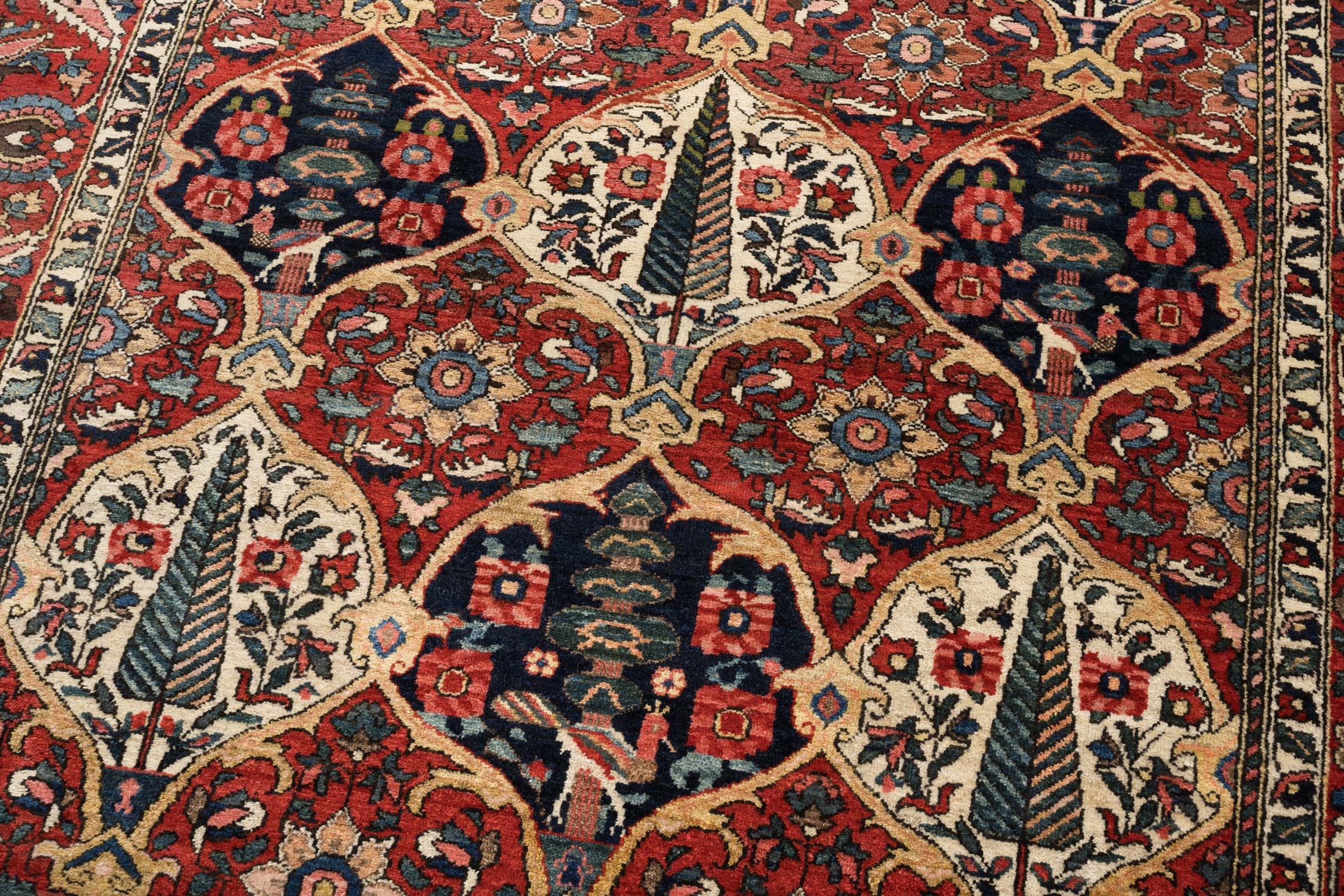 Der Garten ist ein dominanteste Muster beim Bachtiar. Eine oft verwendete Musterung sind rechteckige, zum Teil auch schachbrettartige, quadratische, rauten oder auch andersförmige aufgeteilte Felder. Dies verleiht dem Teppich eine gewisse Strenge. Es werden auch oft Medallions geknüpft, welche von weitern Medallions mit Blumen, Ranken, Ästen und Tieren umgeben sind. Neben dem Gartenmuster wird bei den höheren Bachtiar -Qualitäten großzügig ein Medaillon mit entsprechenden Eckzwickeln angelegt.