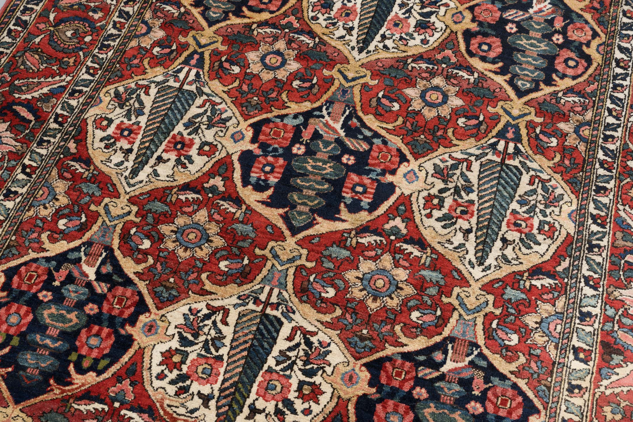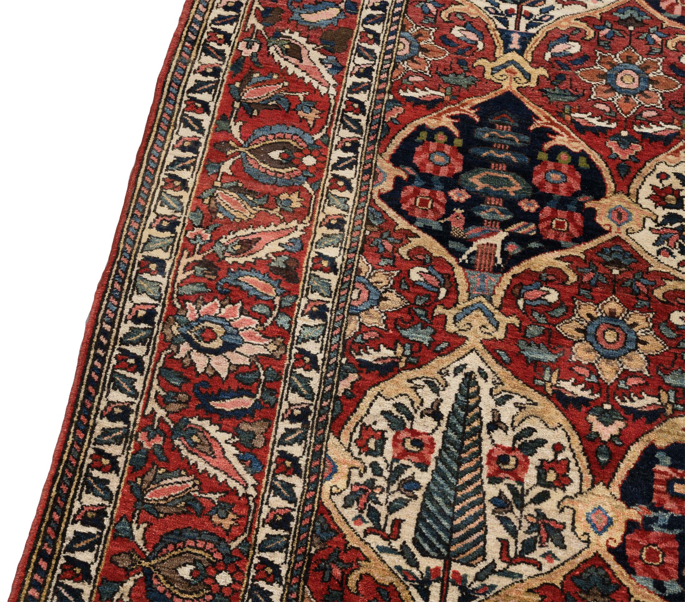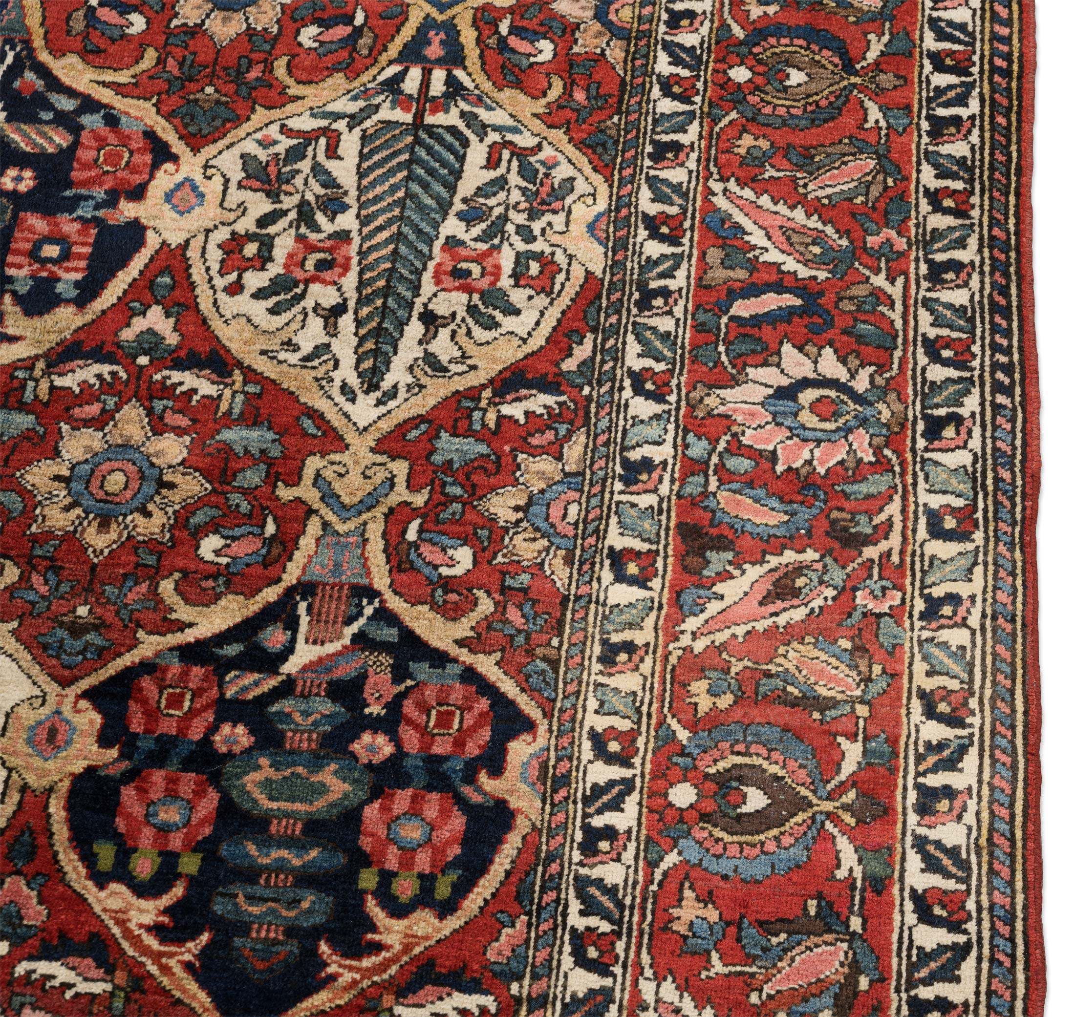 Hier präsentieren wir Ihnen einen handgeknüpften Bachtiar-Teppich aus Persien, der durch seine kräftige Hauptfarbe in einem satten Rot beeindruckt. Ergänzt wird dieses lebendige Rot durch ein tiefes Dunkelblau, warmes Beige und Akzente von Cremeweiß, die dem Teppich eine harmonische Balance verleihen. Die fein gearbeiteten Muster, bestehend aus floralen Motiven und geometrischen Elementen, zeugen von der hohen Kunstfertigkeit der Knüpfer.