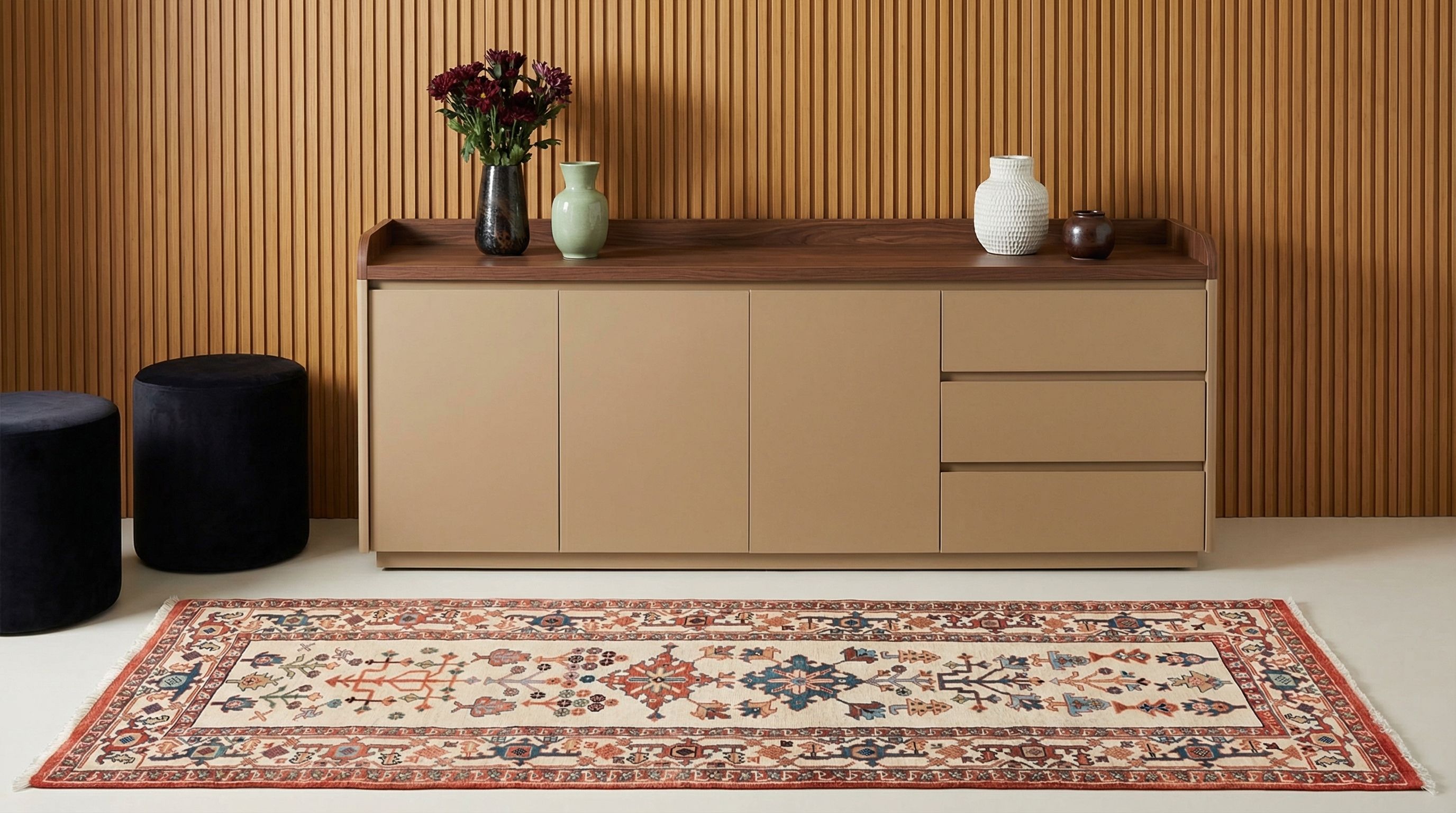Hier präsentieren wir einen exquisiten, handgeknüpften Ghadimi-Teppich aus dem Hause Mesgarzadeh. Die Hauptfarbe des Teppichs ist ein warmes Beige, das eine harmonische Basis schafft. Ergänzt wird es durch ein lebhaftes Rostrot, das den Rand und einige geometrische Muster akzentuiert. Ein tiefes Petrolblau bringt zusätzliche Tiefe und kontrastiert die warmen Töne, wodurch das Design lebendig wirkt.Die kunstvollen Muster sind inspiriert von traditionellen Heriz-, Serapi- und ...