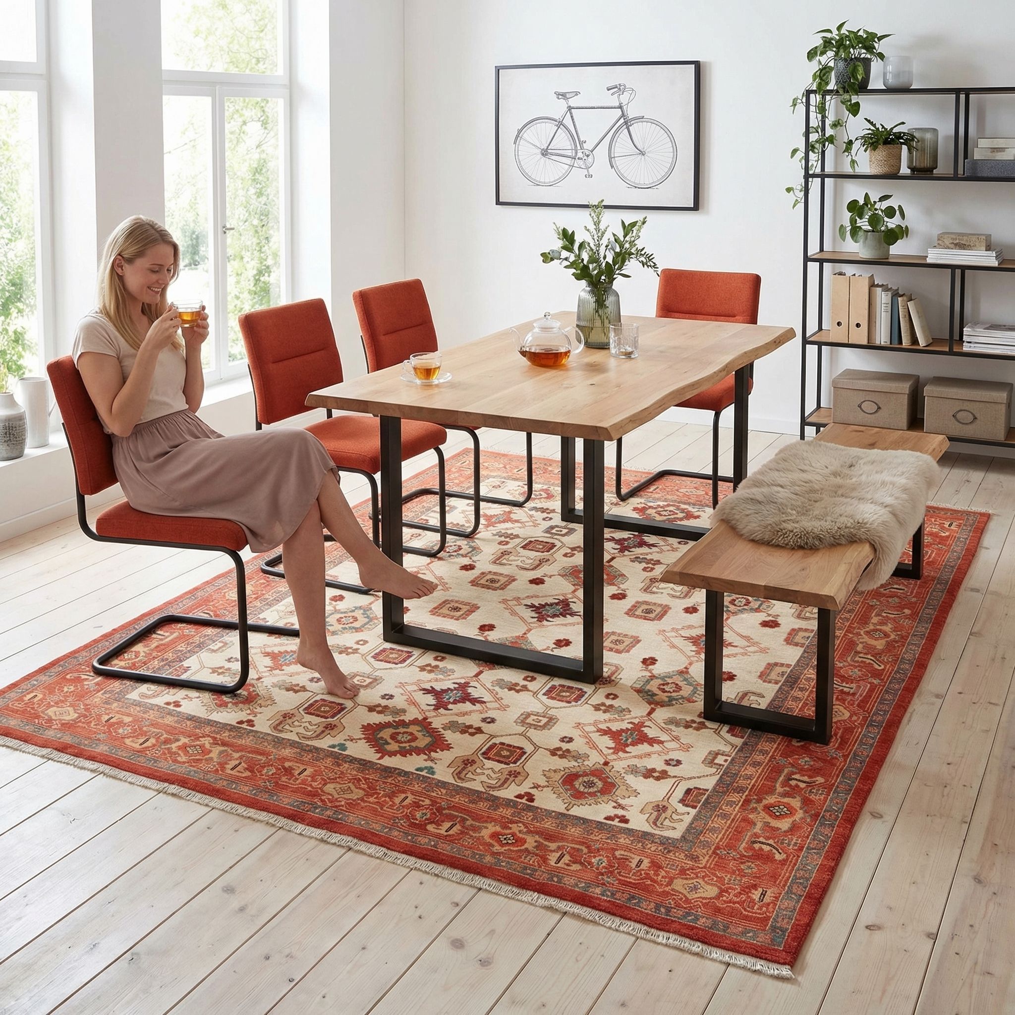 Auch im nordisch-klaren Scandinavian-Style findet dieser Teppich seinen Platz, da er mit seinem cremefarbenen Fond und den natürlichen Materialien das Bedürfnis nach „Hygge“ und Geborgenheit erfüllt. Er bringt genau das richtige Maß an Farbe und Muster in die sonst oft schlichte, weiße und holzbetonte Einrichtung, ohne die ruhige Grundstimmung zu stören. Die hochwertige, handversponnene Schafwolle harmoniert perfekt mit der skandinavischen Vorliebe für nachhaltige und langlebige Naturprodukte. So wird der Ghadimi zum gemütlichen Mittelpunkt des Raumes, der Wärme spendet und die kühle nordische Ästhetik mit einer einladenden, weichen Note abrundet.