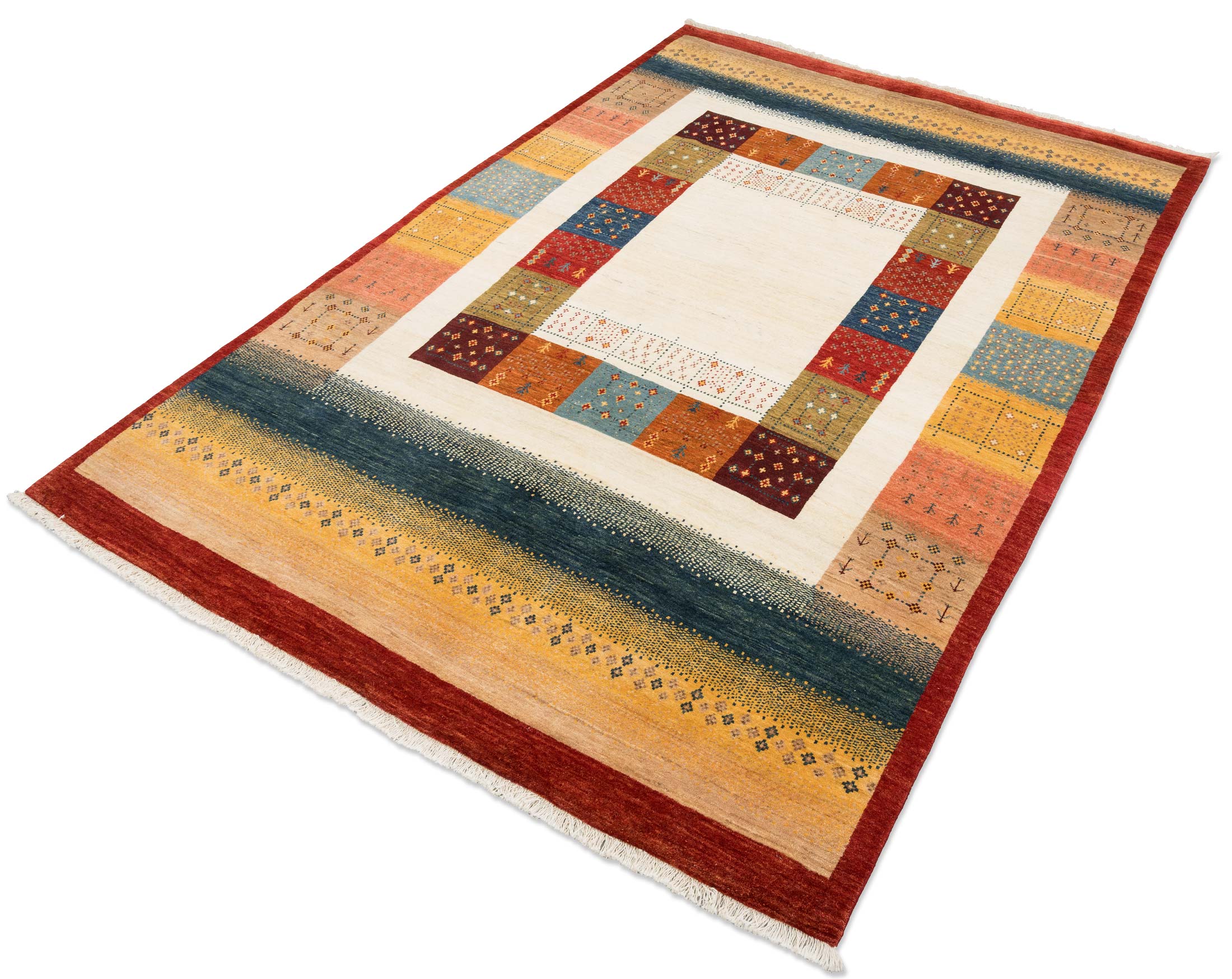 Dieser handgeknüpfte Bidjar-Novum Teppich aus Persien beeindruckt durch seine harmonische Farbkomposition. Die Hauptfarbe ist ein kräftiges Rot, das den Rand des Teppichs dominiert und ihm eine warme Ausstrahlung verleiht. Ergänzt wird das Rot durch ein zartes, helles Beige im Innenfeld, und ein tiefes Blau das in den zentralen Mustern hervorsticht, sowie ein lebhaftes Ocker, das für eine fröhliche Akzentuierung sorgt. Die Musterung ist eine moderne Interpretation traditioneller ...mehr Beschreibung