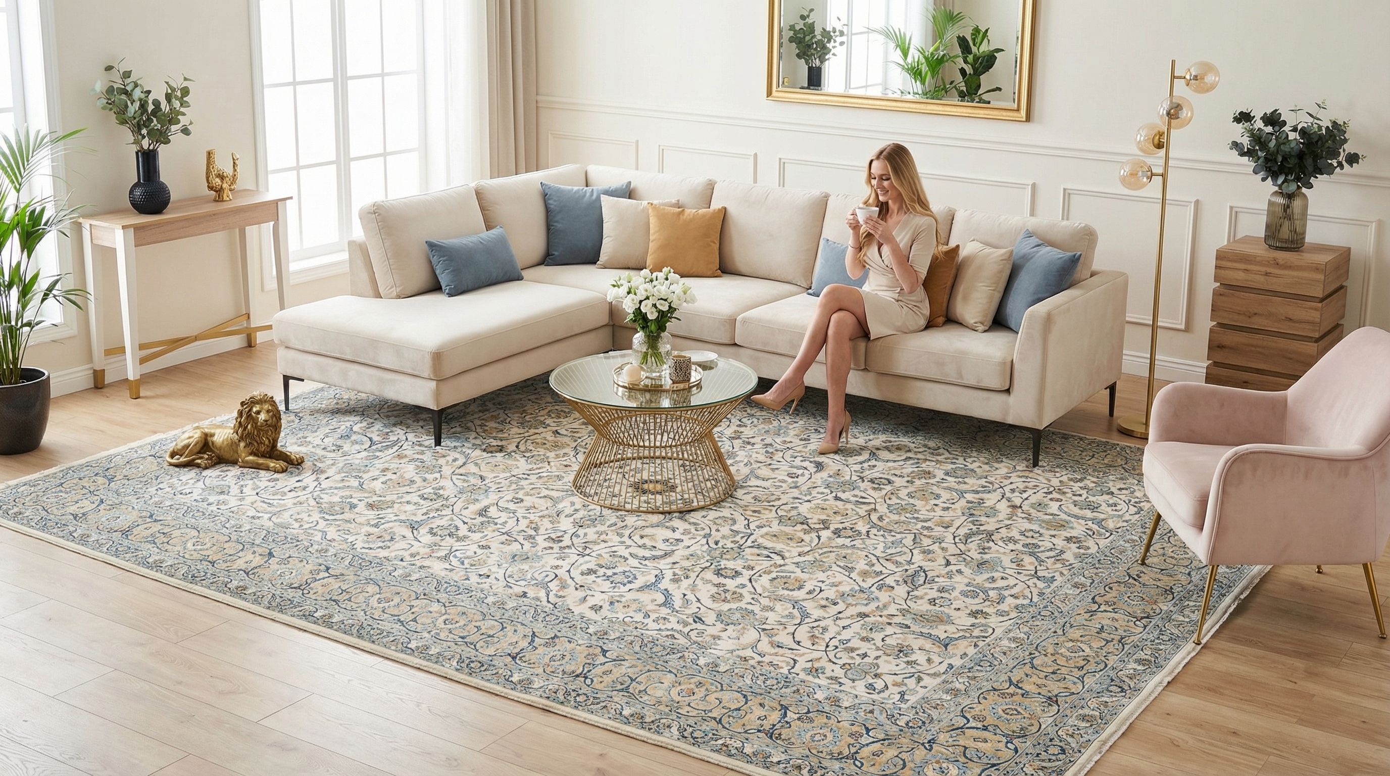 In einem zeitgenössischen Ambiente fungiert dieser antike bzw. klassische Teppich als gekonnter "Stilbruch", der die oft kühle Strenge moderner Möbel aufbricht und dem Raum Seele verleiht. Die zurückhaltenden Farben in Beige und Blau erlauben es, den Teppich mit minimalistischen Designermöbeln und klaren Linien zu kombinieren, ohne dass er unruhig wirkt. Gerade weil optisch ähnliche Teppiche oft in einfacher Qualität angeboten werden, sticht dieses feine Original als Ankerpunkt heraus, der Qualität und Beständigkeit in eine schnelllebige Zeit bringt. Er erdet den Raum und schafft eine Brücke zwischen der aktuellen Moderne und der jahrhundertealten iranischen Kunsthandwerkstradition.