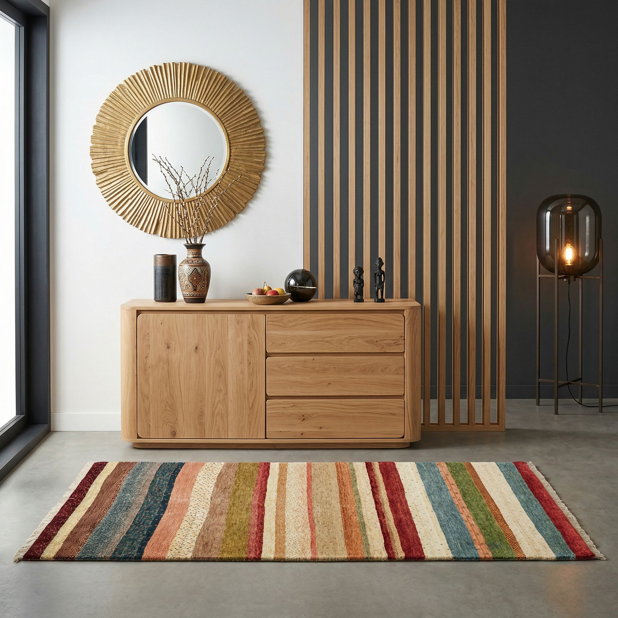 Die lebendigen, bunten Streifen und die sichtbare Struktur der handversponnenen Wolle passen perfekt zur kreativen und unkonventionellen Art des Boho-Styles. Die natürlichen Unregelmäßigkeiten im Farbverlauf (Abrash) unterstreichen den entspannten, "unperfekten" Look, der für dieses eklektische Wohnen essenziell ist. Er lässt sich hervorragend mit Rattanmöbeln, vielen Pflanzen und Kissen in unterschiedlichen Texturen kombinieren, um eine gemütliche Oase zu schaffen. Die warme Farbpalette des Teppichs sorgt sofort für eine positive Stimmung und lädt dazu ein, verschiedene Muster und Farben frei und künstlerisch zu mischen.