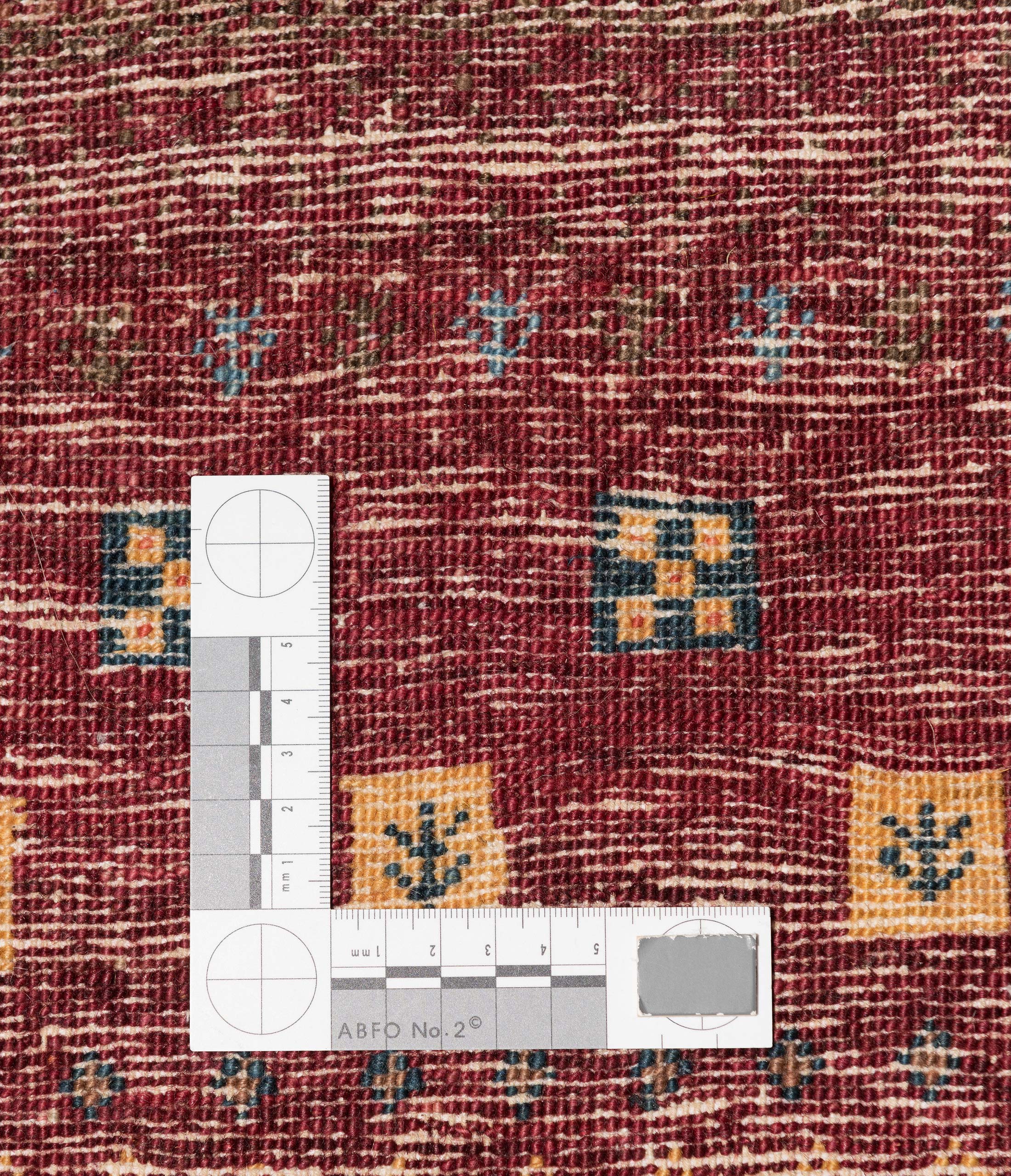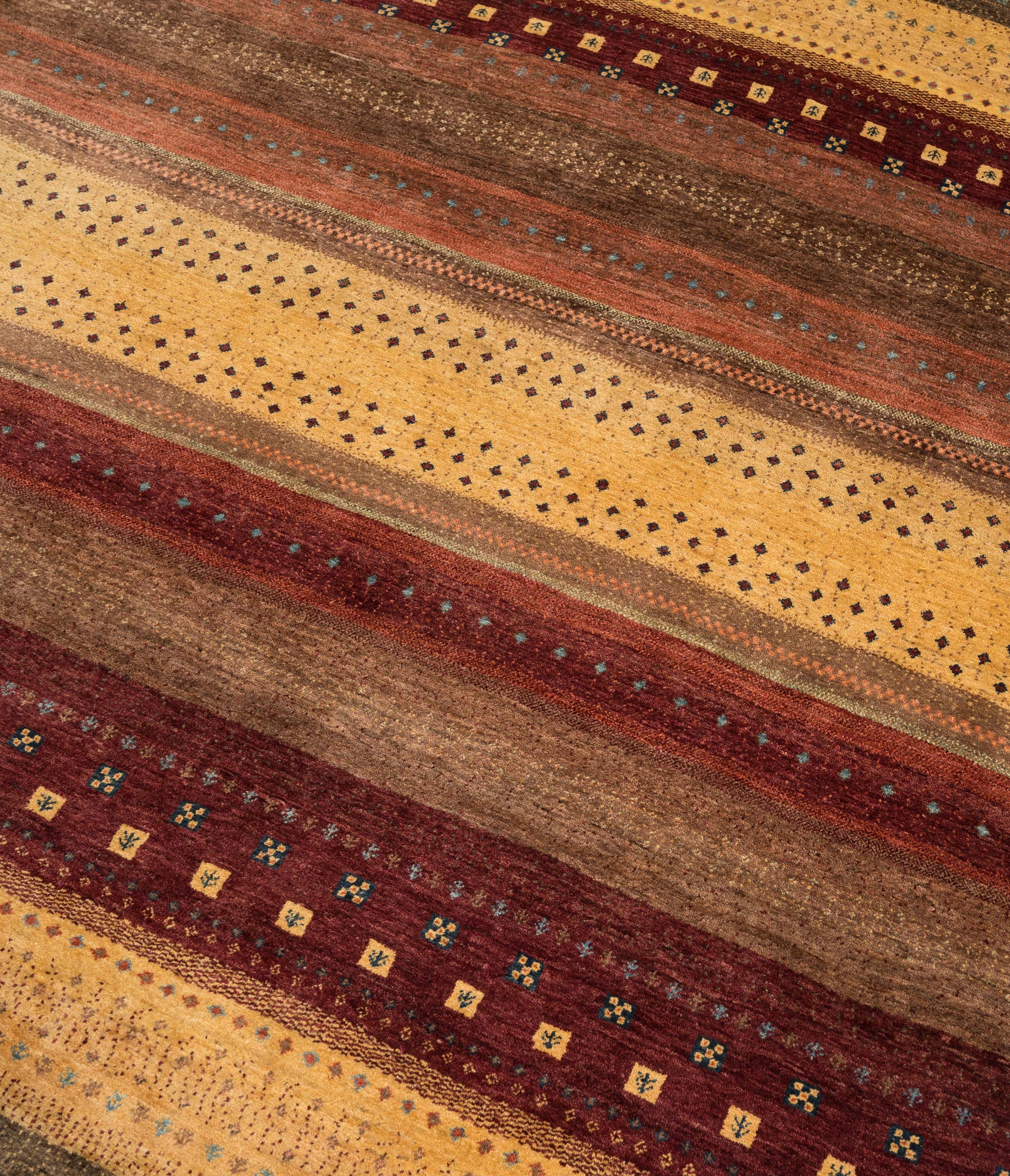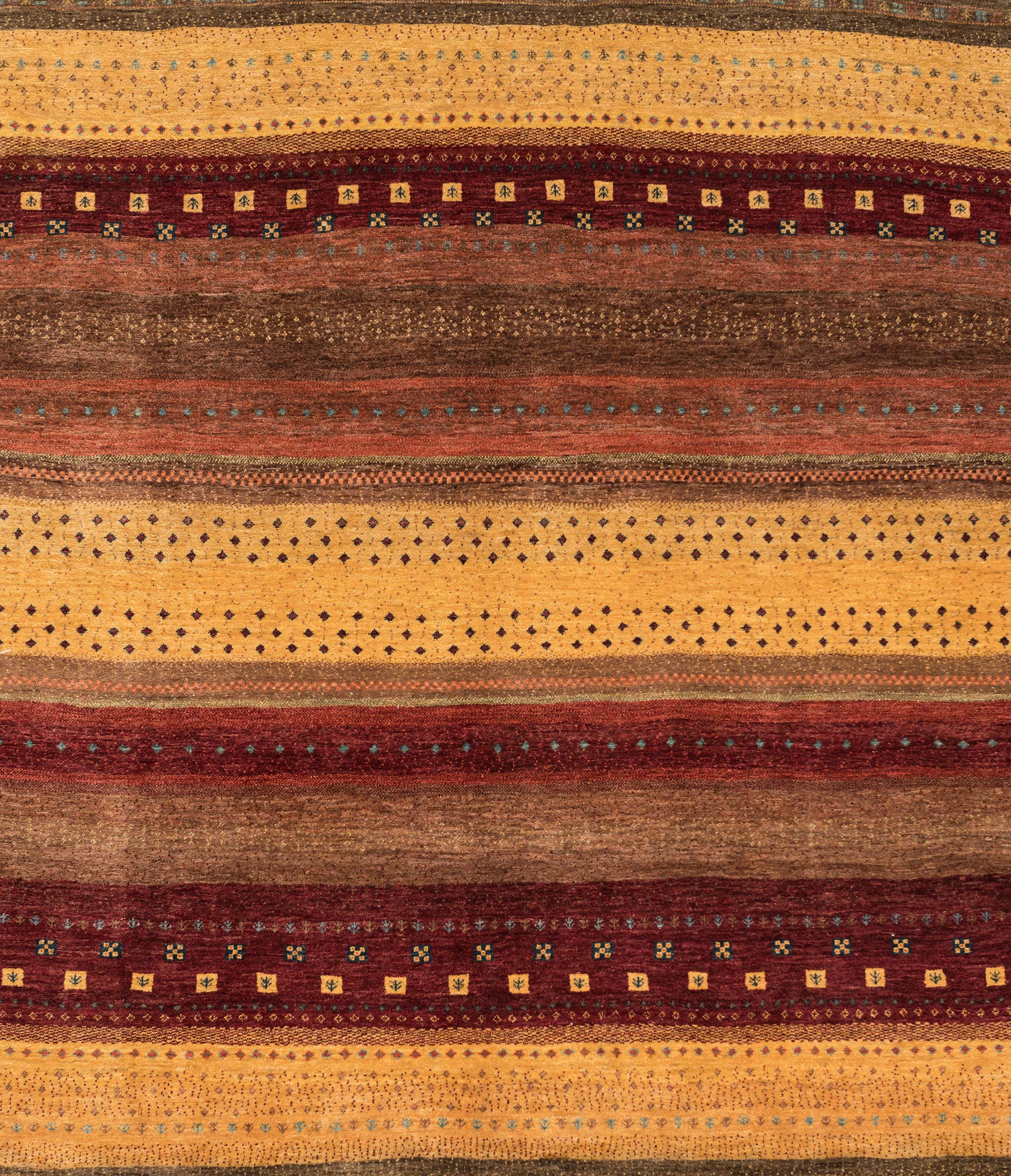Hier präsentieren wir Ihnen einen handgeknüpften Bidjar-Novum Teppich, ein authentisches Meisterwerk aus Persien. Die Hauptfarbe dieses Teppichs ist ein warmes Goldgelb, das eine einladende und strahlende Atmosphäre schafft. Dazu gesellen sich ein sattes Bordeauxrot und ein erdiges Braun, die dem Teppich Tiefe und Wärme verleihen. Die Musterung ist von traditionellen Nomadenmotiven inspiriert und zeigt eine harmonische Komposition aus geometrischen Formen, die in wiederholten Streifen angeordnet sind. Die Kombination dieser Farben und Muster verleiht dem Teppich eine lebendige und dennoch elegante Ausstrahlung.