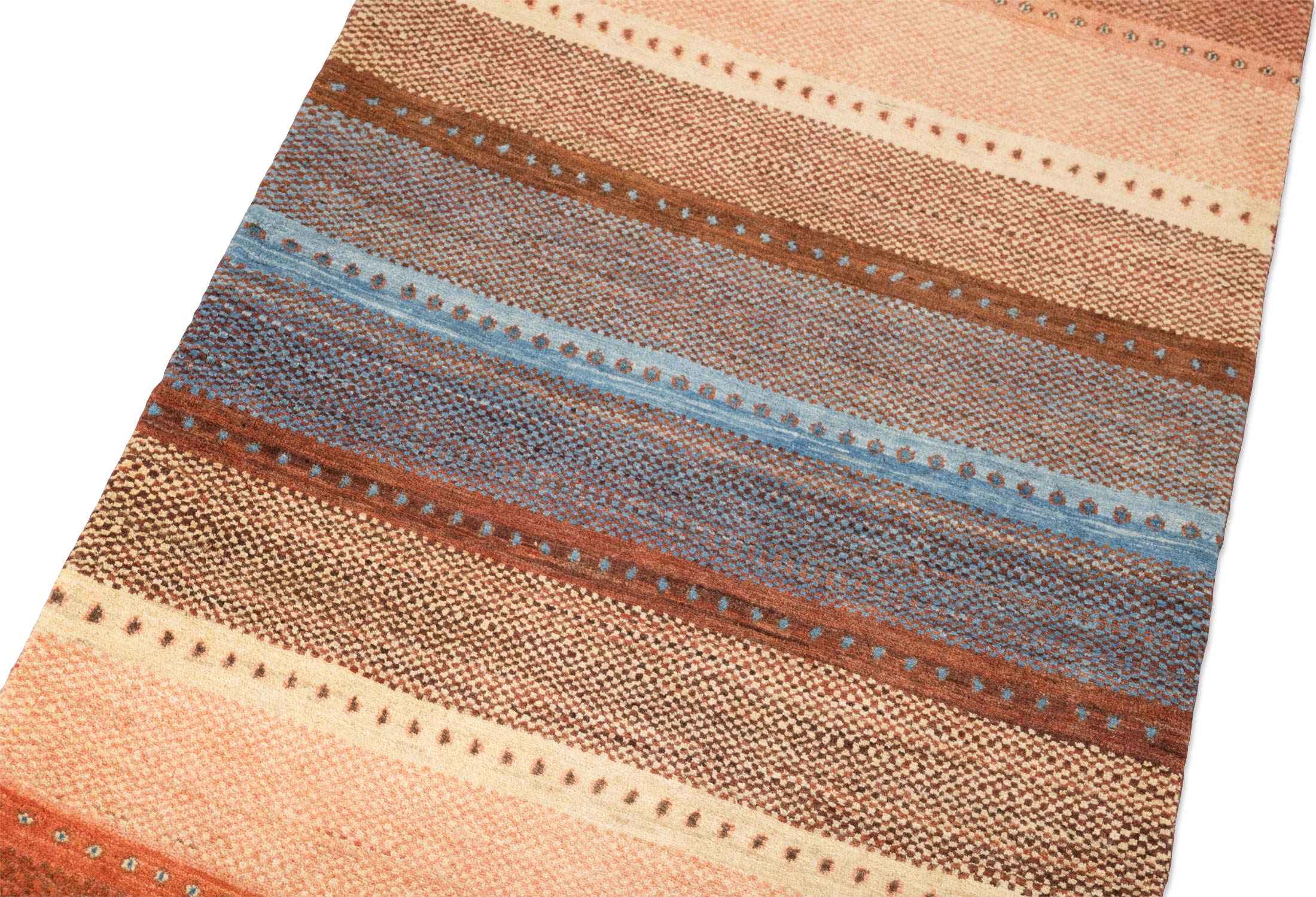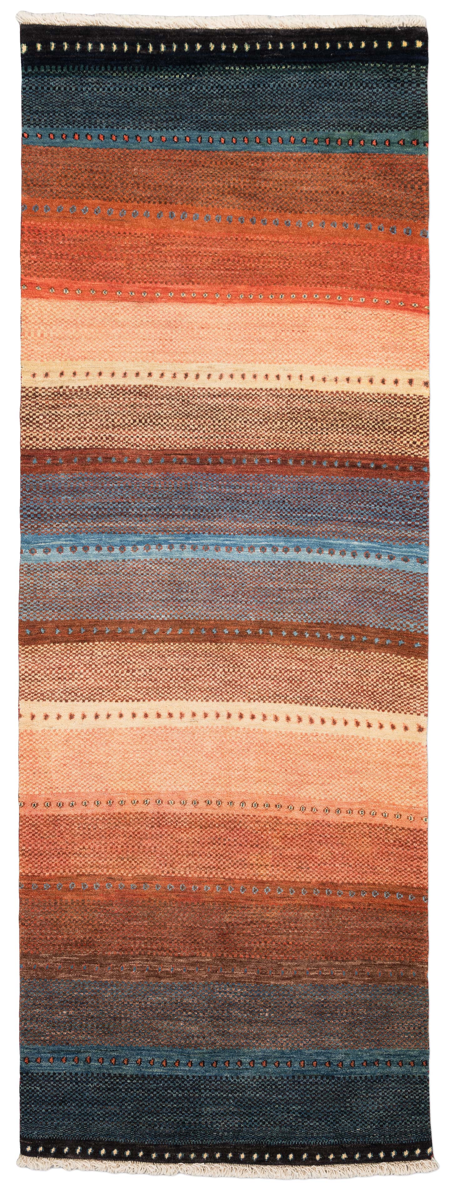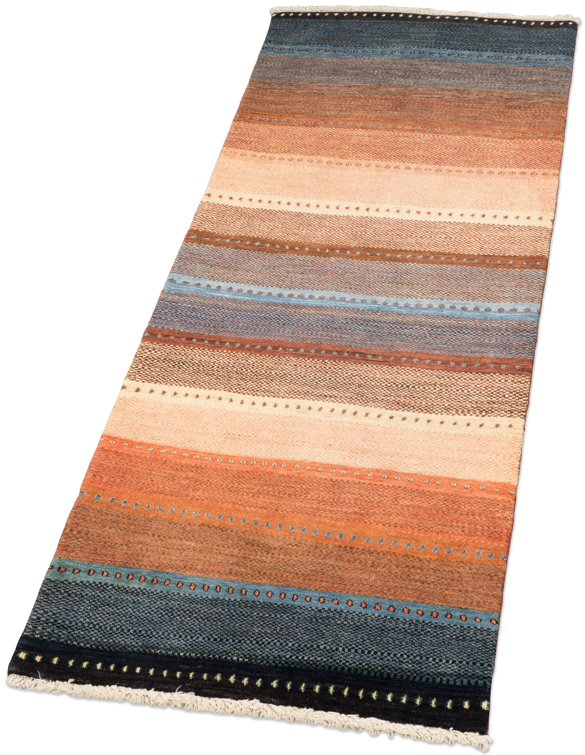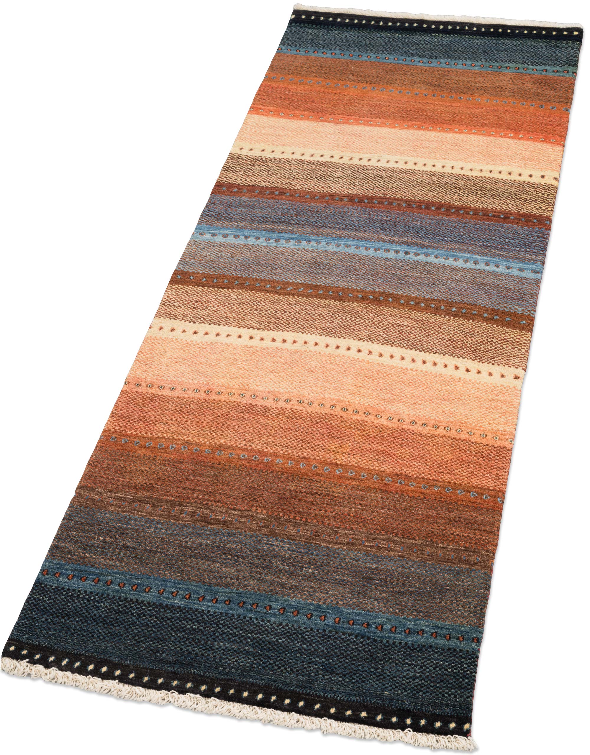 Dieser Bidjar-Novum Teppich besticht durch seine harmonische Farbpalette, die von einem kräftigen Blau dominiert wird. Daneben sind warme Rot- und Orangetöne sowie ein dezentes Beige prominent vertreten. Die Musterung ist durch horizontale Streifen geprägt, die durch kleine, punktartige Details aufgelockert werden.Diese handgeknüpfte Kreation aus dem persischen Kurdistan spiegelt den mystischen Musterschatz alter Nomadenvölker wider und kombiniert traditionelle Motive mit modernen ...