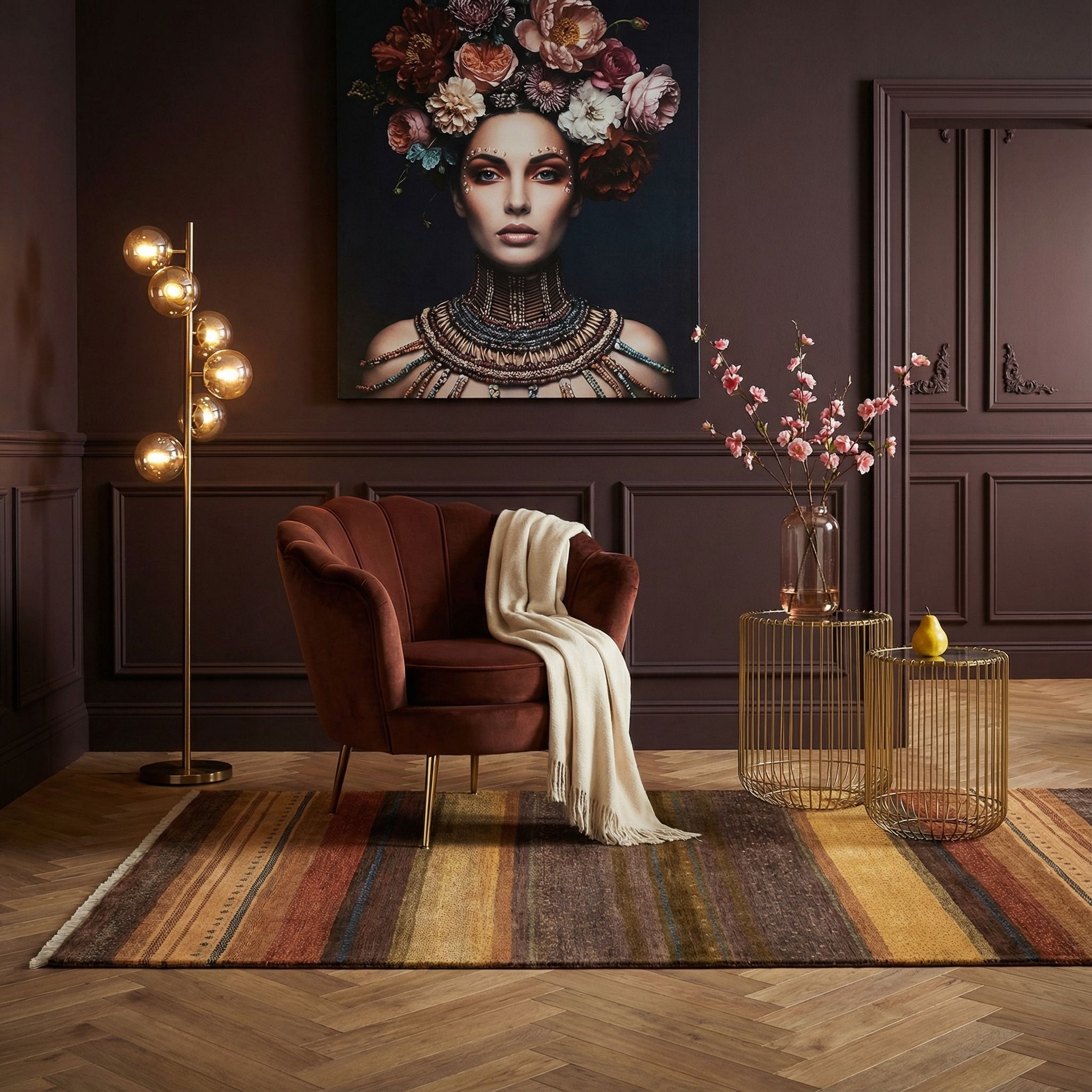 Der entspannte Boho-Look lebt von natürlichen Materialien und einem eklektischen Mix aus aller Welt, weshalb dieser handgeknüpfte Nomadenteppich mit seiner authentischen Herkunft perfekt ins Bild passt. Die warmen Erdtöne wie Terrakotta, Ocker und Braun sowie die lebendige Streifenoptik unterstreichen die gemütliche und unkonventionelle Atmosphäre dieses Wohnstils. Da der Teppich den mystischen Musterschatz persischer Stämme modern interpretiert, fügt er sich harmonisch in das kreative Zusammenspiel von vielen Kissen, Pflanzen und Rattanmöbeln ein. Zudem sorgt die hochwertige, handversponnene Schafwolle für genau jene haptische Wärme und Textur, die für das "Bohemian Living" essenziell ist.