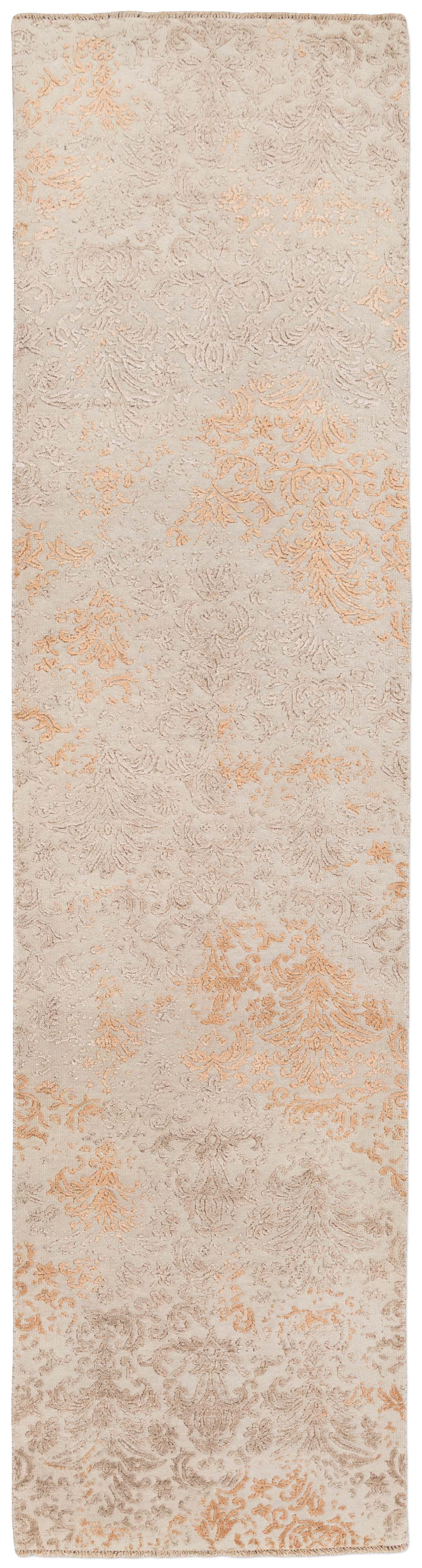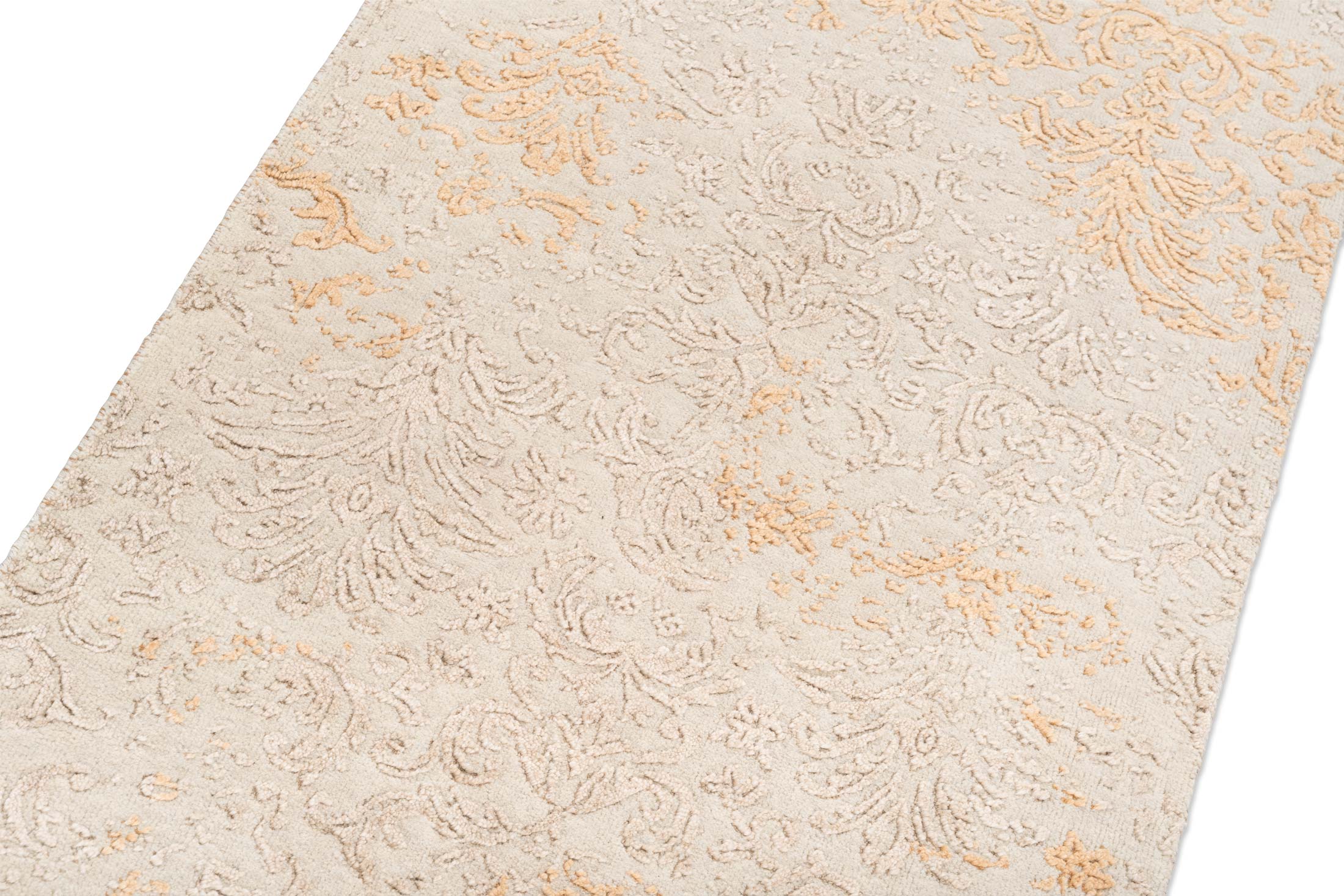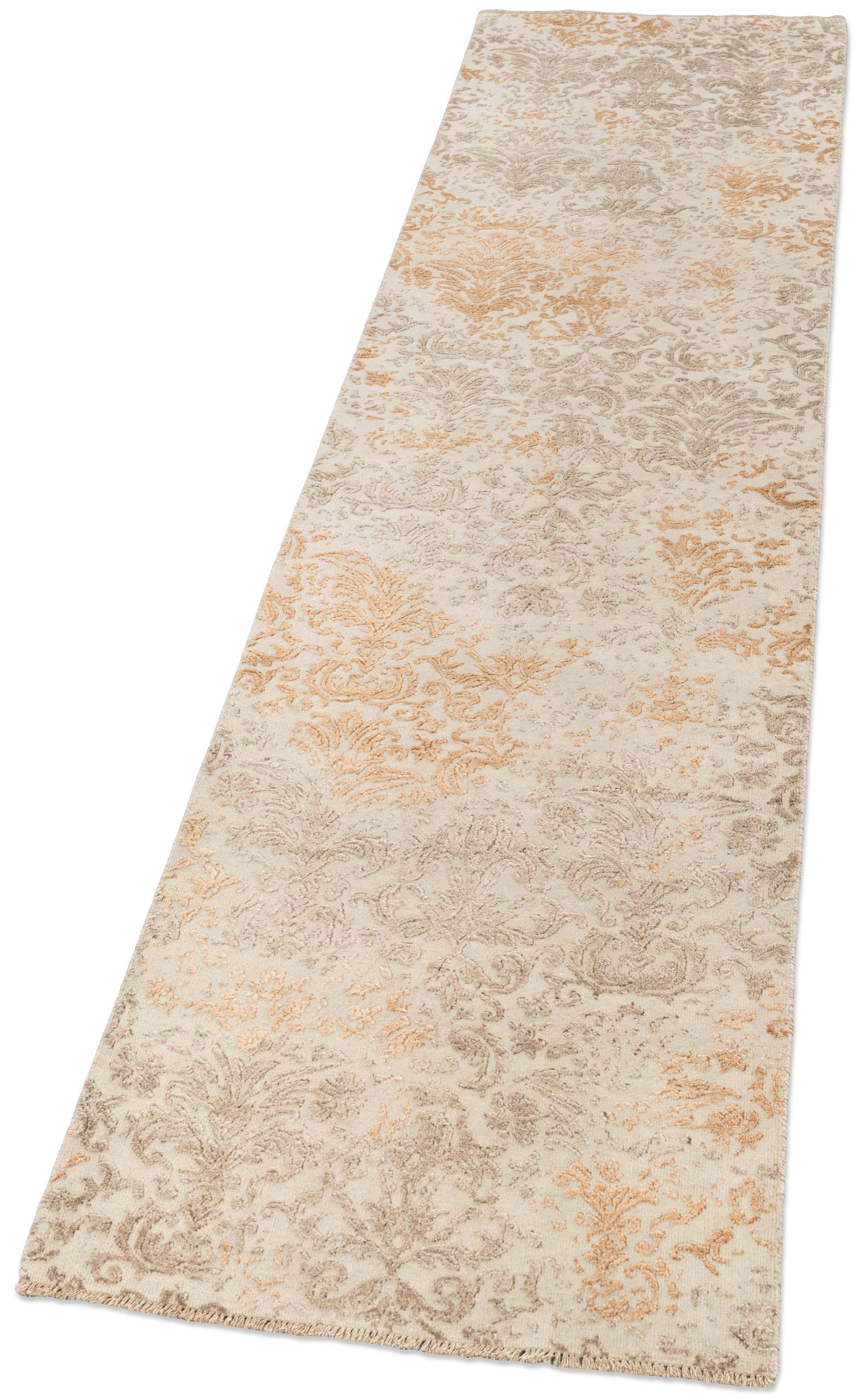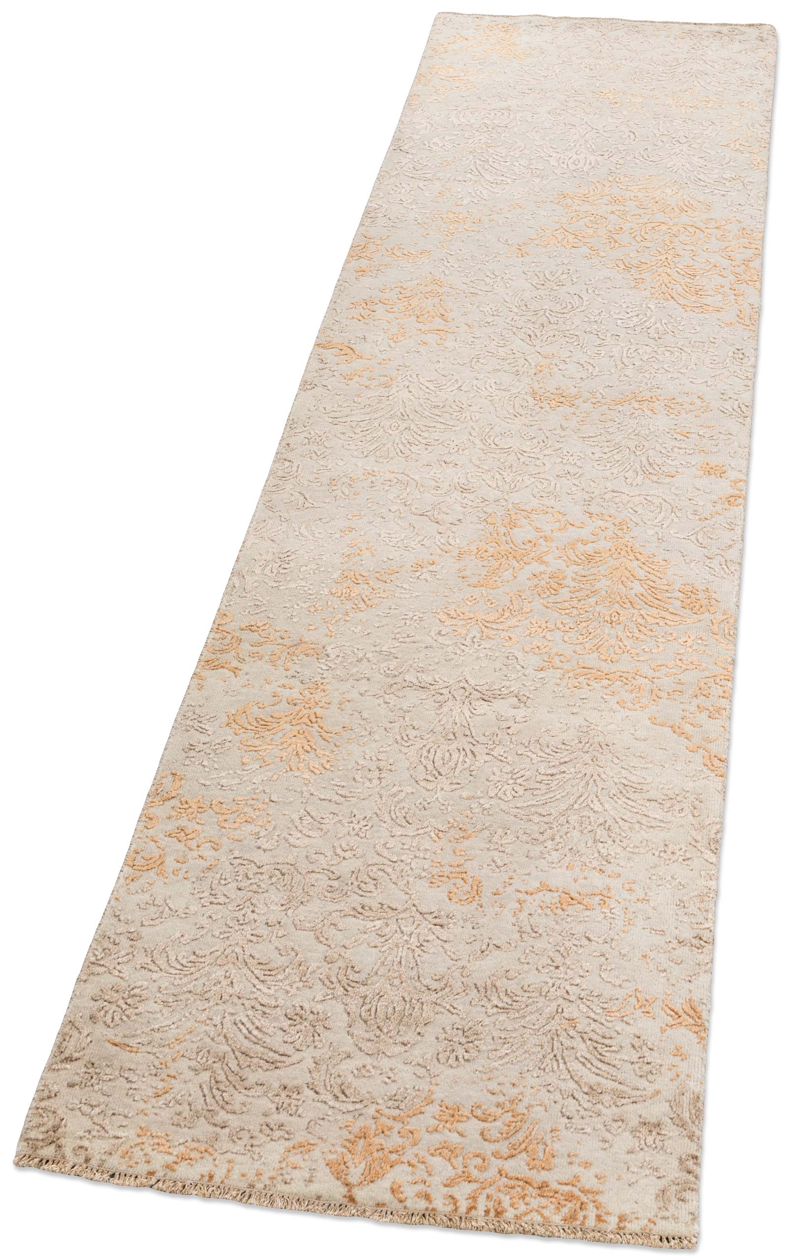 Dieser exquisite, handgeknüpfte Teppich aus Indien, bekannt als Eterno, präsentiert sich in einer Hauptfarbe von sanftem Beige. Die harmonisch abgestimmten Akzentfarben sind dezente Goldtöne und ein edles Creme, die dem Teppich eine warme und einladende Ausstrahlung verleihen. Das Design besticht durch ein florales Muster, das kunstvoll eingearbeitet wurde und durch den aufwendigen handgearbeiteten Reliefschnitt zusätzlich an Tiefe gewinnt.