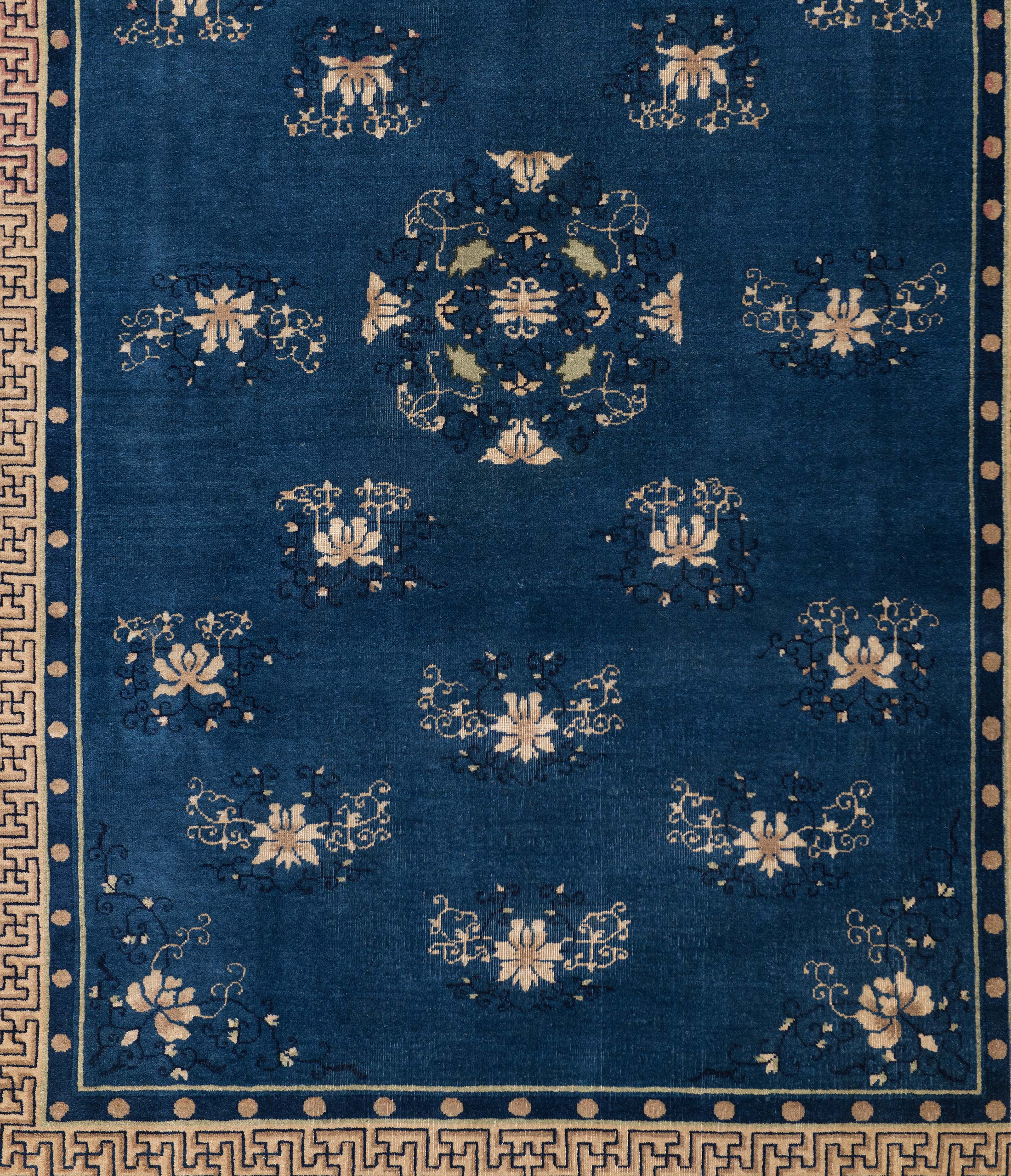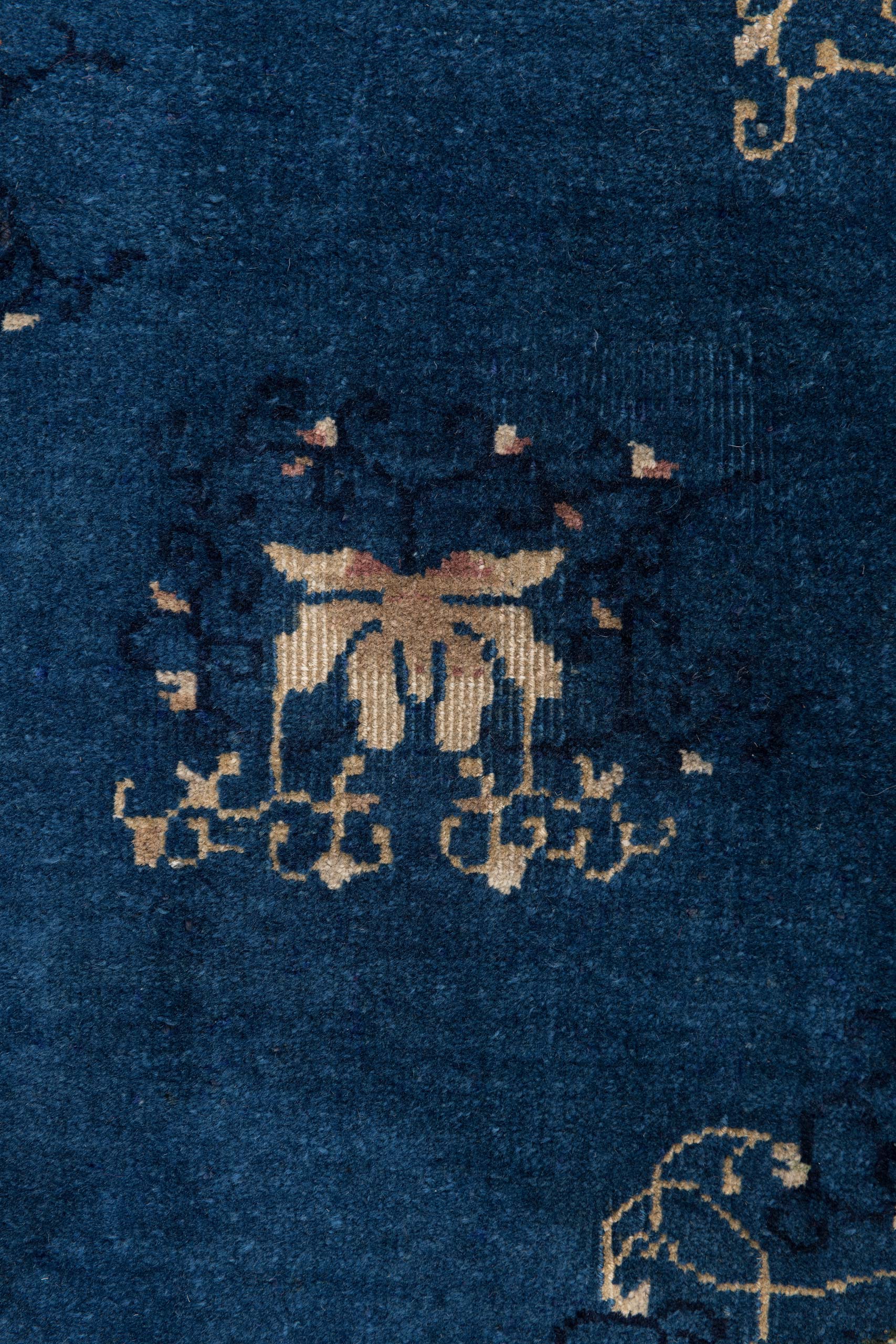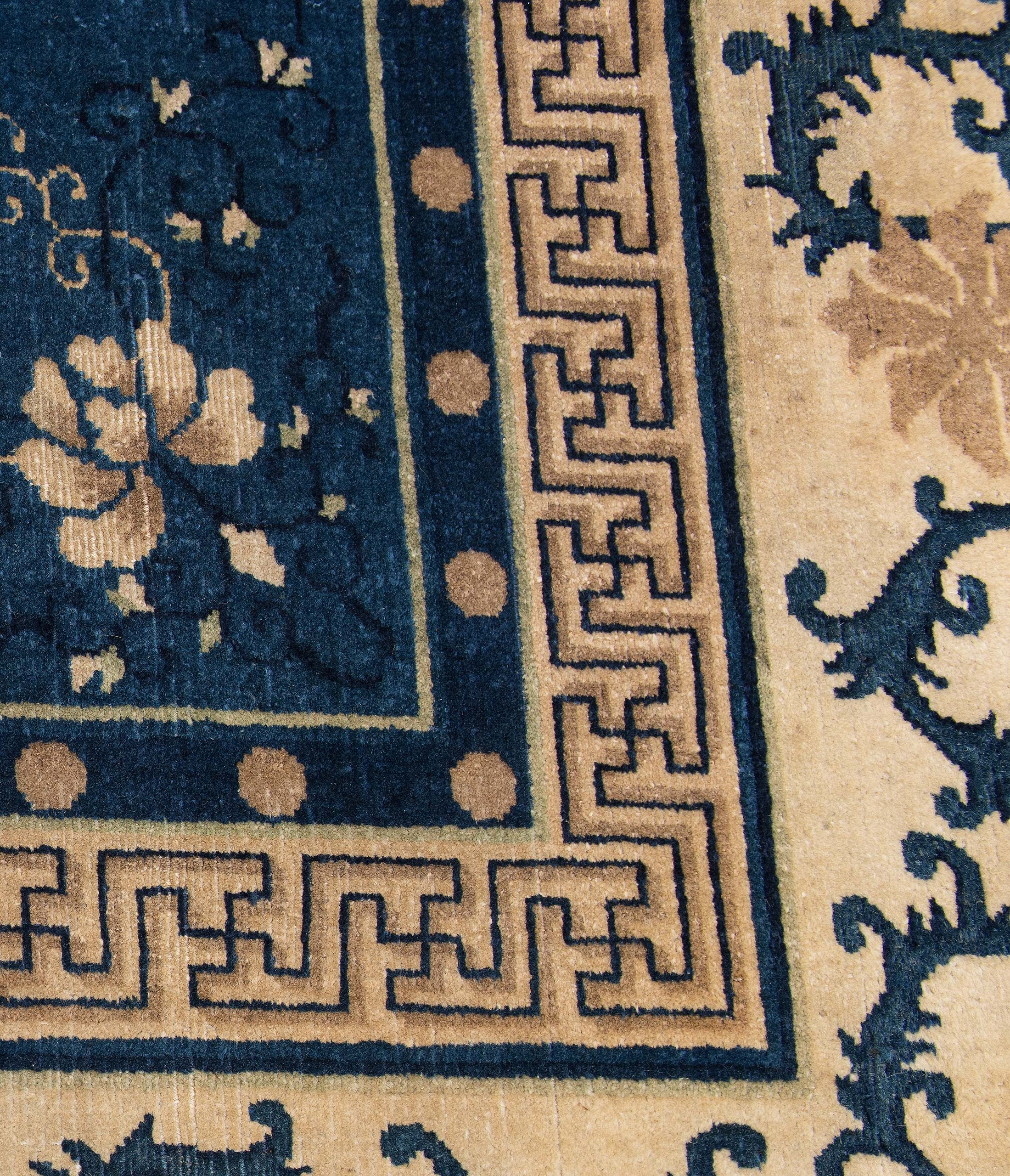 Dieser antike Peking-Teppich, um 1910 entstanden, strahlt eine harmonische Eleganz aus. Die Hauptfarbe ist ein tiefes Blau, das den Teppich in eine ruhige und zugleich majestätische Aura hüllt. Die kunstvollen floralen Muster und Ornamente sind in sanftem Beige gehalten, was im Zusammenspiel mit dem Blau eine zeitlose Schönheit erzeugt. Ergänzt wird die Farbpalette durch subtile Akzente in sanftem Rosa und einem dezenten, warmen Braun, die dem Teppich eine besondere Tiefe verleihen. Der Rand des Teppichs ist reich verziert und unterstreicht die detailreiche Handwerkskunst.