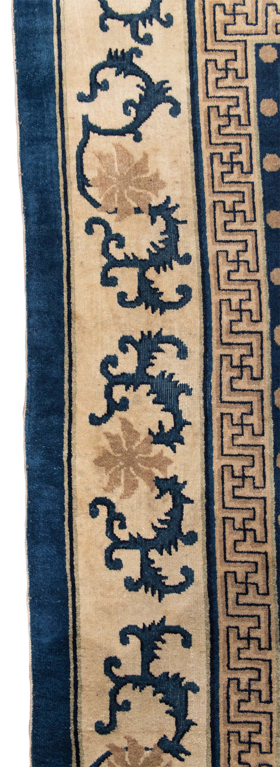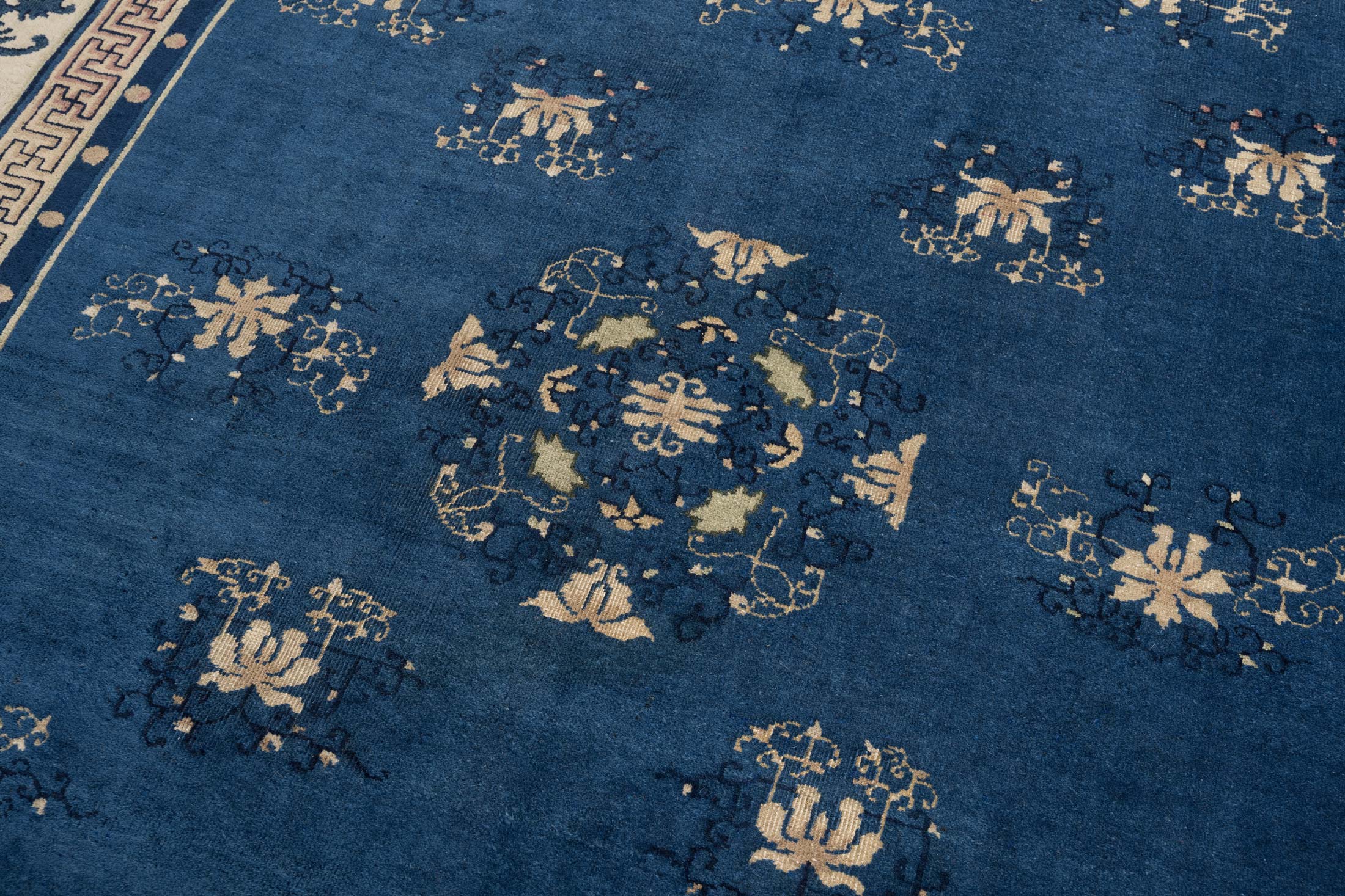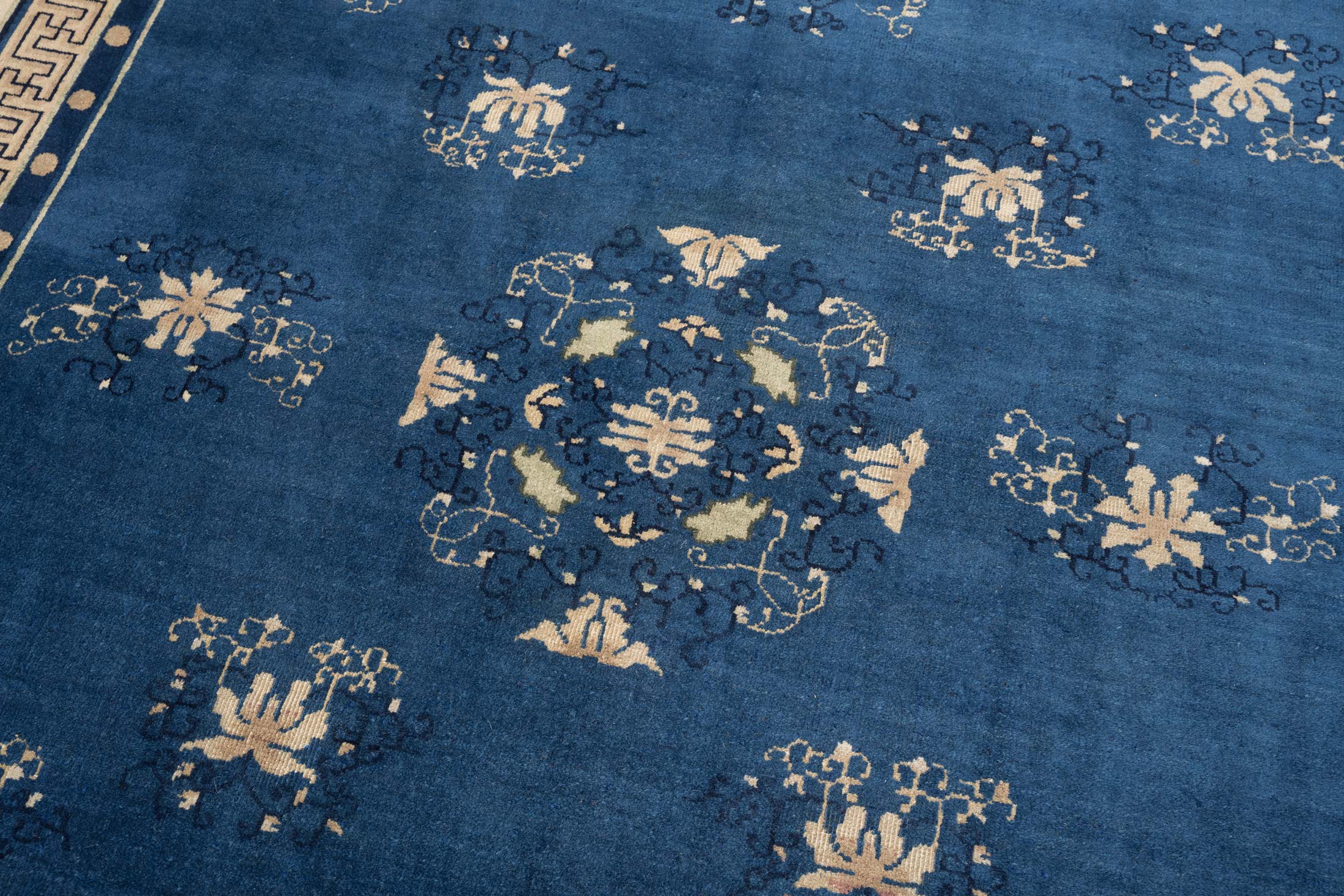 Dieser antike Peking-Teppich, um 1910 entstanden, strahlt eine harmonische Eleganz aus. Die Hauptfarbe ist ein tiefes Blau, das den Teppich in eine ruhige und zugleich majestätische Aura hüllt. Die kunstvollen floralen Muster und Ornamente sind in sanftem Beige gehalten, was im Zusammenspiel mit dem Blau eine zeitlose Schönheit erzeugt. Ergänzt wird die Farbpalette durch subtile Akzente in sanftem Rosa und einem dezenten, warmen Braun, die dem Teppich eine besondere Tiefe verleihen. Der Rand des Teppichs ist reich verziert und unterstreicht die detailreiche Handwerkskunst.
