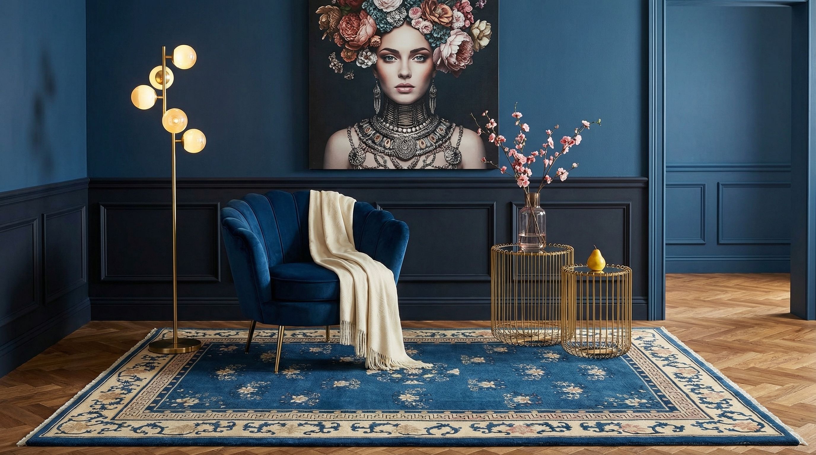 In einem kühlen Loft oder einer Umgebung aus Beton und Stahl wirkt dieser antike Peking-Teppich als luxuriöser Weichzeichner und sorgt für einen spektakulären Kontrast. Die Gebrauchsspuren und der dünne Flor korrespondieren auf faszinierende Weise mit der rauen Ästhetik von unverputzten Wänden oder Metallmöbeln, da beide Stile das Unverfälschte schätzen. Das edle Blau setzt einen kraftvollen Farbakzent, der die oft monochrome Palette des Industrial-Styles durchbricht, ohne dabei kitschig zu wirken. Mit diesem Stück chinesischer Kunstgeschichte beweisen Sie Mut zum Eklektizismus und verbinden raues Industrie-Flair mit der zeitlosen Eleganz asiatischer Handwerkskunst.