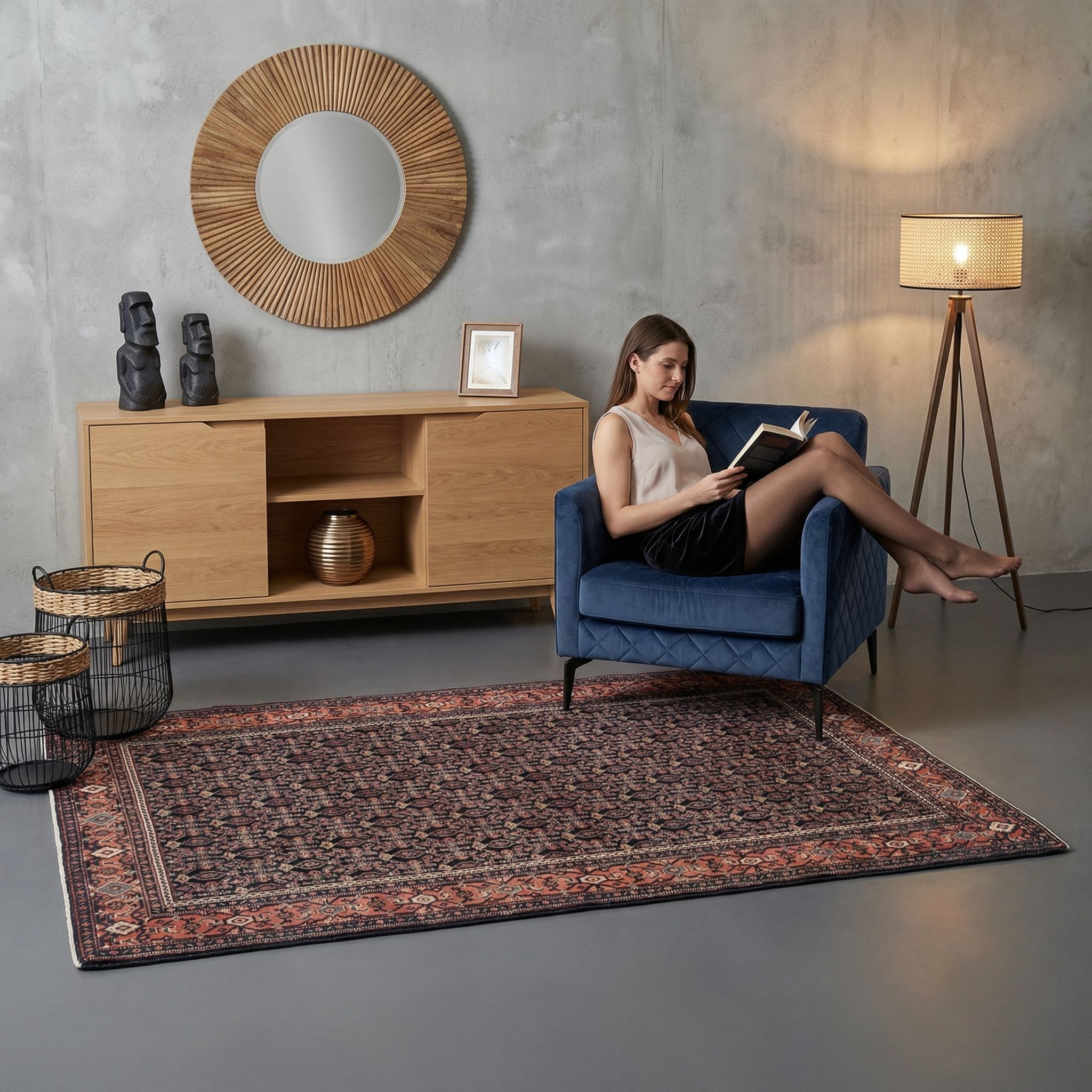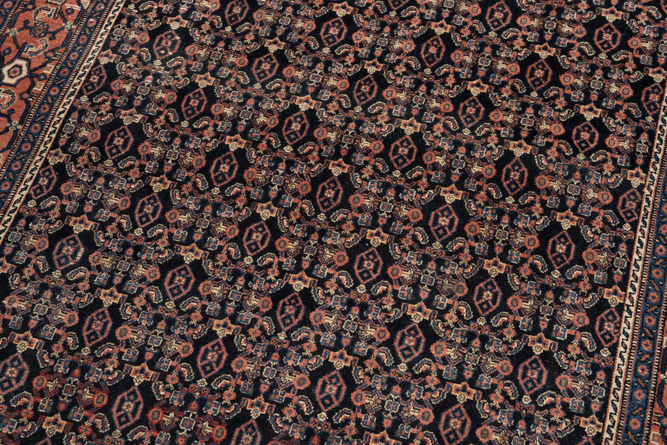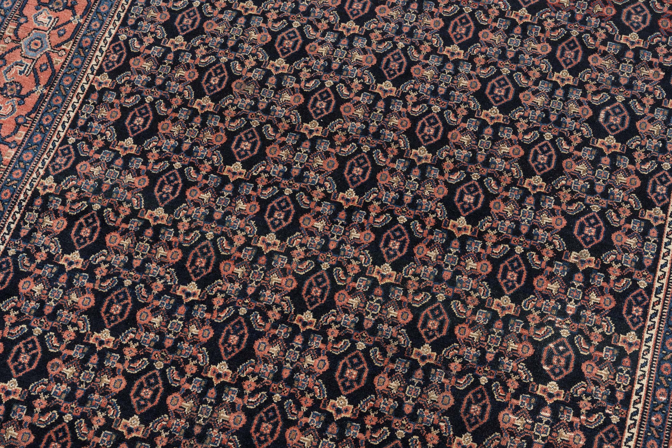 Dieser antike Senneh-Teppich aus Persien, handgeknüpft um 1920, begeistert mit seiner harmonischen Farbpalette und feinen Musterung. Die Hauptfarbe ist ein tiefes Mitternachtsblau, das dem Teppich eine elegante Grundlage bietet. Dazu gesellen sich ein warmes Rostrot und ein sanftes Cremeweiß, die zusammen ein ausgewogenes Bild schaffen. Ergänzt wird das Ensemble durch Akzente in Grau und helleren Blautönen, die dem Teppich einen lebendigen und dennoch klassischen Charakter verleihen.Die ...