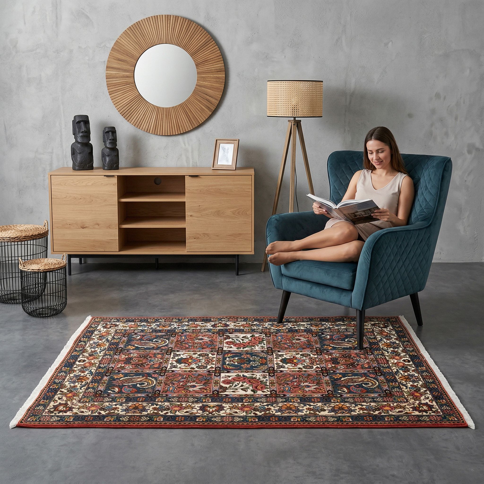 In einem kühlen Loft-Ambiente mit Beton, Stahl und offenem Mauerwerk wirkt dieser feingeknüpfte Teppich als spektakulärer und wärmender Stilbruch. Die geometrische Strenge der schachbrettartigen Felder greift die architektonischen Linien des Industrial-Designs auf, während die satten Farben einen vitalen Kontrast zur oft monochromen Umgebung bilden. Mit seiner hohen Knotendichte von ca. 190.000 Knoten pro Quadratmeter bietet er eine haptische Weichheit, die die Härte des industriellen Raumes wohnlich abmildert. Ein solches Vintage-Stück aus der Mitte des letzten Jahrhunderts verleiht einem modernen Fabrik-Look erst die nötige Seele und Geschichte.