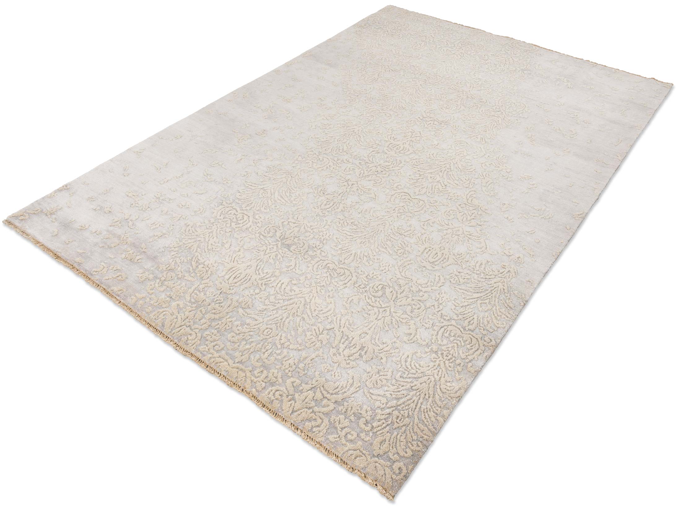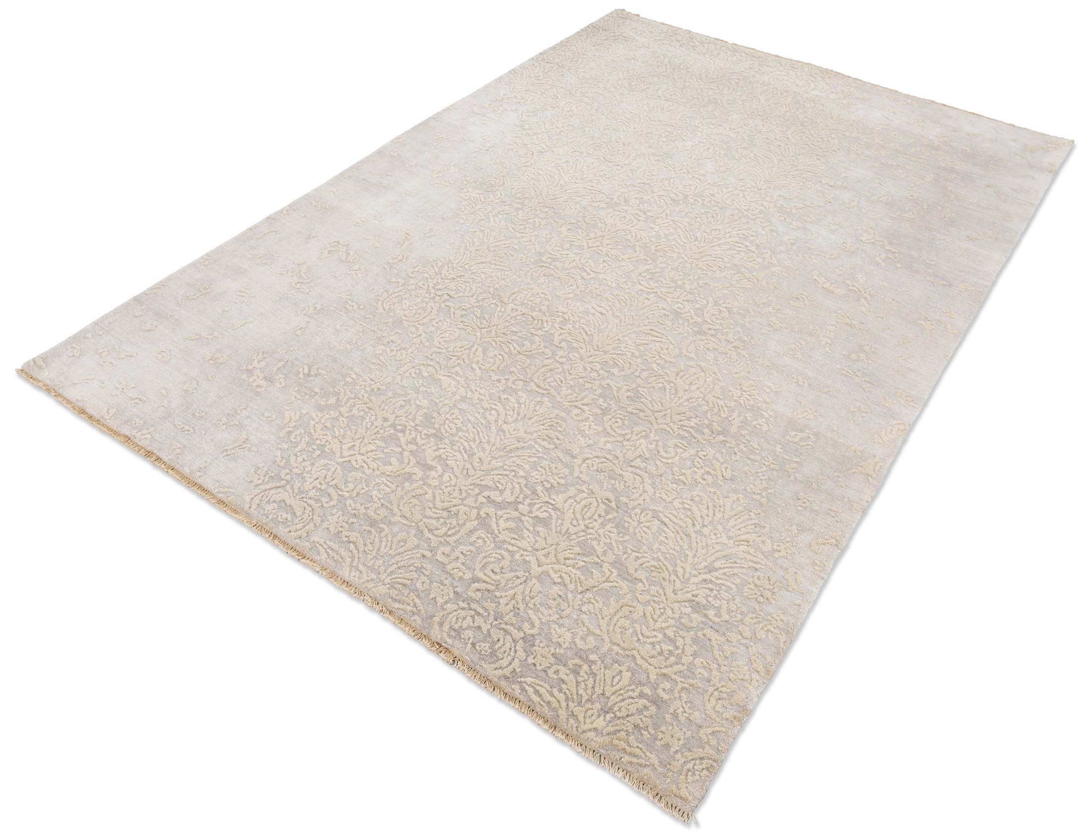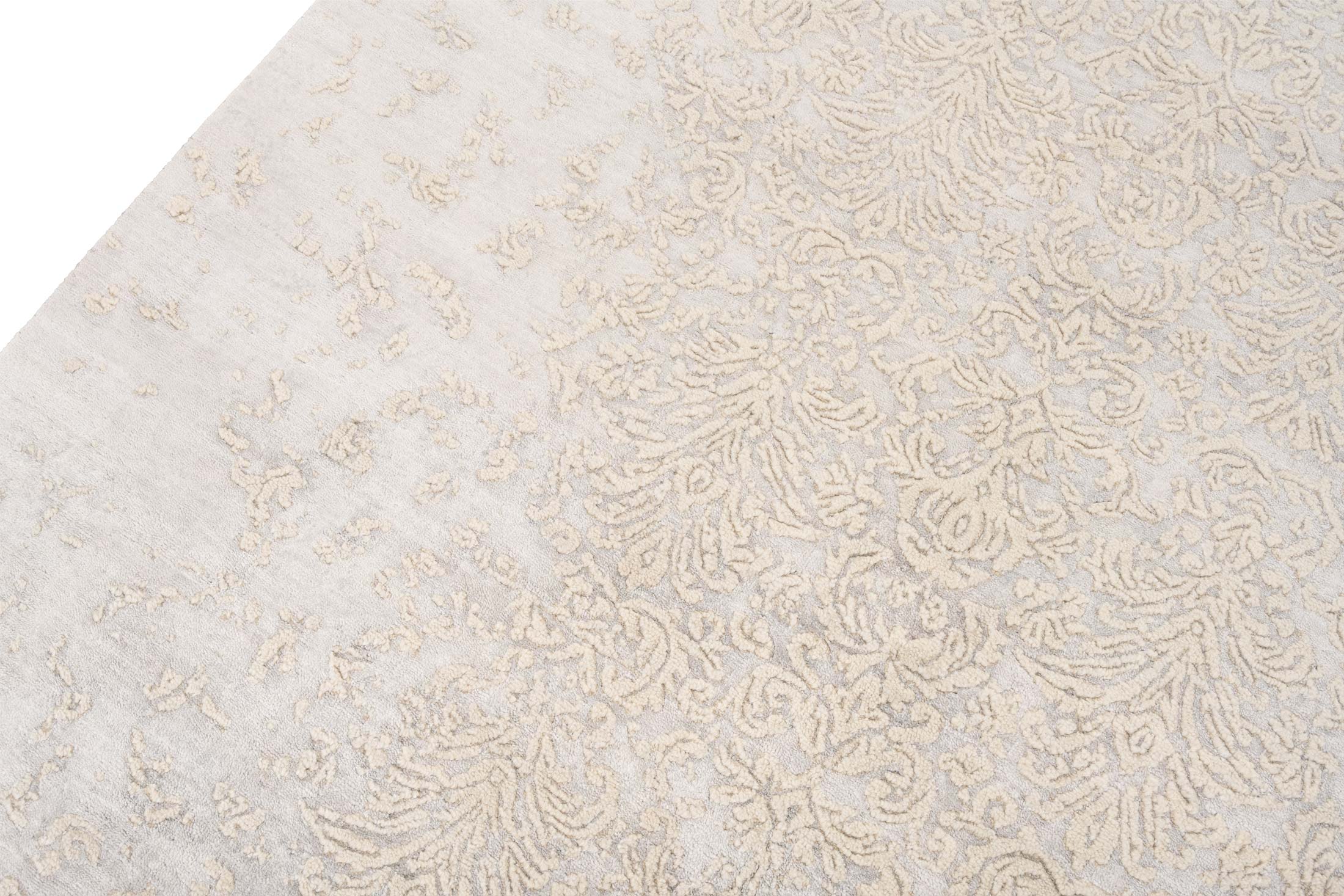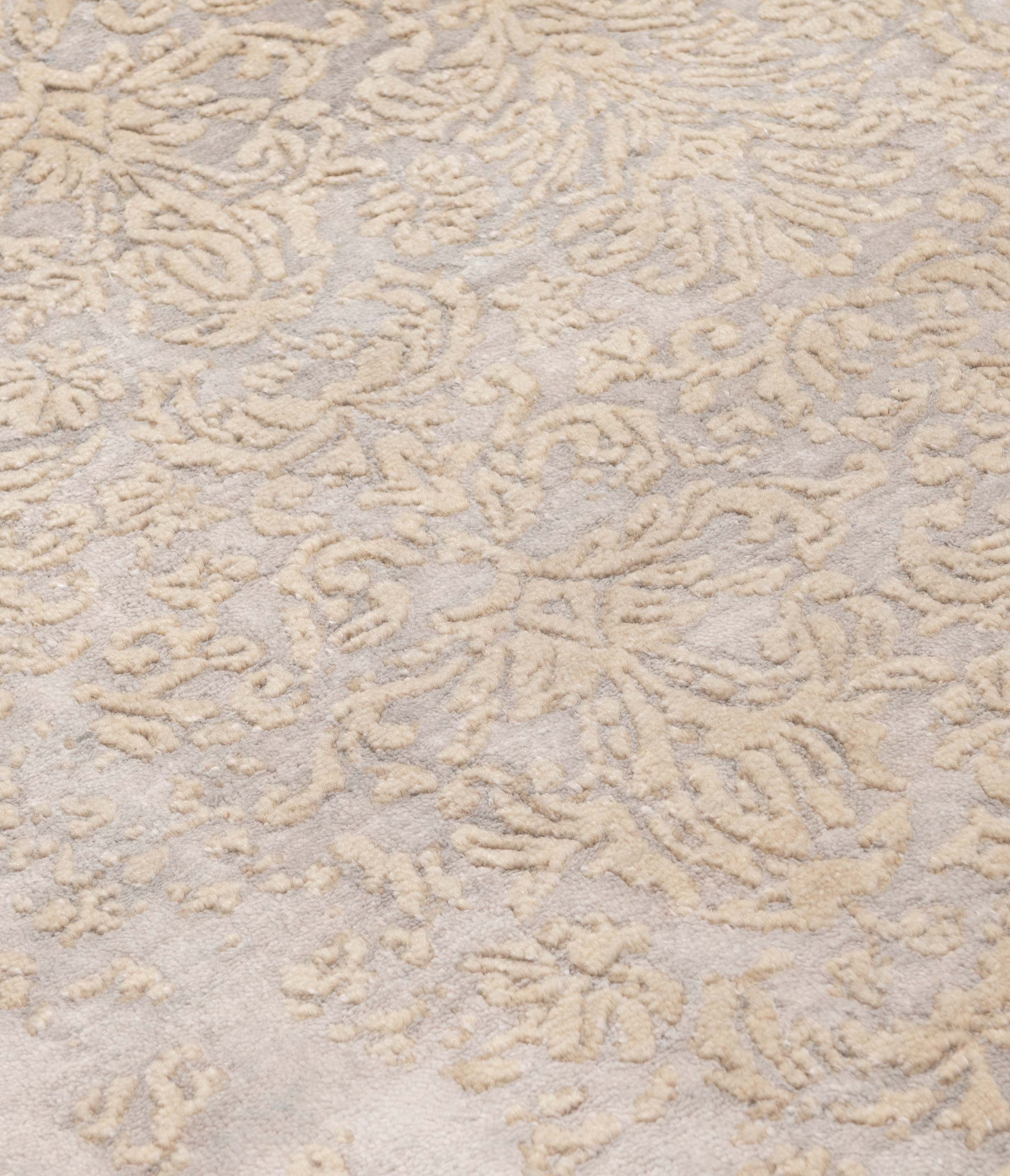 Dieser exquisite handgeknüpfte Teppich aus der Kollektion Eterno besticht durch seine Hauptfarbe, ein dezentes Grau, das Ruhe und Eleganz ausstrahlt. Beige Akzente durchziehen das Design und verleihen ihm eine subtile Wärme. Abgerundet wird die Farbpalette durch sanfte, goldene Nuancen, die dem Teppich einen Hauch von Luxus verleihen. Das Muster zeigt ein kunstvolles, florales Design mit feinen Ranken und Blüten, das einen Hauch von Vintage-Charme versprüht. Die Verwendung von ...mehr Beschreibung