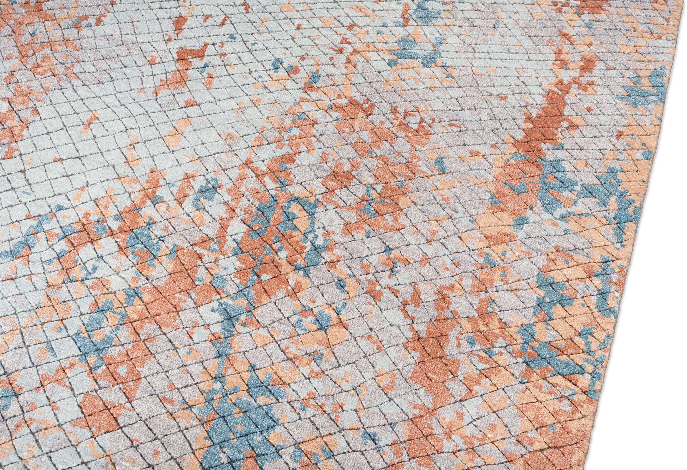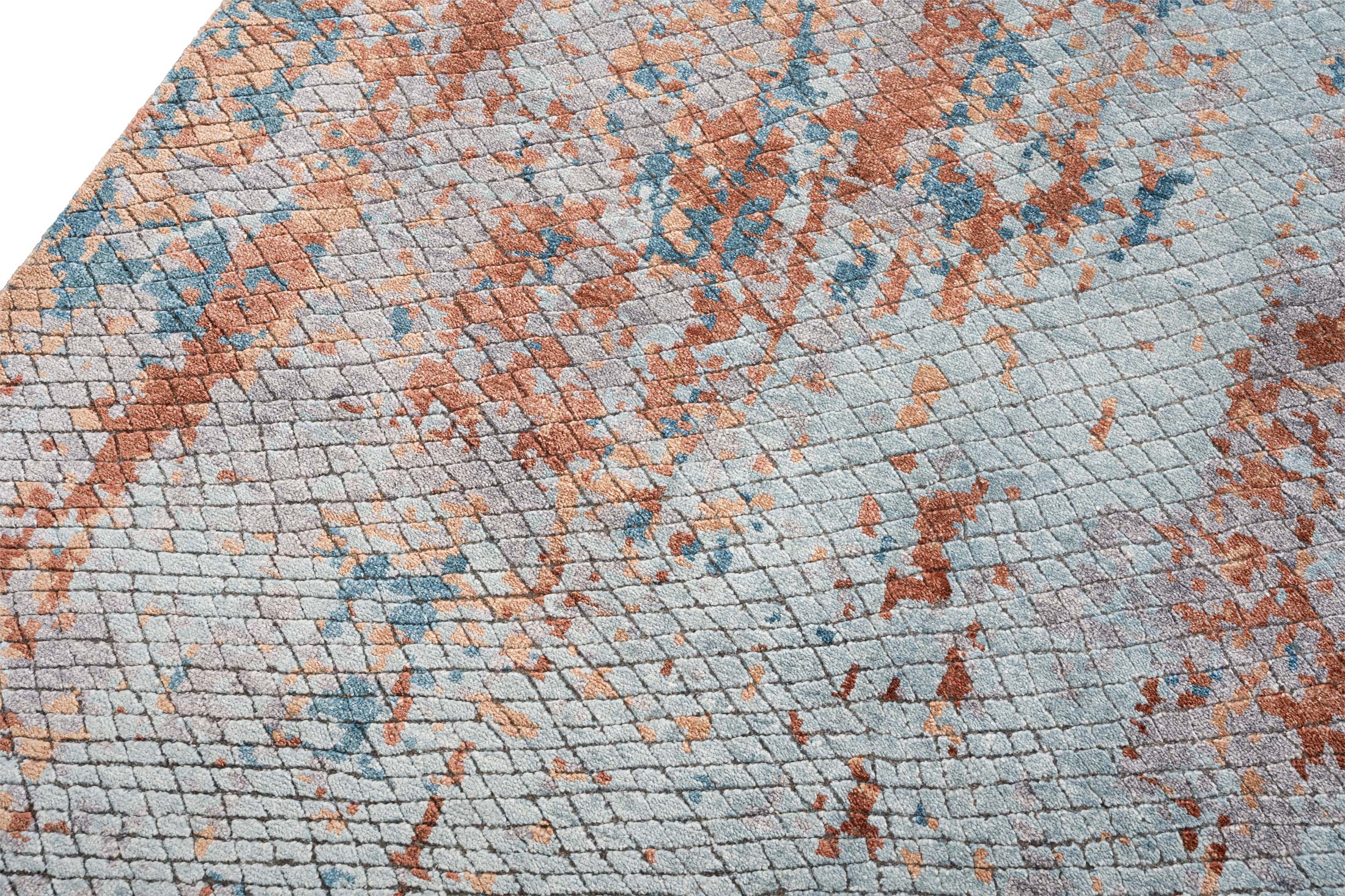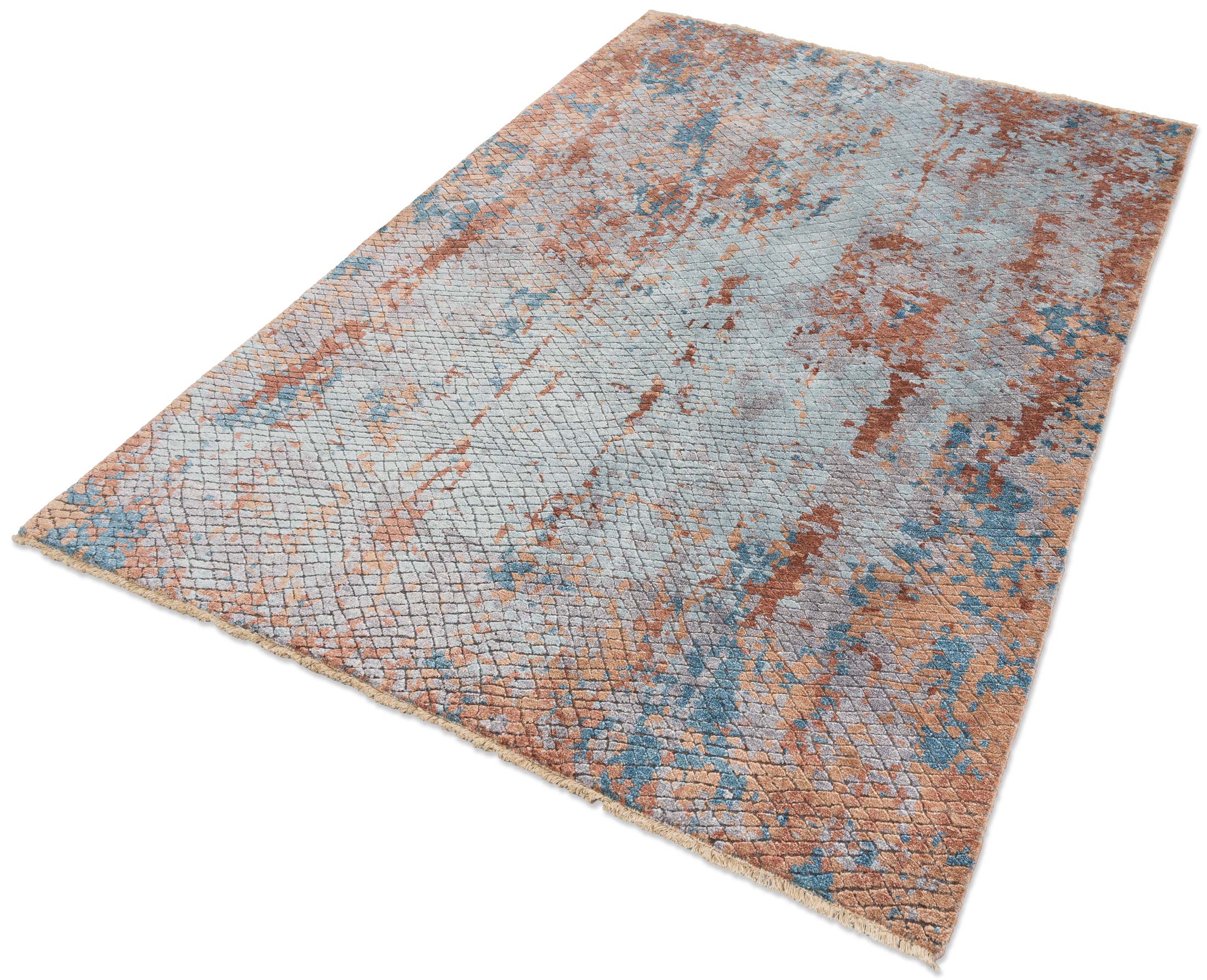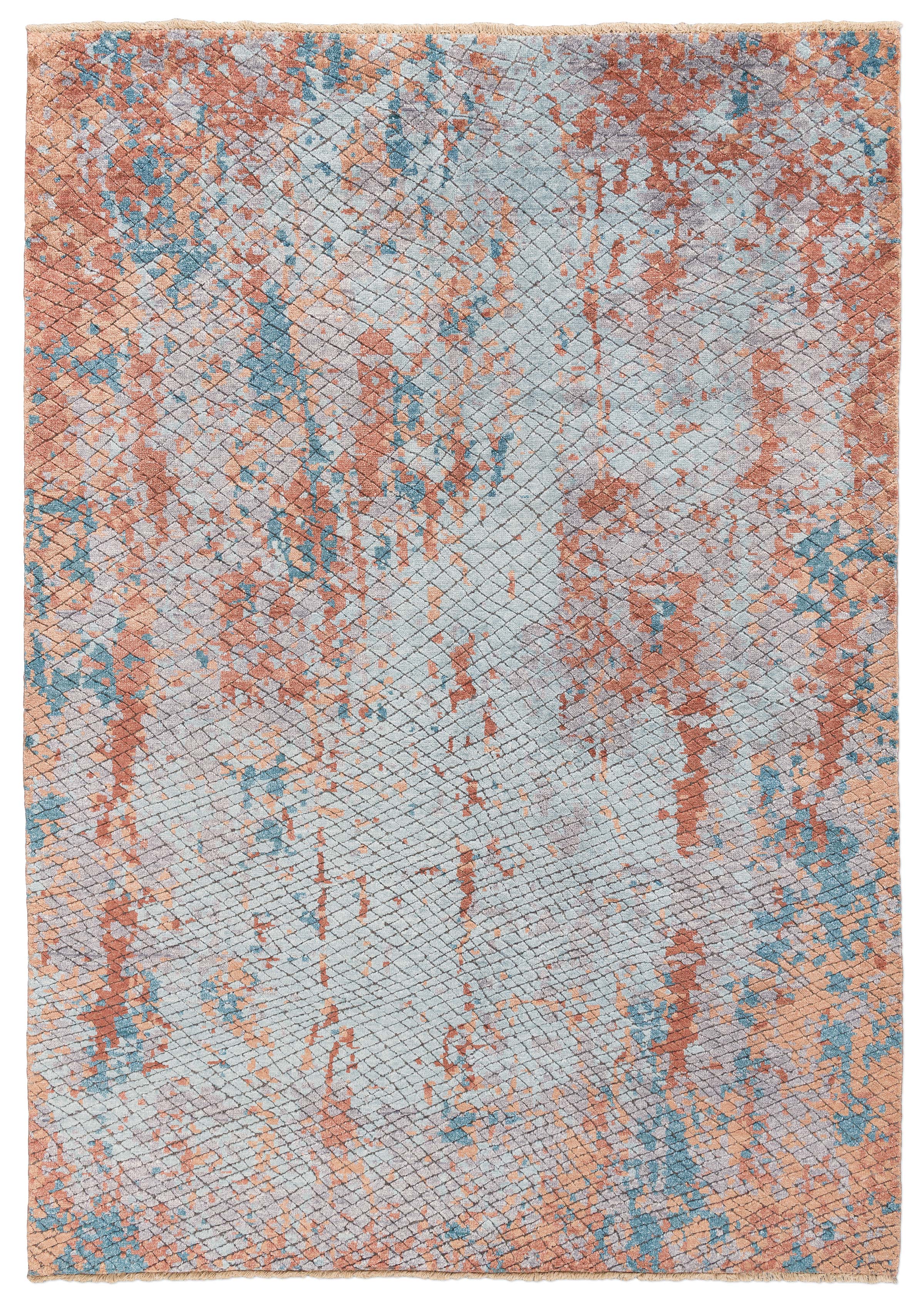 Der handgeknüpfte Teppich Eterno aus Indien ist ein Meisterwerk modernen Designs. Die Hauptfarbe ist ein sanftes Grau, das den Hintergrund dominiert und den Blick beruhigt. Begleitet wird es von einem lebhaften Rostrot, das in unregelmäßigen Mustern durch den Teppich fließt und für dynamische Akzente sorgt. Ein frisches Türkis ergänzt die Farbpalette, das wie Tupfer von Lebendigkeit über den Teppich verteilt ist. Die Musterung ist abstrakt und erinnert an ein künstlerisches Gemälde, ...mehr Beschreibung