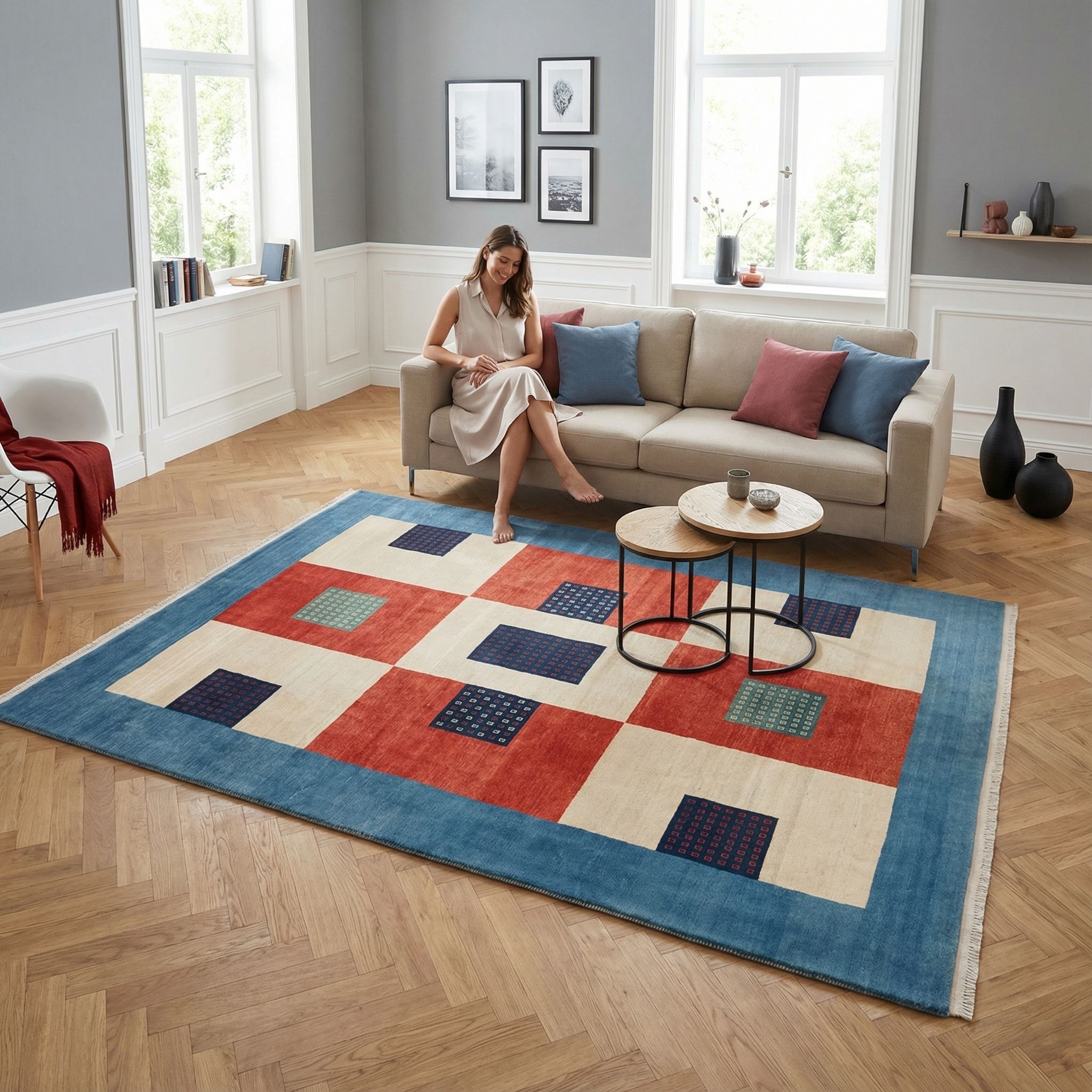 Dieser Teppich dient als kraftvoller Farbakzent, der die typische Zurückhaltung und Helligkeit des skandinavischen Designs mit Leben und Wärme füllt. Die geometrische Klarheit des Musters korrespondiert wunderbar mit der nordischen Formensprache, während die handversponnene Schafwolle für den unverzichtbaren „Hygge“-Faktor sorgt. Er durchbricht die Monotonie von Weiß und hellem Holz auf elegante Weise, ohne die aufgeräumte Ästhetik des Raumes zu stören. Durch seine langlebige und feine Qualität ist er eine nachhaltige Investition, die dem skandinavischen Bewusstsein für Wertigkeit und Naturverbundenheit entspricht.