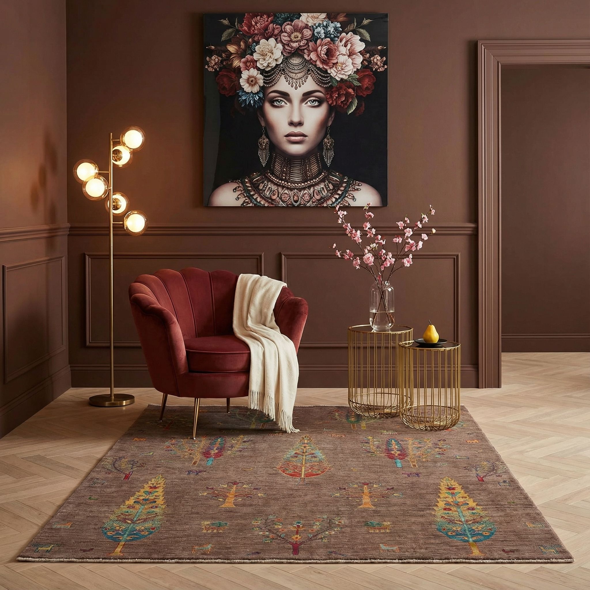 Für den unkonventionellen und künstlerischen Boho-Style bietet dieser Teppich die perfekte Bühne, da er mit seinem farbenfrohen, aber natürlichen Design Individualität und Lebensfreude ausstrahlt. Die feinen Farbnuancen der Pflanzenfarben und die verspielten Details der Bäume und Vögel laden dazu ein, ihn mit bunten Kissen, Makramee und vielen Grünpflanzen zu kombinieren. Da im Boho-Chic das Unperfekte und Handgemachte zelebriert wird, passt die sichtbare, lebendige Struktur der handversponnenen Wolle ideal in dieses kreative Wohnkonzept. Dieser Teppich ist kein Massenprodukt, sondern ein charakterstarkes Einzelstück, das Ihrem Raum jene gemütliche und freigeistige Seele verleiht, die den Boho-Look ausmacht.