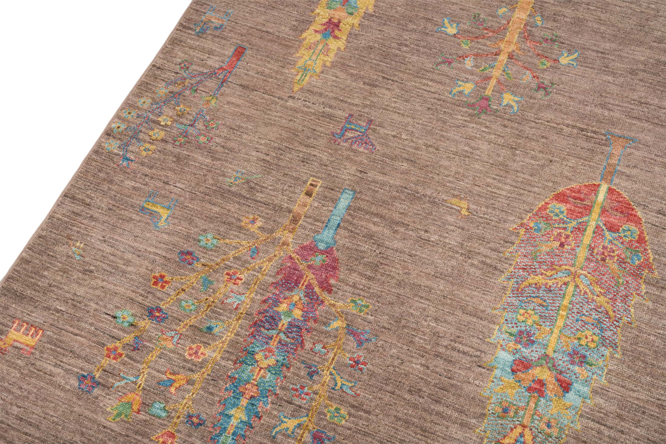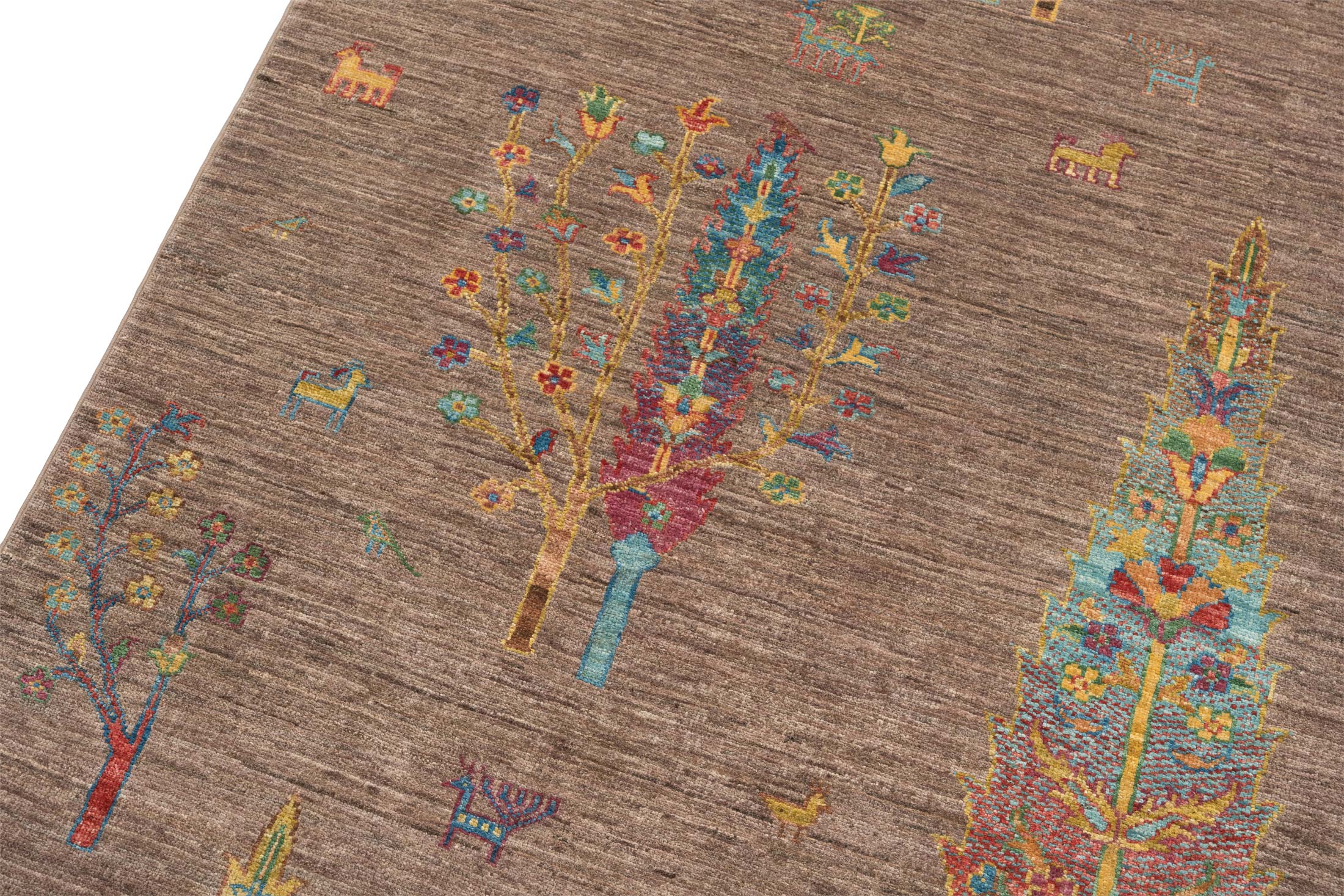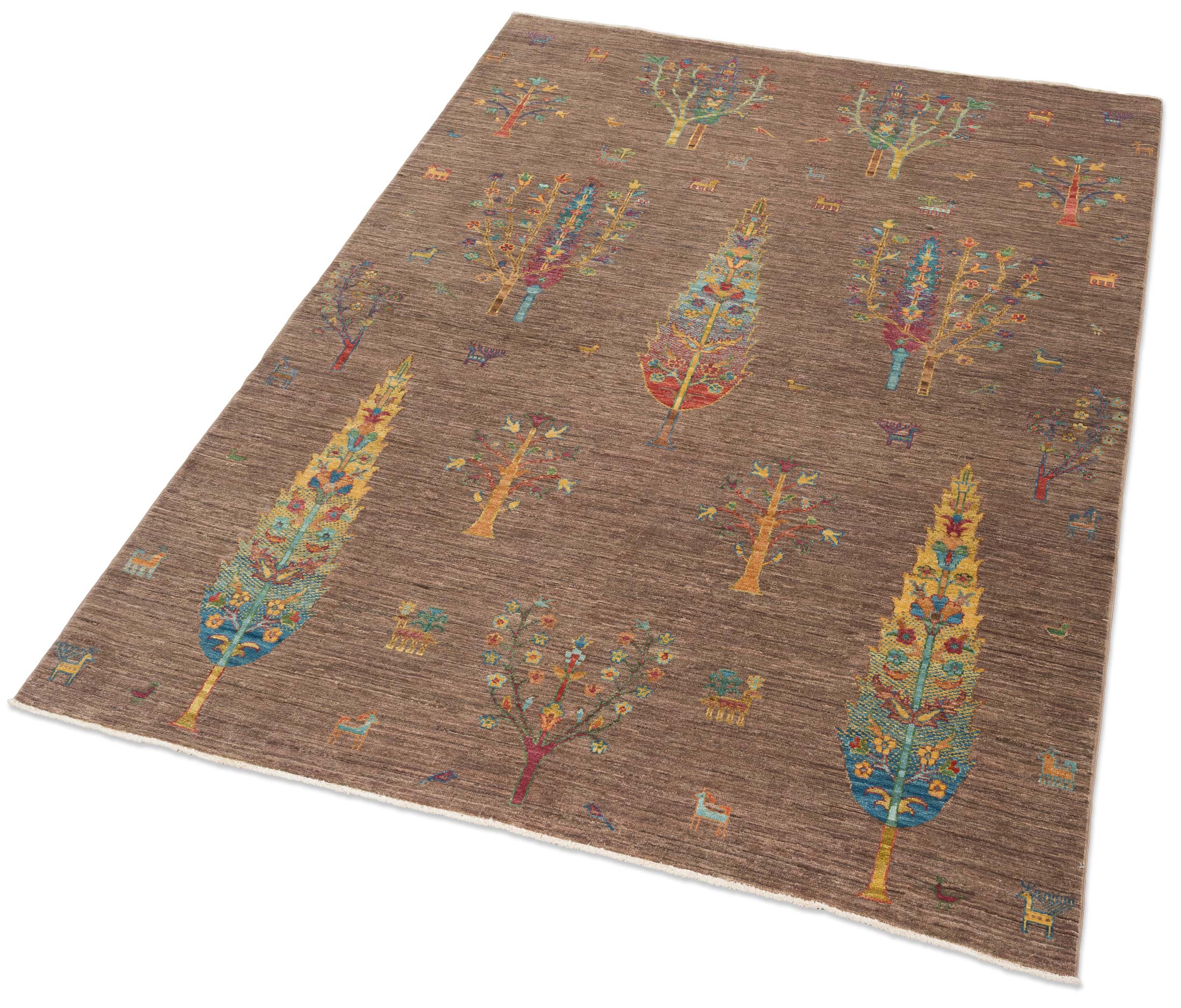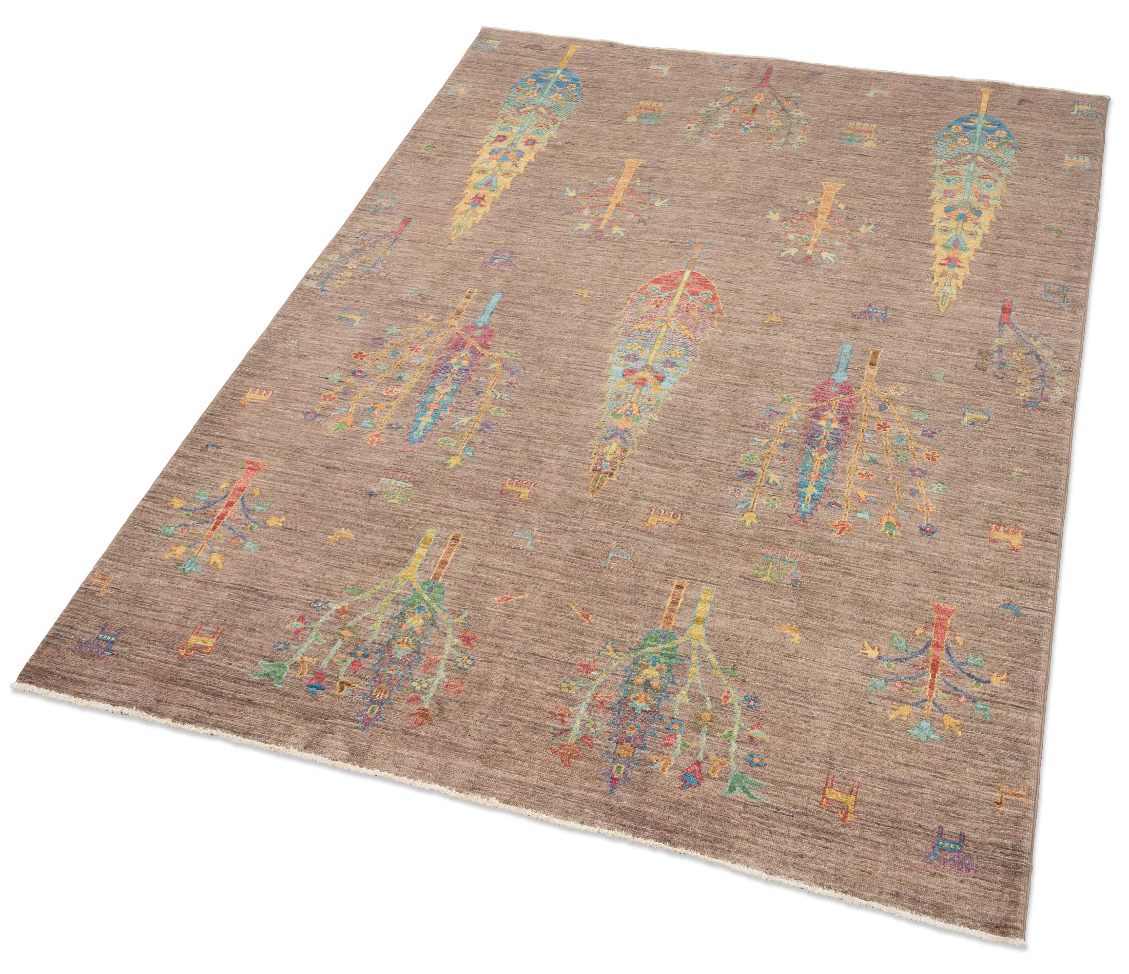 Hier präsentieren wir Ihnen einen exquisiten handgeknüpften Teppich aus Afghanistan, den Ferahan-Novum, der in seiner prächtigen Farbgebung und herausragenden Qualität besticht. Die Hauptfarbe dieses Teppichs ist ein warmes Braun, das eine einladende Grundlage bildet. Akzente in leuchtendem Blau, lebendigem Gelb und kräftigem Rot setzen eindrucksvolle Kontraste. Zusätzlich sorgen bunte Details für eine fröhliche und vielfältige Ausstrahlung. Die kunstvollen Lebensbaummotive, die den ...mehr Beschreibung