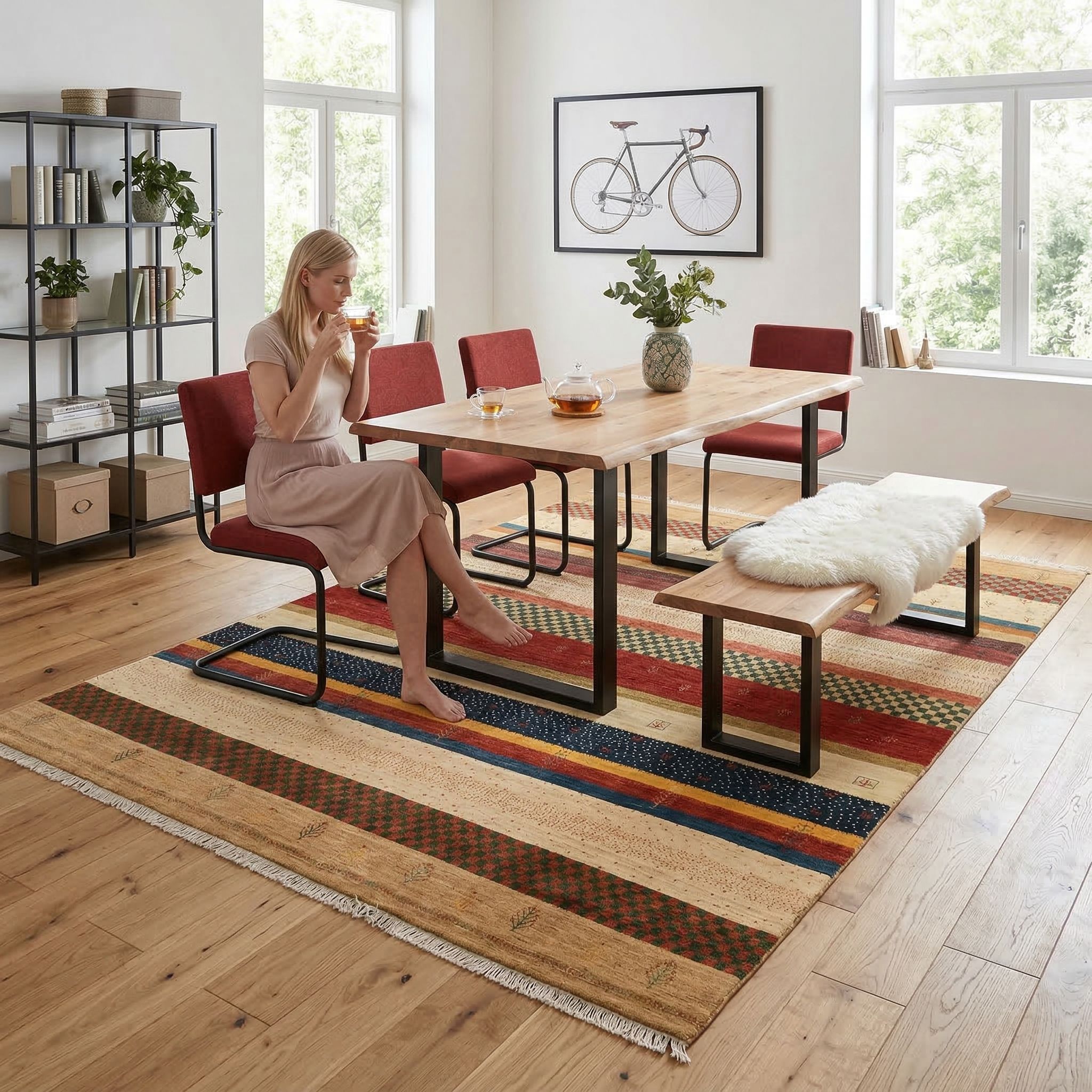 Im BOHO-Style, der für seine Unkonventionalität und den lebendigen Mix aus Farben und Mustern bekannt ist, fügt sich dieser farbenfrohe Teppich mit seinen abwechslungsreichen Streifenmustern hervorragend ein. Die künstlerische Freiheit der Knüpfer sorgt für ein absolutes Unikat, das genau die Individualität und Lässigkeit ausstrahlt, die beim Bohemian-Look gesucht wird. Die Kombination aus verspielten Motiven und der gemütlichen haptischen Ausstrahlung der hochfeinen Schafwolle schafft sofort eine entspannte und einladende Atmosphäre. Zudem lassen sich die vielfältigen Naturfarben wunderbar mit bunten Kissen, vielen Pflanzen und Rattanmöbeln kombinieren, um ein kreatives und gemütliches Gesamtbild zu erzeugen.
