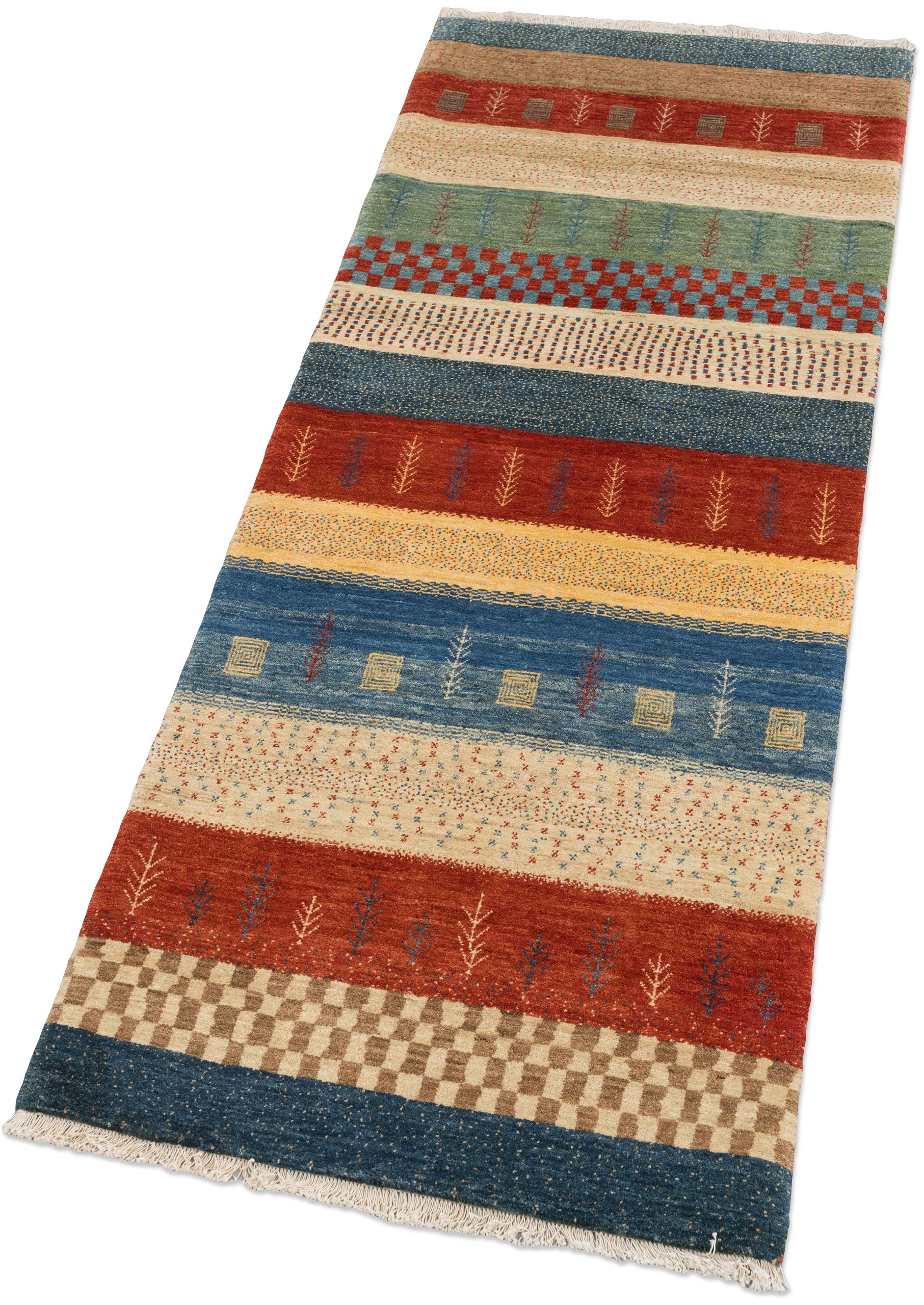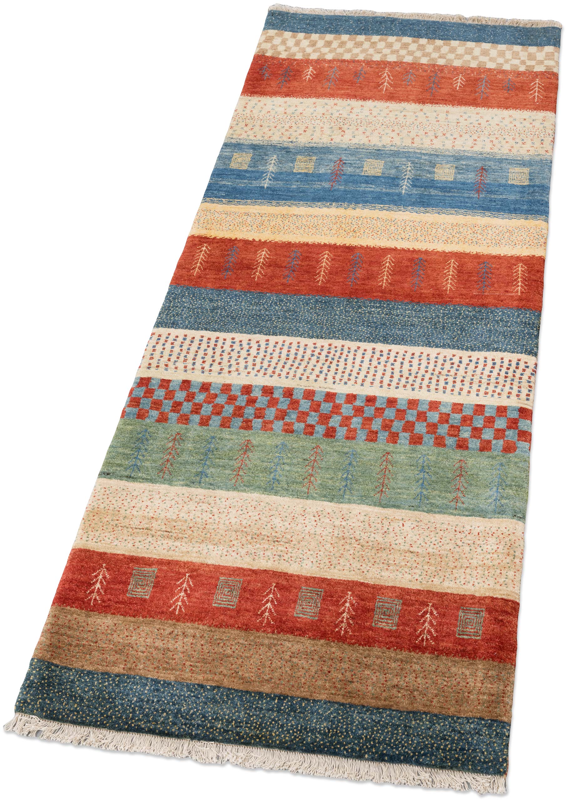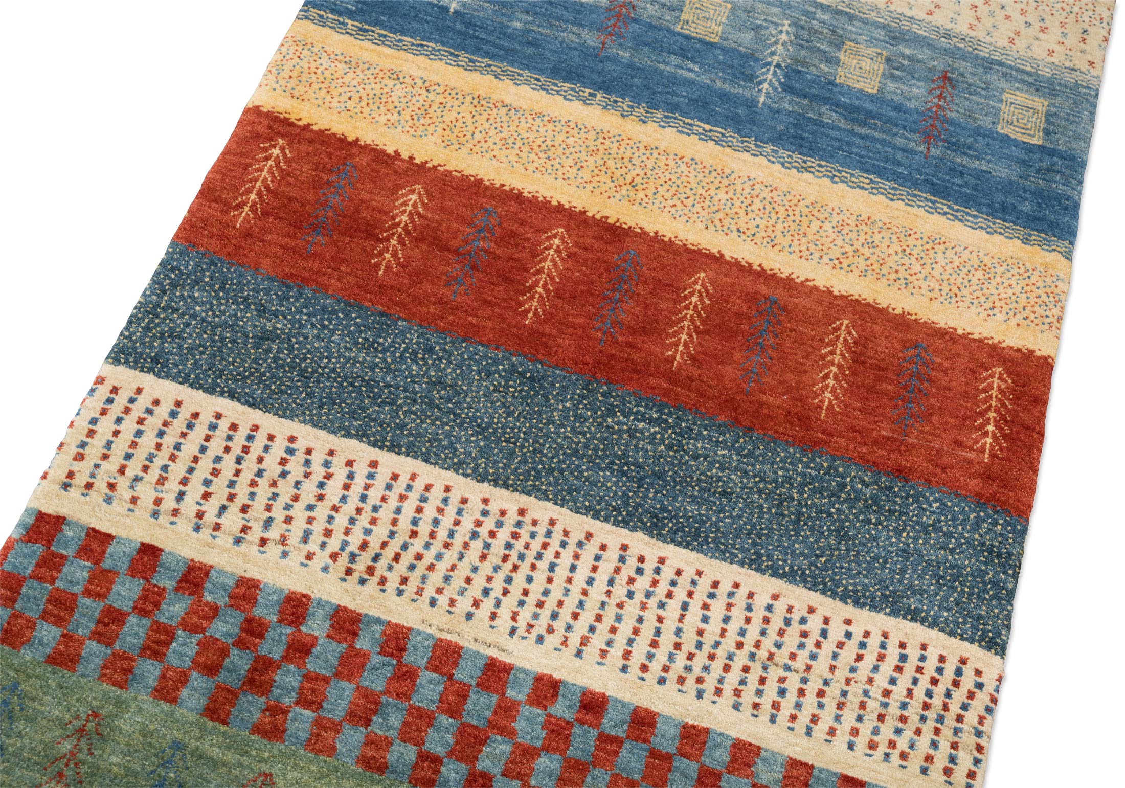 Dieser Bidjar-Novum Teppich präsentiert sich in einer lebendigen Farbpalette, die vor allem von einem kräftigen Rot dominiert wird. Ergänzt wird dieses durch ein tiefes Blau und ein erdiges Grün, was dem Teppich eine harmonische und dennoch ausdrucksstarke Wirkung verleiht. Die Musterung des Teppichs besteht aus horizontalen Streifen, die von traditionellen, floralen und geometrischen Motiven geschmückt sind. Diese Anordnung spiegelt die kunstvolle Freiheit der Knüpfer wider, die ihre Inspiration aus den Musterschätzen alter Nomadenstämme ziehen und so ein modernes, aber zeitloses Design schaffen.