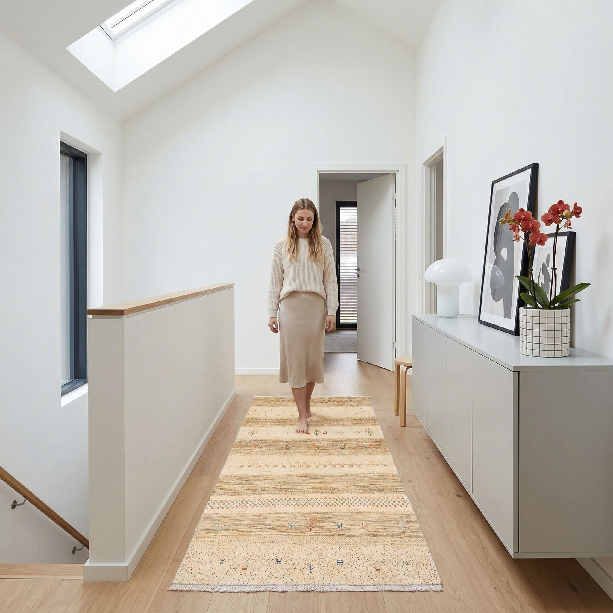 Obwohl traditionell im Ursprung, passt dieser Teppich in den Contemporary-Style, da die nomadischen Muster so neu interpretiert wurden, dass eine moderne, fast abstrakte Bildwirkung entsteht. Die zurückhaltende, neutrale Farbgebung erlaubt es ihm, als ruhiger Anker in einem Raum voller aktueller Designtrends und moderner Kunst zu fungieren. Die "State of the Art"-Qualität und die Exklusivität des Materials sprechen den zeitgenössischen Wunsch nach nachhaltigem Luxus und bleibenden Werten an. Er bricht die Strenge moderner Architektur mit seiner organischen Struktur auf und verleiht dem Raum Seele, ohne altbacken zu wirken.