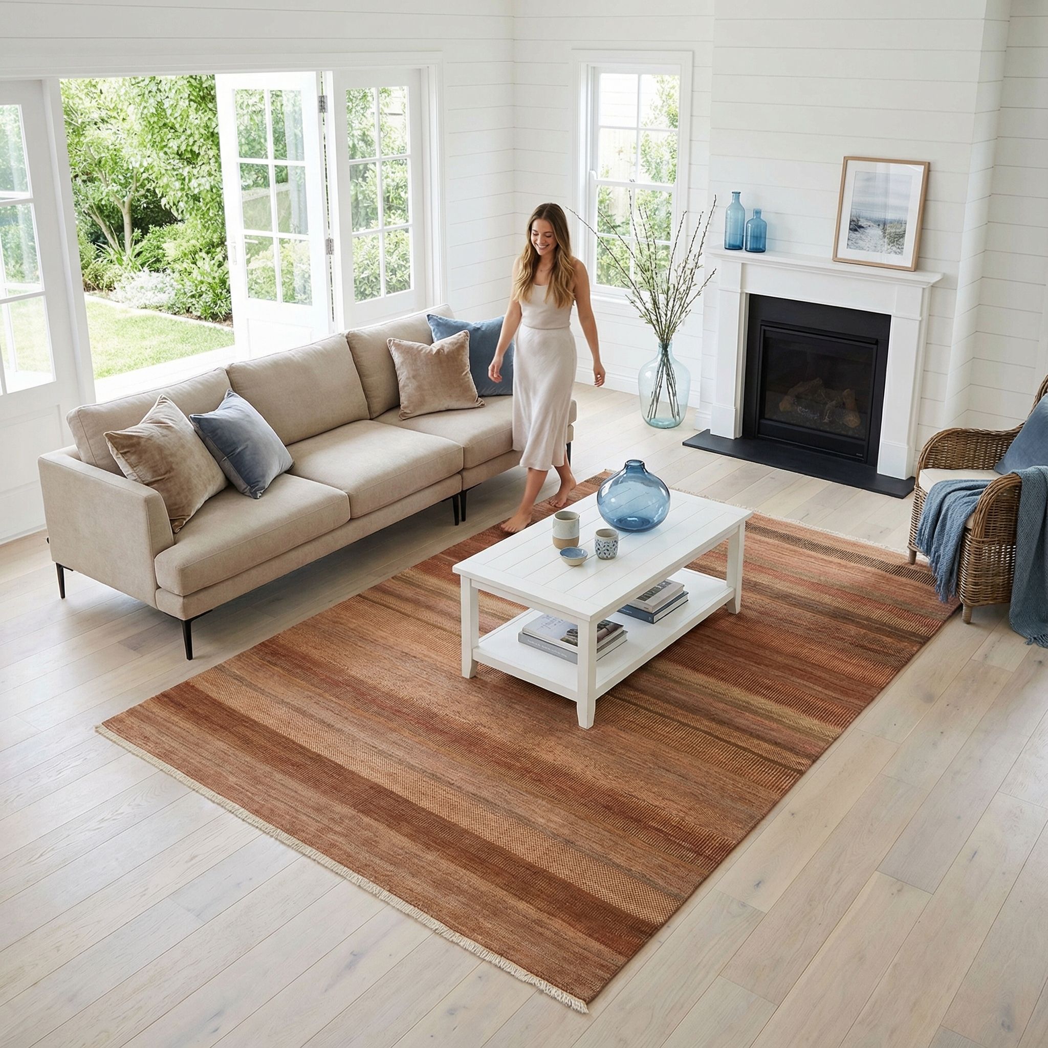 Dieser Bidjar-Novum Teppich präsentiert sich in einem warmen, erdigen Braunton als Hauptfarbe. Ergänzt wird er durch Akzente in Kupfer und einem sanften Beige. Diese harmonische Farbpalette schafft eine einladende und natürliche Atmosphäre. Die Musterung des Teppichs ist geprägt von horizontalen Streifen, die sich in ihrer Breite und den verwendeten Farben abwechseln, was dem Design Tiefe und Textur verleiht.Gefertigt aus handversponnener Schafwolle und gefärbt mit Naturfarben, ...