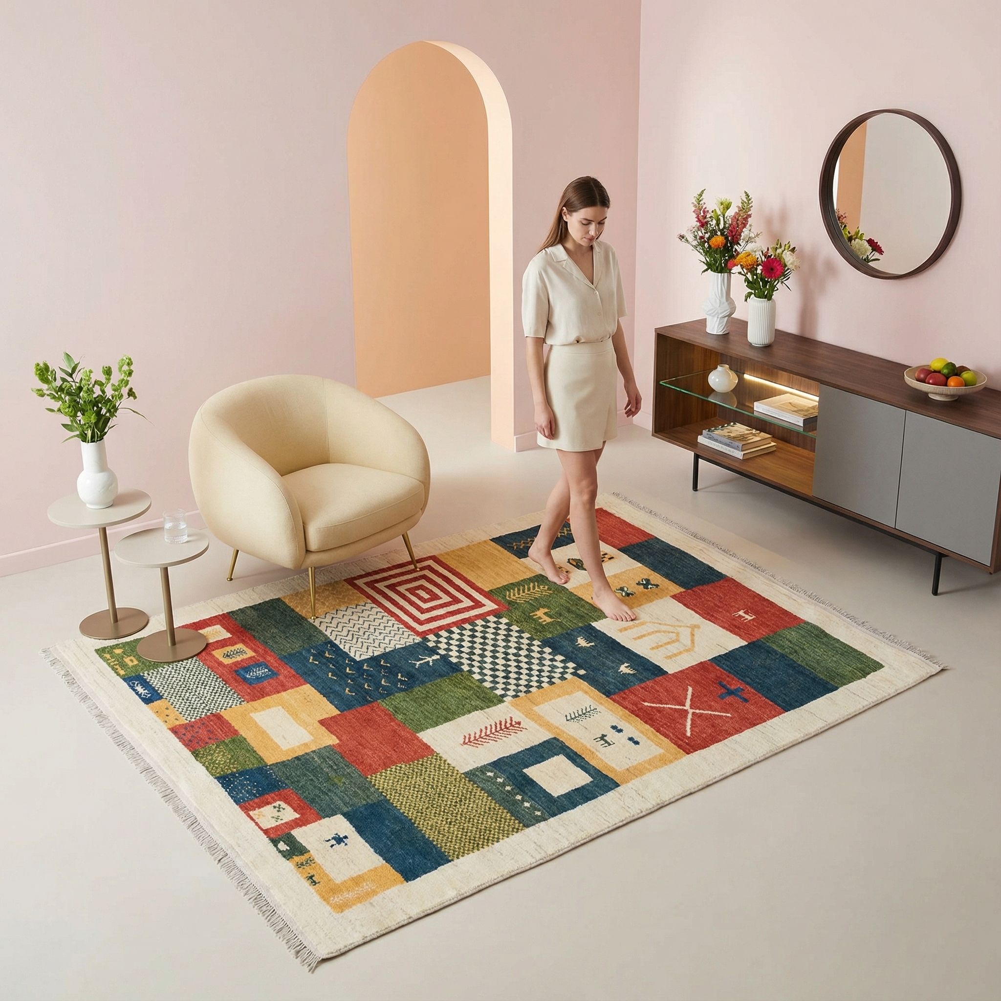 Dieser handgeknüpfte persische Gabbeh-Teppich präsentiert sich in einer harmonischen Farbkomposition, die von einem intensiven Ziegelrot dominiert wird. Begleitet wird diese Hauptfarbe von einem tiefen Blau und einem warmen Goldgelb, die zusammen ein lebendiges und dennoch ausgewogenes Gesamtbild schaffen. Ergänzt wird das Farbspektrum durch ein sanftes Naturweiß, das dem Teppich eine erdige Basis verleiht. Die Musterung ist abwechslungsreich und zeigt geometrische Formen sowie stilisierte ...mehr Beschreibung