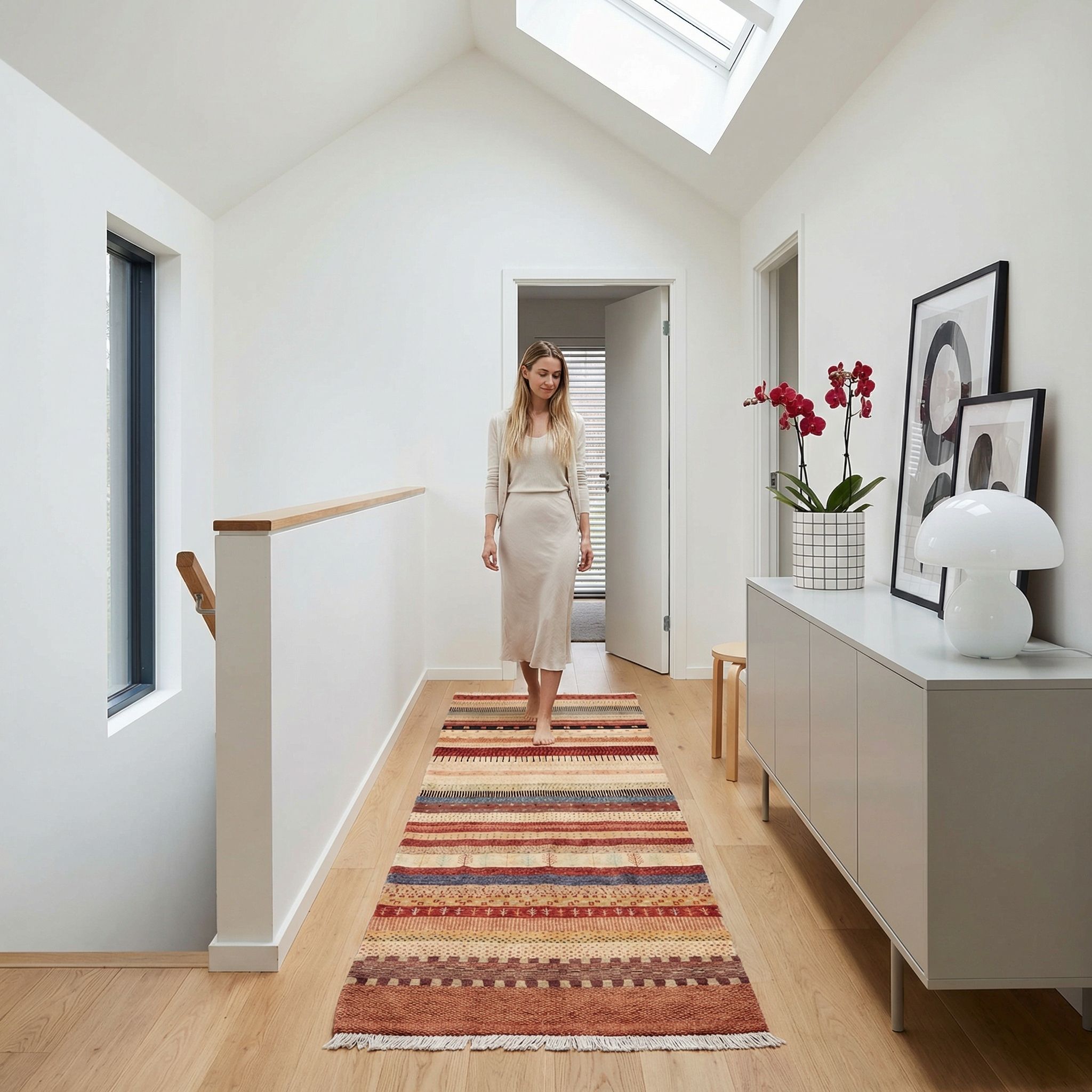 Der skandinavische Stil mag zwar oft minimalistisch sein, lebt aber auch vom "Hygge"-Gefühl, welches dieser Teppich durch seine dichte, handgeknüpfte Wolle und die warme Ausstrahlung perfekt verkörpert. Die geordnete Struktur der horizontalen Streifen fügt sich gut in die klare Formensprache des nordischen Designs ein, ohne unruhig zu wirken. Als farblicher Akzent auf hellen Holzböden bringt er genau die richtige Dosis an Farbe und Naturmaterialien ein, um die typisch skandinavische weiße Leere gemütlich zu machen. Die nachhaltige Herstellung in Hausfleiß und die Langlebigkeit des Materials entsprechen zudem dem skandinavischen Bewusstsein für Qualität und umweltfreundliches Design.