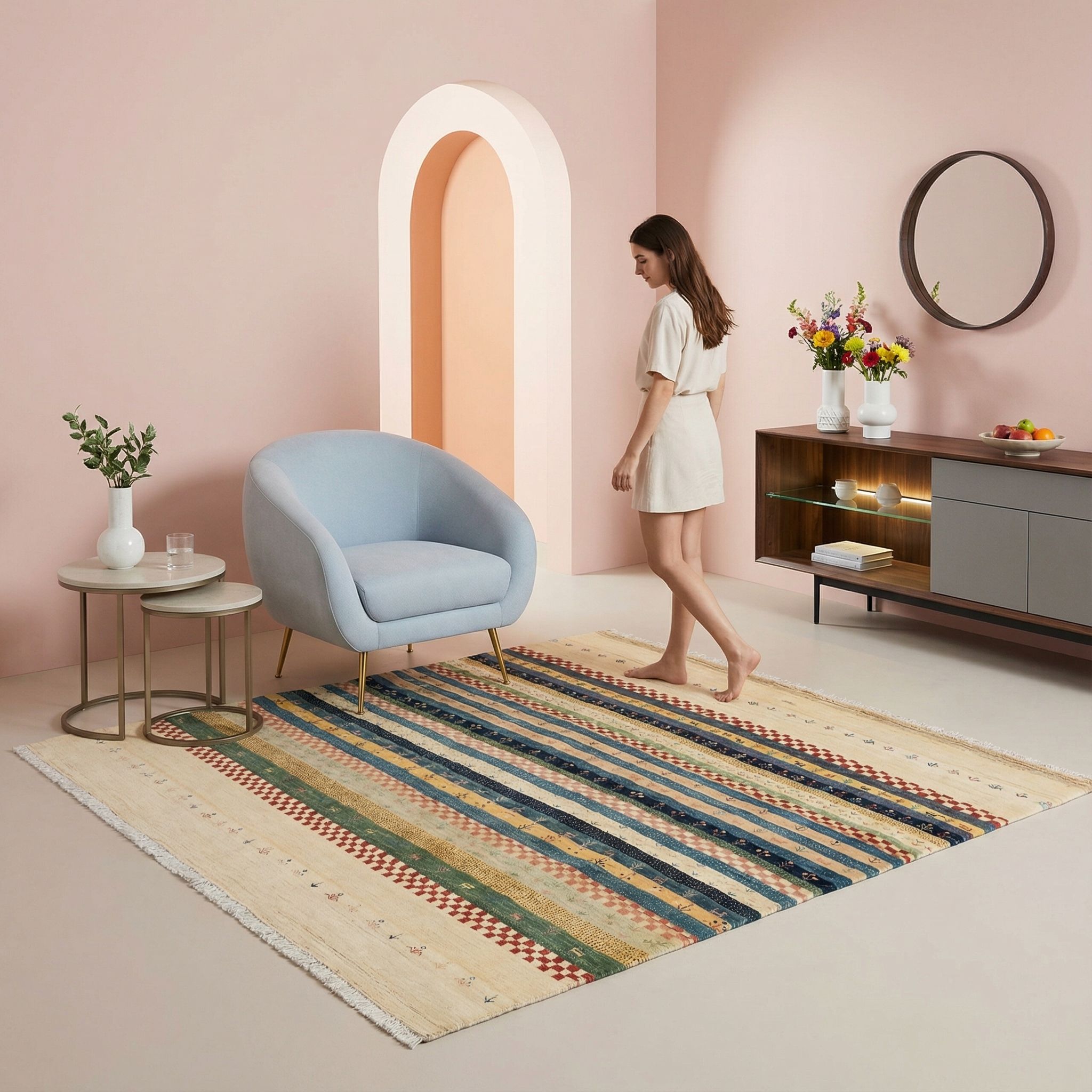 Der entspannte und unkonventionelle Boho-Style lebt von einem Mix aus Farben, Mustern und Texturen, wofür dieser gestreifte Teppich mit seinen vielfältigen Motiven die ideale Basis bildet. Die spielerische Anordnung der mystischen Nomaden-Symbole harmoniert wunderbar mit der künstlerischen Freiheit und der "Unperfektheit" dieses Wohnstils. Da Boho großen Wert auf Natürlichkeit legt, passen die reine, handversponnene Schafwolle und die lebendigen Farbunterschiede (Abrash) hervorragend in ein solches Ambiente. Der Teppich bringt genau die richtige Dosis an Exotik und Gemütlichkeit mit, um eine individuelle Wohlfühloase zu schaffen.