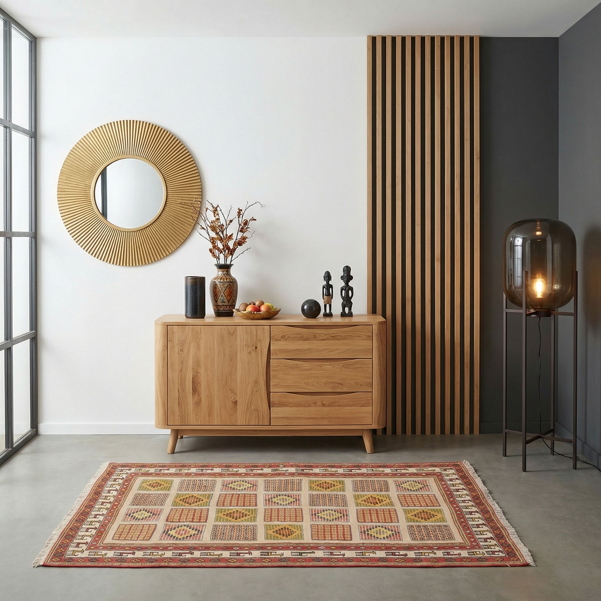 Dieser robuste Sumack-Kelim bildet einen spannenden Kontrapunkt zu den kühlen Materialien wie Beton, Stahl und unverputztem Mauerwerk, die den Industrial-Style prägen. Die kräftigen Farben und die filigrane Handwerkskunst durchbrechen die raue Loft-Ästhetik und schaffen eine wohnliche Insel inmitten der urbanen Coolness. Dank seiner außergewöhnlichen Strapazierfähigkeit hält der Teppich auch der Nutzung in offenen, belebten Wohnbereichen stand und unterstreicht den Werkstatt-Charakter durch seine sichtbare, ehrliche Machart. Er verbindet rauen Industrie-Charme mit der Wärme traditioneller Nomadenkunst zu einem einzigartigen Wohngefühl.