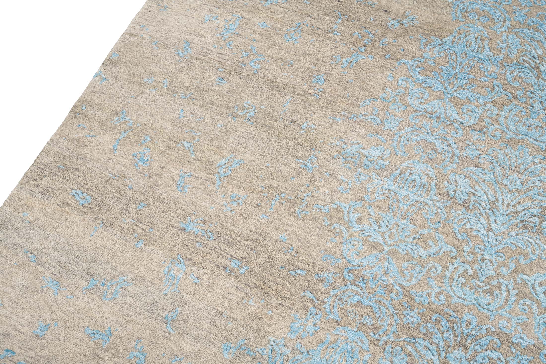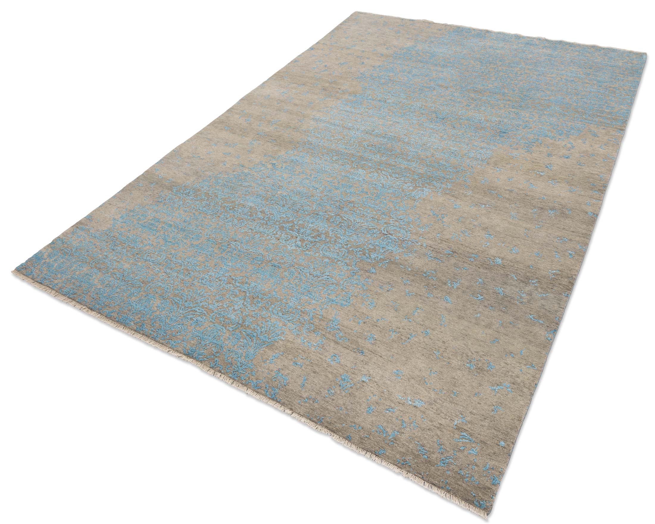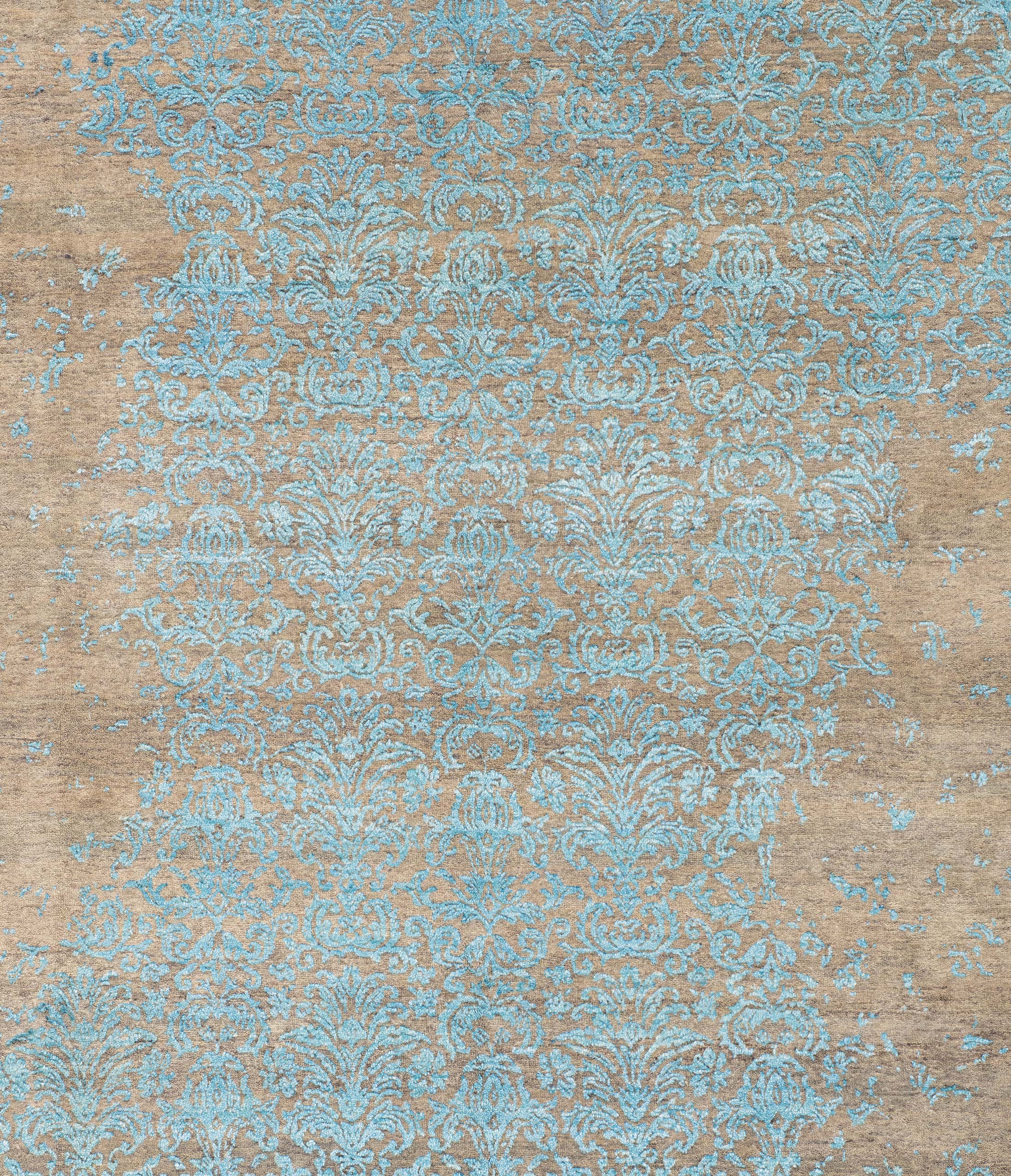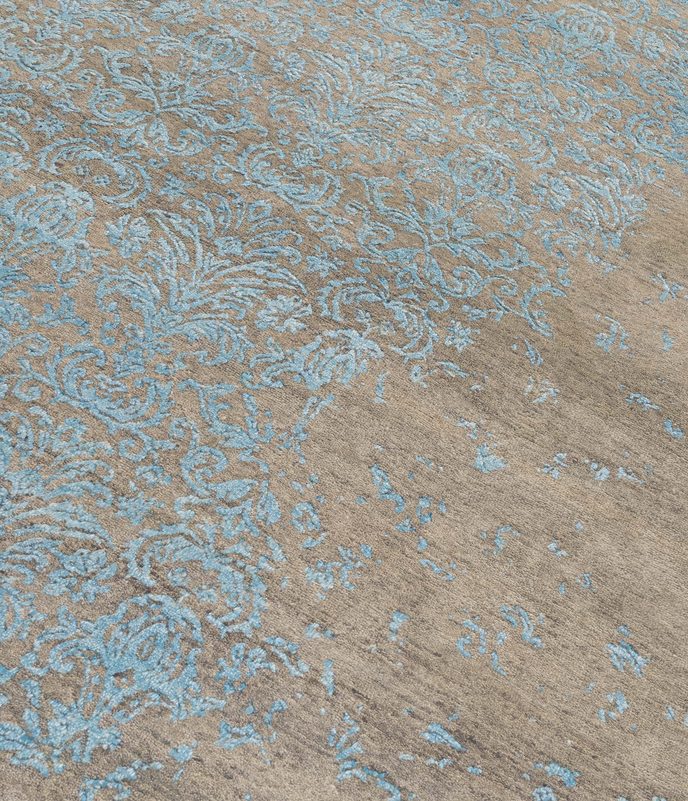 Dieser handgeknüpfte Teppich aus der Eterno-Kollektion besticht durch seine Hauptfarbe Beigebraun, die eine warme und einladende Basis schafft. Akzentuiert wird dieses Grundton durch ein zartes Türkis, welches in einem kunstvollen floralen Muster über den Teppich fließt und ihm eine elegante, fast ätherische Anmutung verleiht. Diese Kombination aus Farben erzeugt ein harmonisches und gleichzeitig lebendiges Erscheinungsbild. Der Teppich ist aus hochwertiger, handkardierter Schafwolle und ...mehr Beschreibung