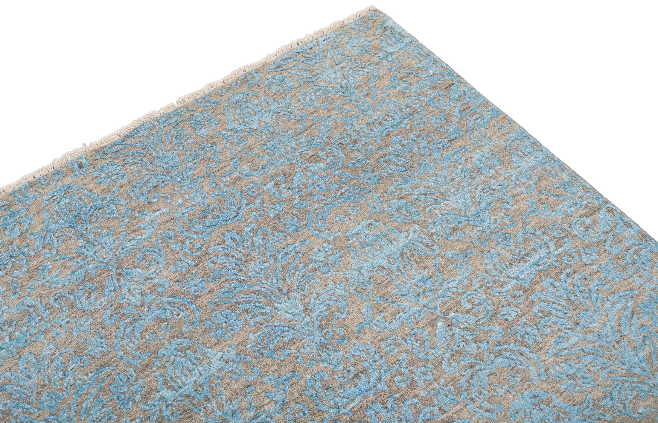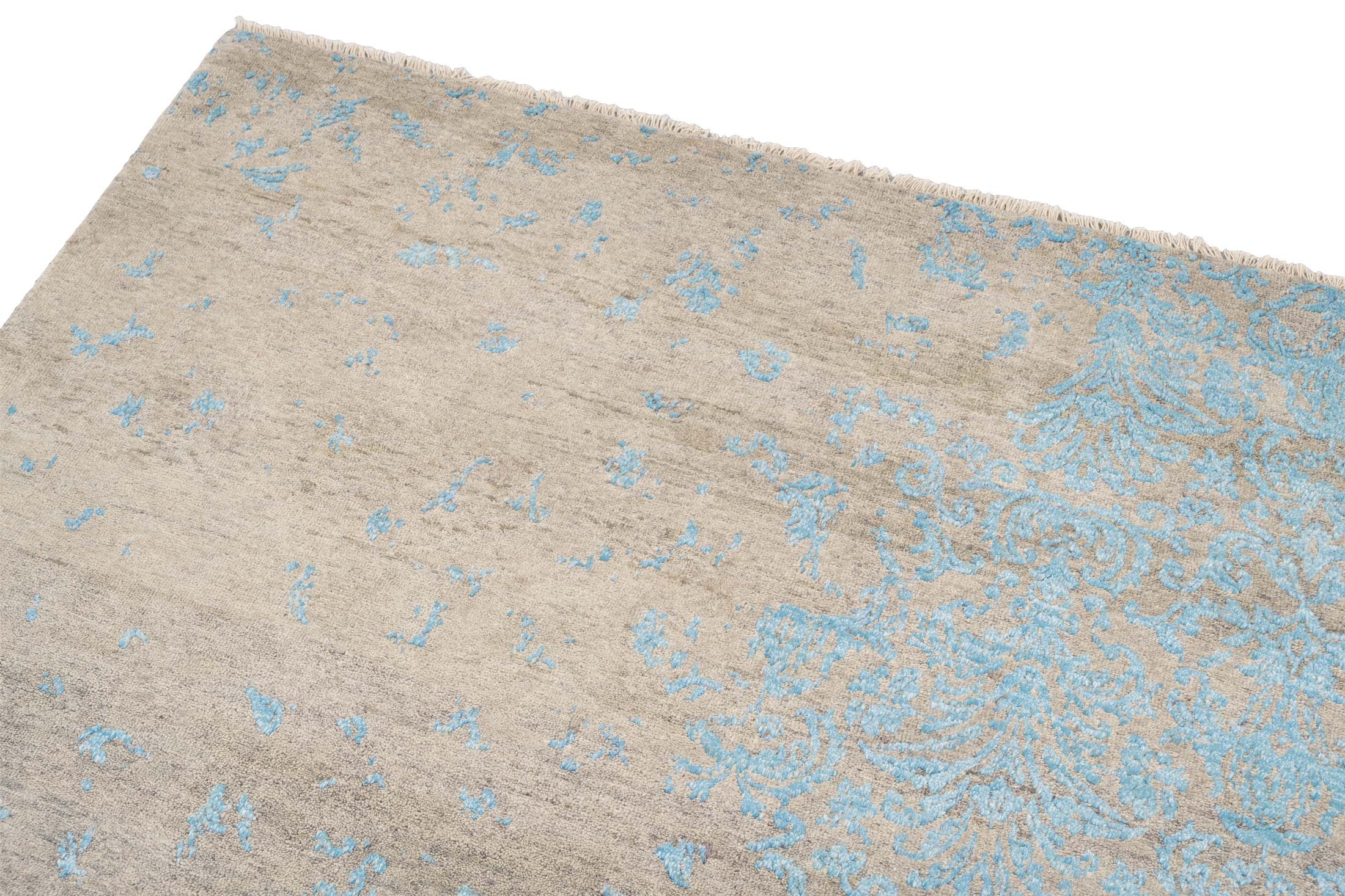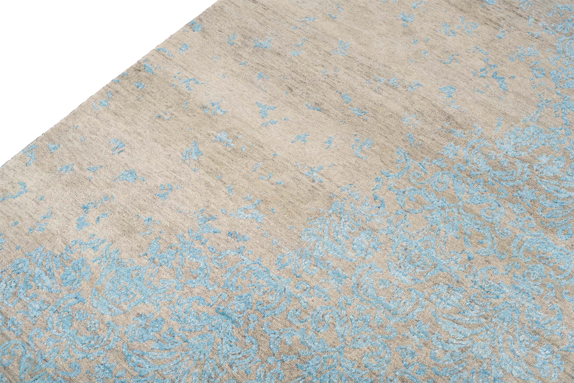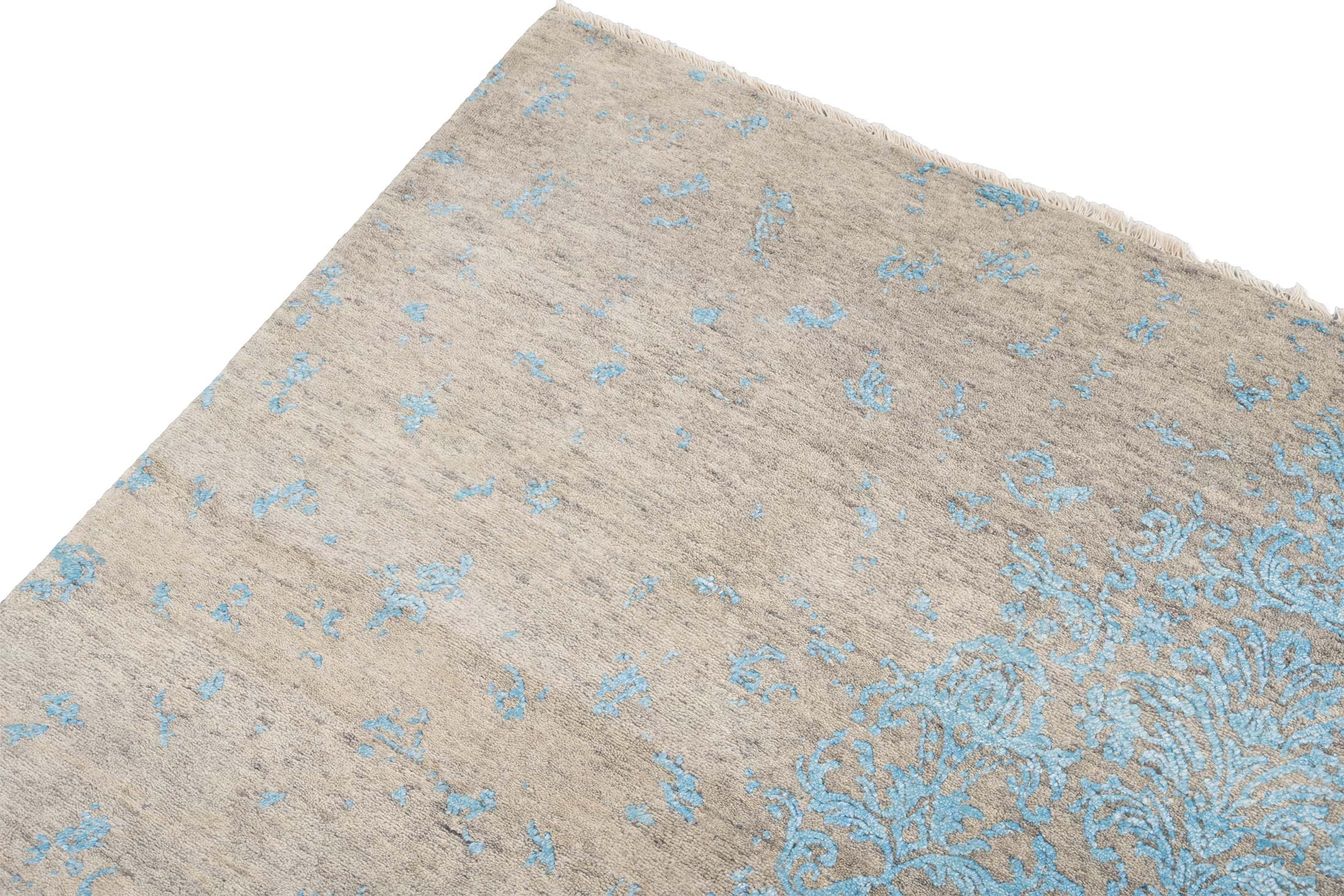 Dieser handgeknüpfte Teppich aus der Eterno-Kollektion besticht durch seine Hauptfarbe Beigebraun, die eine warme und einladende Basis schafft. Akzentuiert wird dieses Grundton durch ein zartes Türkis, welches in einem kunstvollen floralen Muster über den Teppich fließt und ihm eine elegante, fast ätherische Anmutung verleiht. Diese Kombination aus Farben erzeugt ein harmonisches und gleichzeitig lebendiges Erscheinungsbild. Der Teppich ist aus hochwertiger, handkardierter Schafwolle und ...mehr Beschreibung