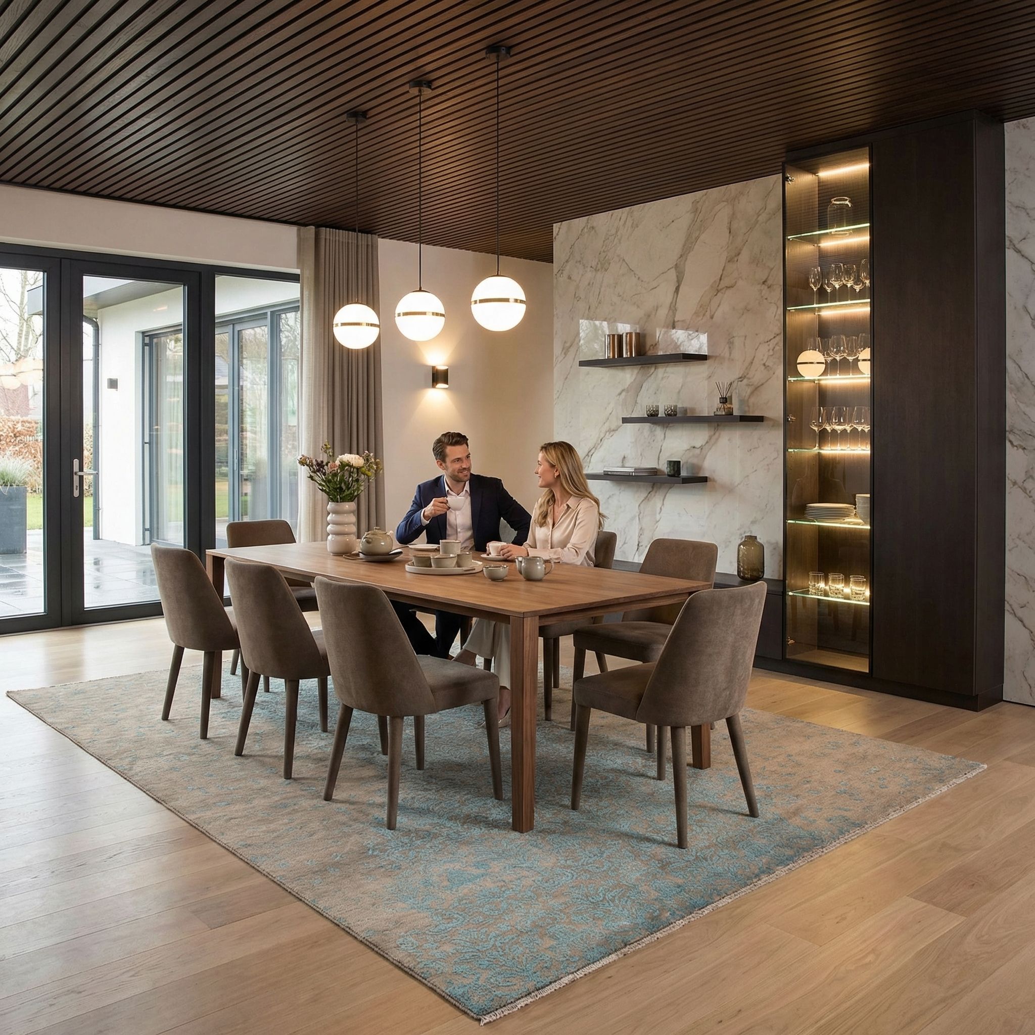 Auch im skandinavischen Design findet dieser Teppich seinen Platz, da er die nordischen Grundwerte von Helligkeit, Natürlichkeit und Nachhaltigkeit durch seine CO2-neutrale Bambusseide perfekt verkörpert. Der ruhige Grundton des Teppichs fügt sich nahtlos in die helle Farbpalette des Scandi-Styles ein, während die bläulichen Akzente für die nötige Frische sorgen, ohne aufdringlich zu sein. Die weiche Haptik der Wolle sorgt für das berühmte "Hygge"-Gefühl und lädt dazu ein, barfuß über den Boden zu laufen. Er ist das ideale Element, um minimalistischen Räumen Textur und Charakter zu verleihen, ohne die visuelle Ruhe zu stören.