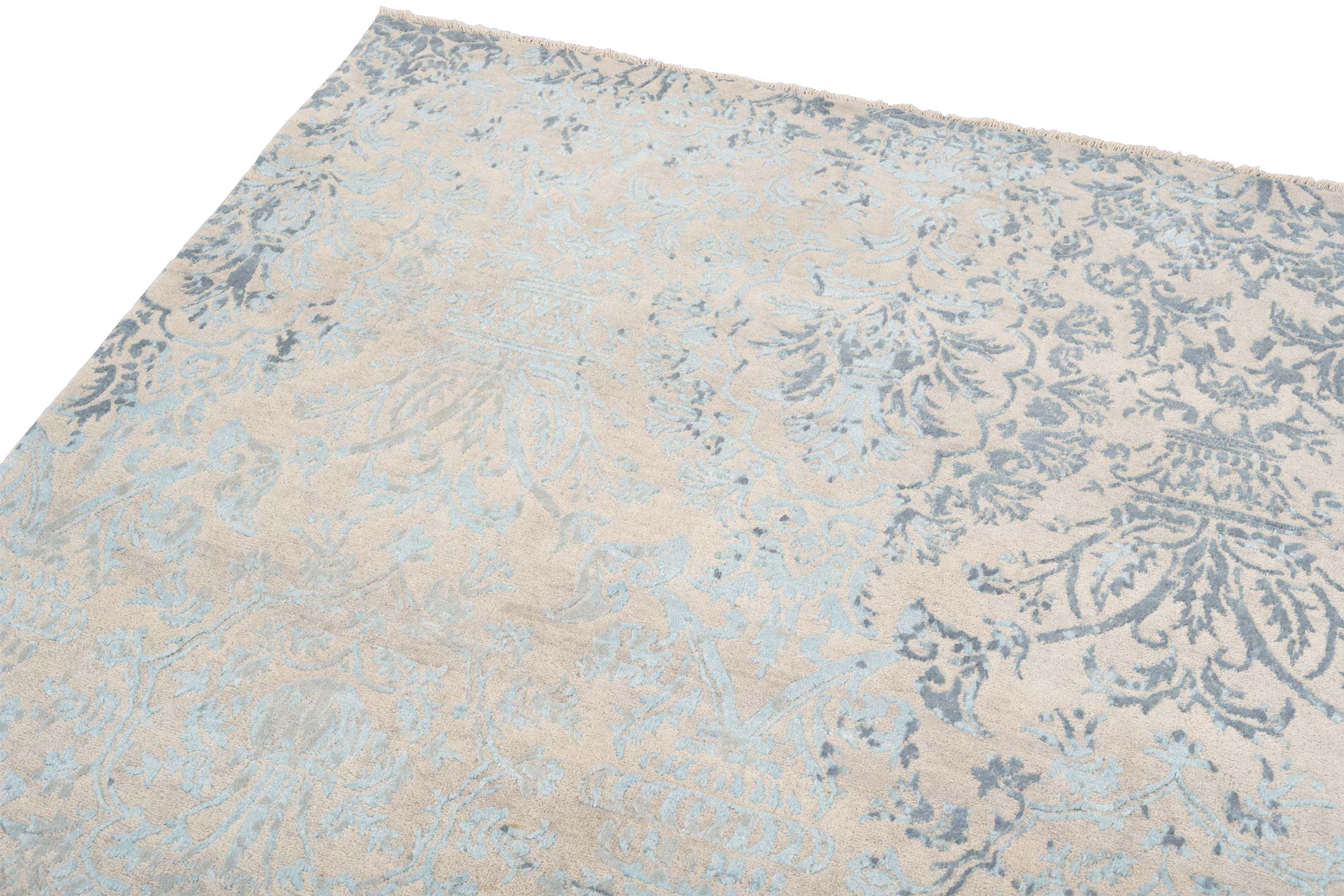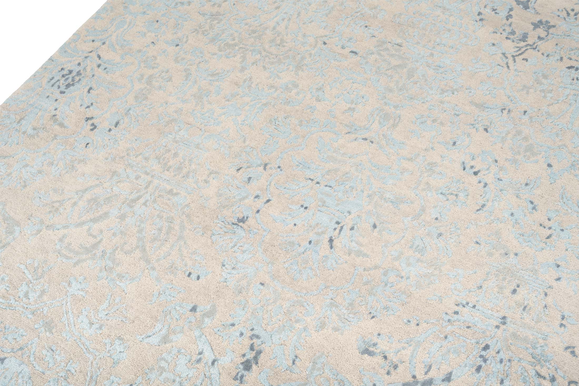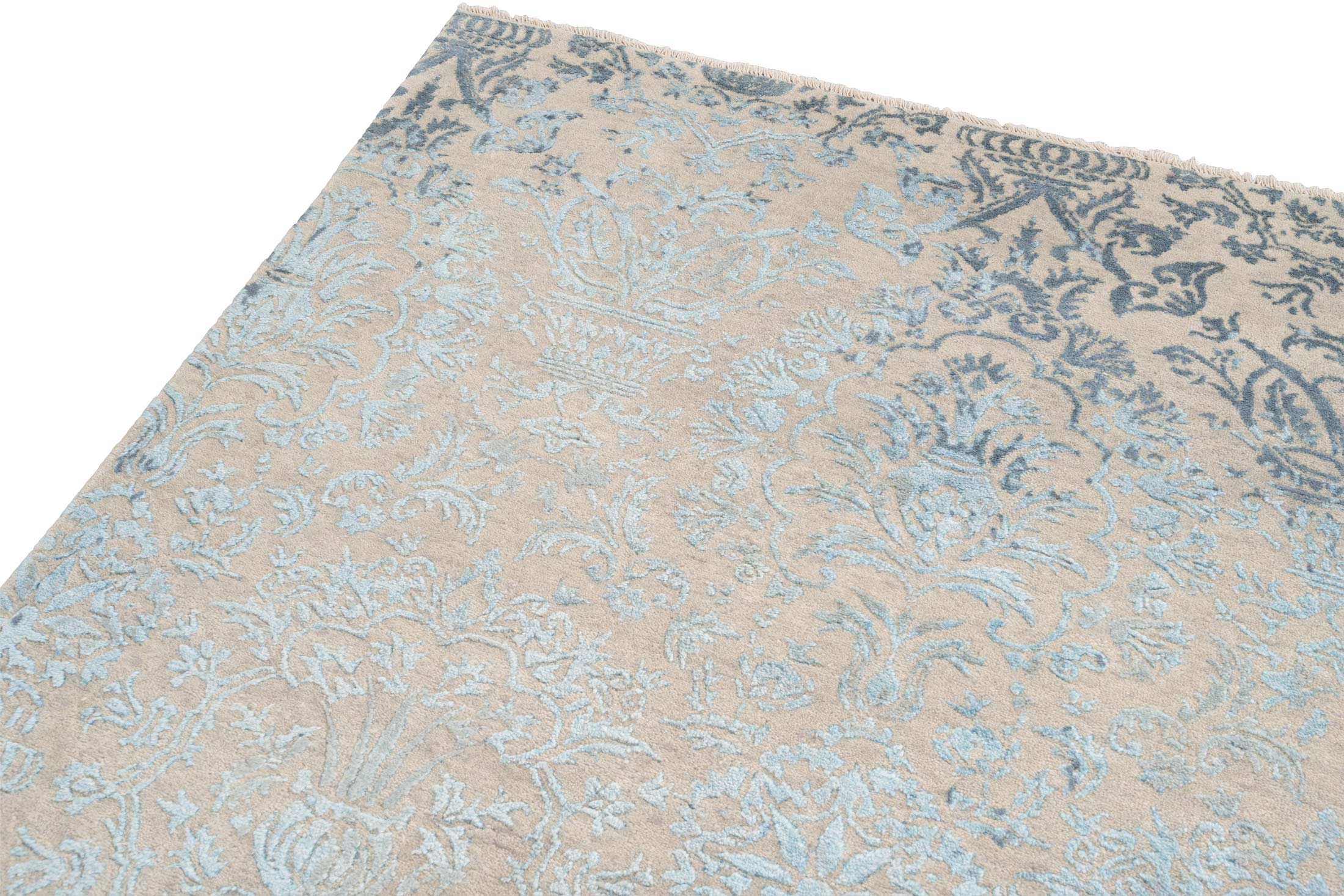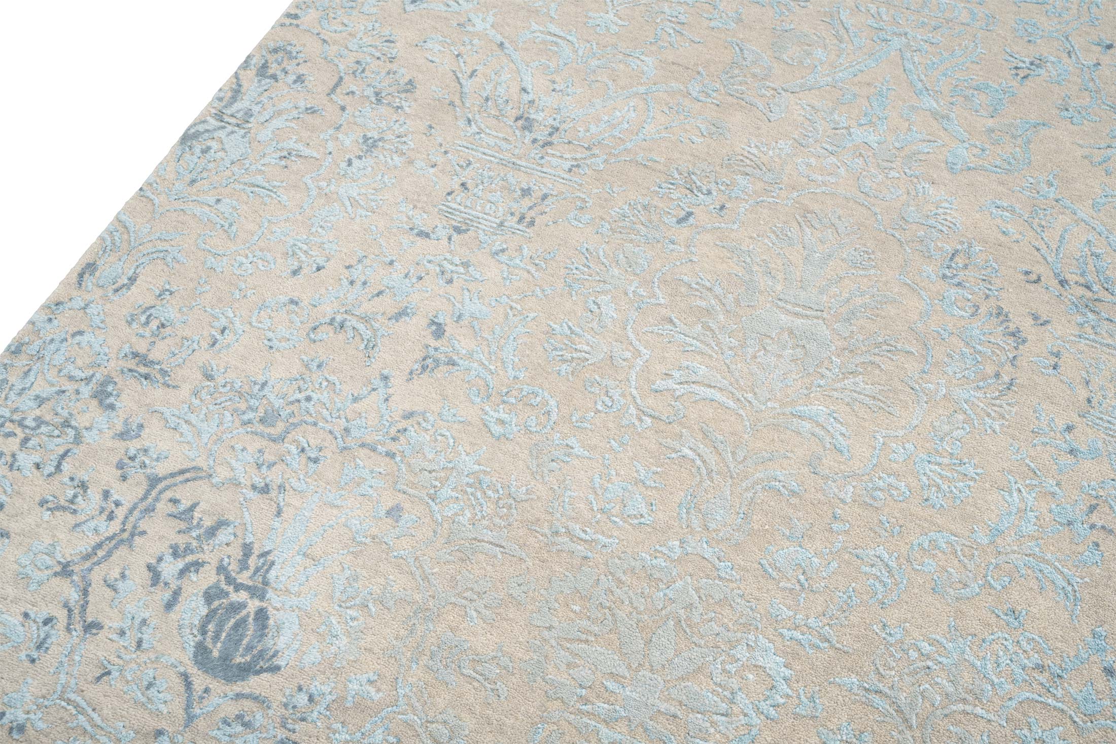 Dieser handgeknüpfte Teppich aus der Eterno-Kollektion strahlt in einer harmonischen Farbpalette von überwiegend sanften Beigetönen, die als Hauptfarbe dominieren. Die zweite bedeutende Farbe ist ein dezentes Hellblau, das sich kunstvoll in das Design einfügt und dem Teppich eine frische und elegante Note verleiht. Als dritte Farbe ergänzt ein dunkleres Blau das Gesamtbild, indem es subtile Akzente setzt und den klassischen Charme unterstreicht. Das Muster des Teppichs ist eine raffinierte ...mehr Beschreibung