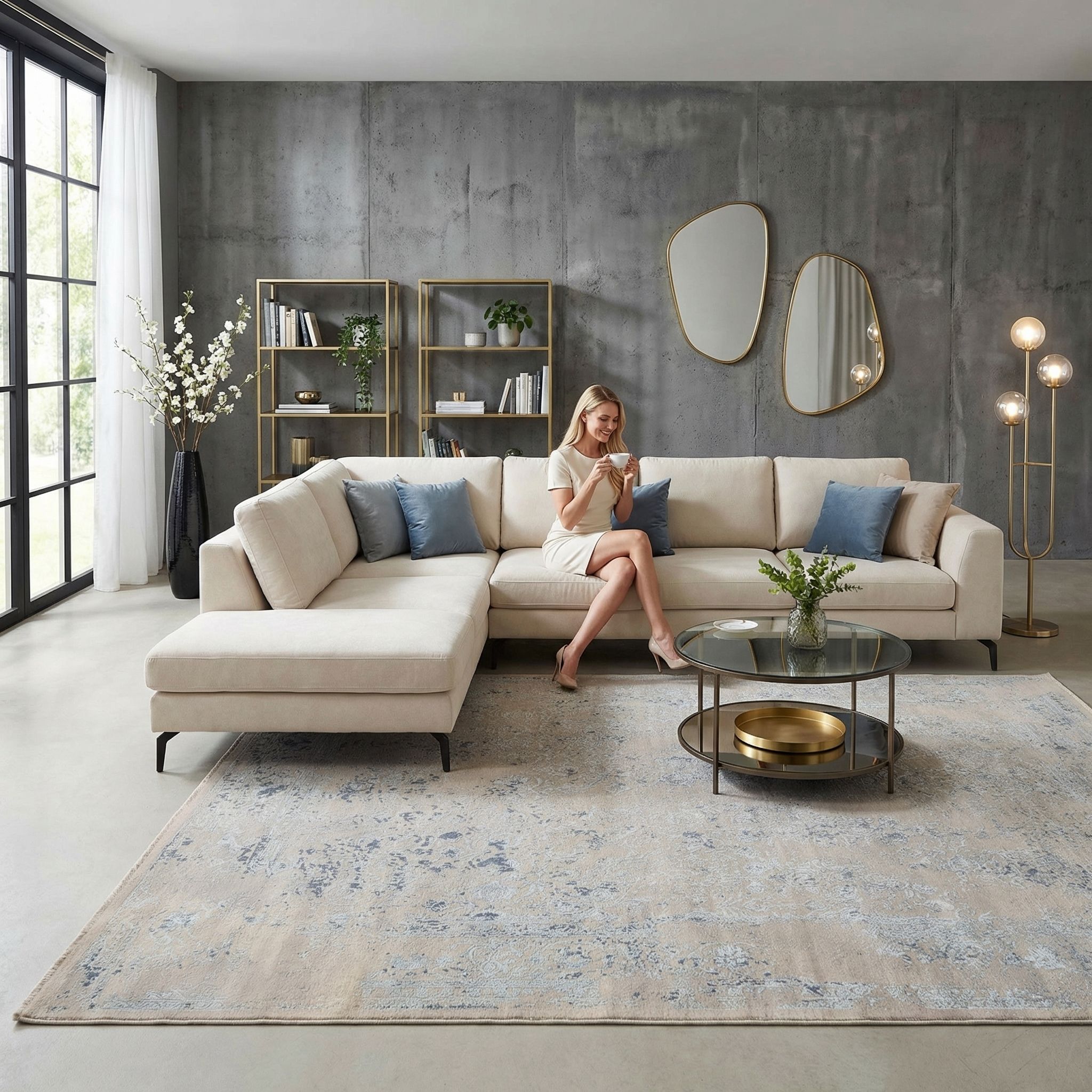 Als gekonnter Stilbruch lockert dieser Teppich die kühle Strenge des Industrial-Styles auf und bringt durch seine hochwertige Woll-Mischung notwendige Wärme auf raue Beton- oder Holzböden. Der angesagte "Eterno"-Vintage-Look mit seinen scheinbar verblassten Ornamenten korrespondiert hervorragend mit dem unperfekten Charme von unverputzten Wänden und Stahlmöbeln. Die kühlen Blau- und Graunuancen greifen die typische Farbpalette des Industriestils auf, während die weiche Bambusseide einen spannenden haptischen Kontrast zu harten Oberflächen bildet. So entsteht ein loftartiges Wohngefühl, das maskuline Coolness mit einladendem, wohnlichem Komfort verbindet.