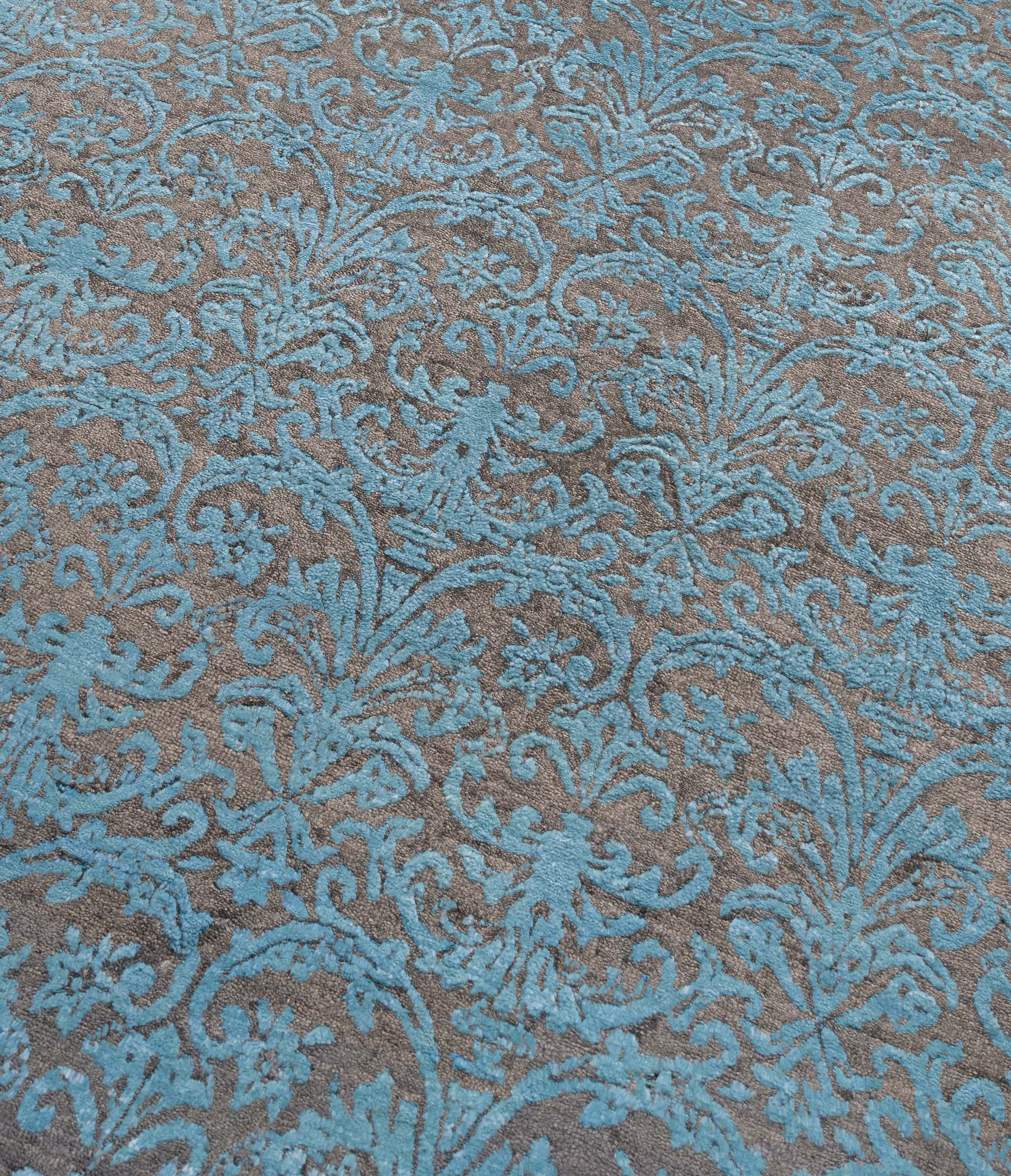 Tradition trifft auf zeitgenössischen Stil. Dieser handgeknüpfte Designerteppich aus der Collection Eterno besticht durch seine elegante Farbgebung und das raffinierte Muster. Die Hauptfarbe ist ein intensives Türkis, das durch ein feines Zusammenspiel mit einem warmen, erdigen Braun ergänzt wird. Diese harmonische Kombination wird durch subtile Grautöne vervollständigt, die dem Teppich eine moderne und dennoch zeitlose Ausstrahlung verleihen. Das Muster ist ein kunstvolles florales ...mehr Beschreibung