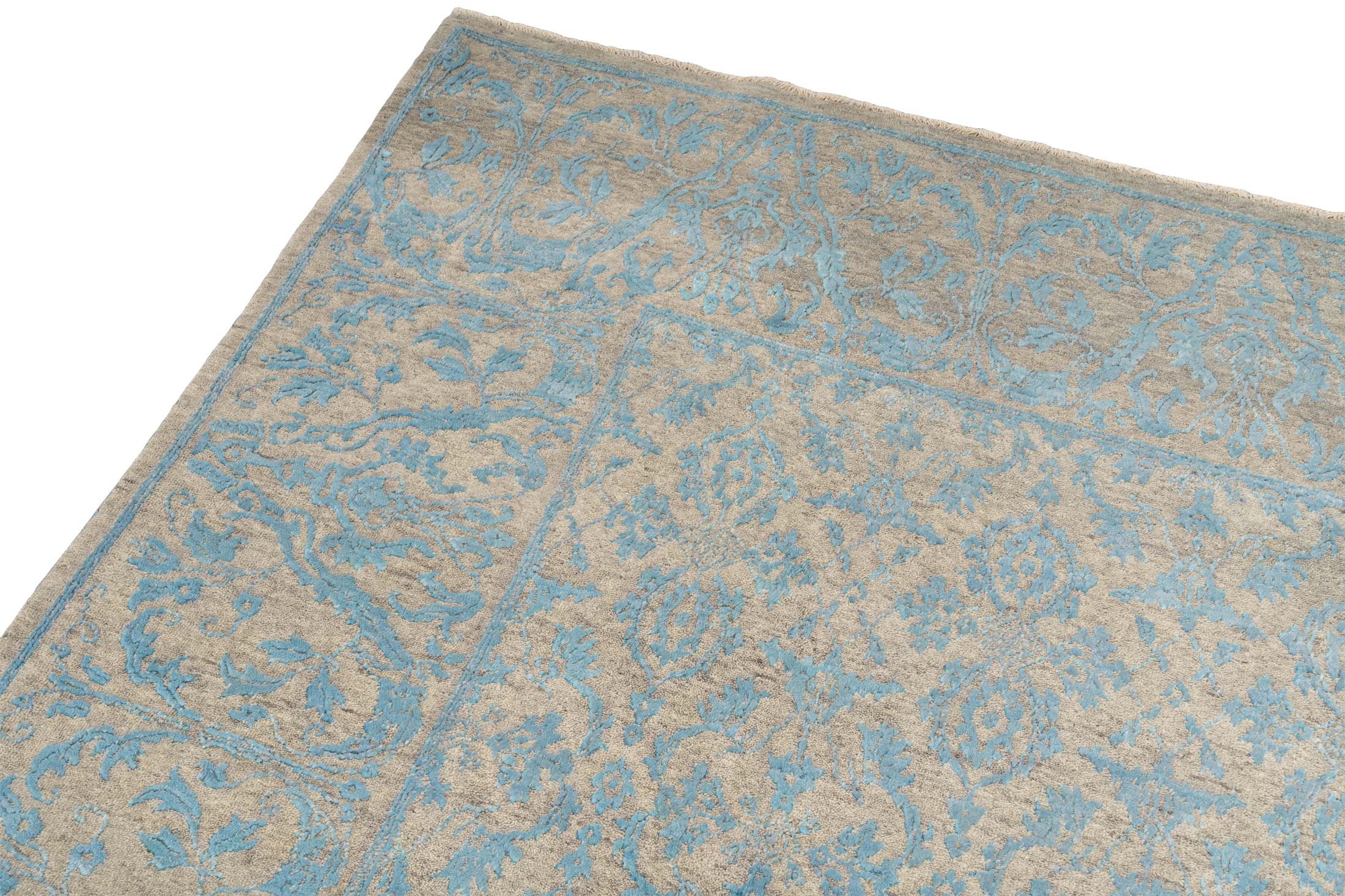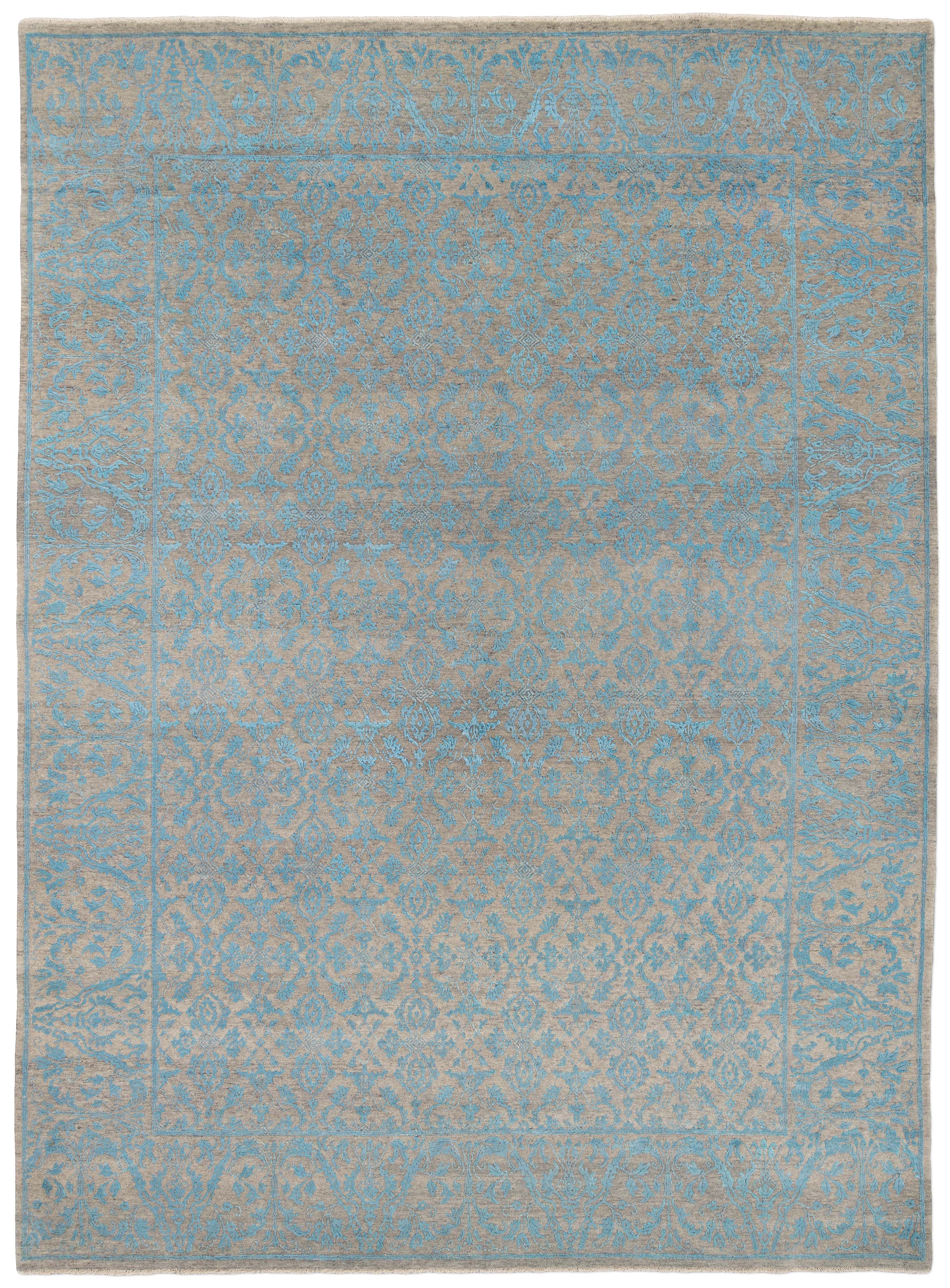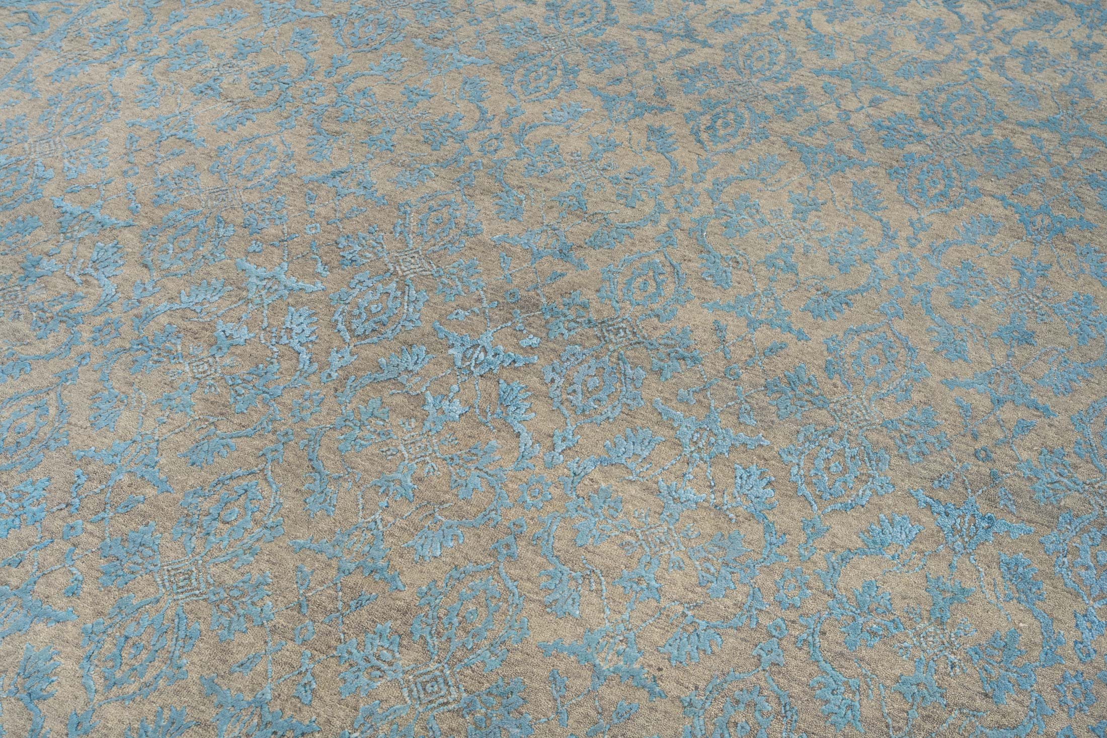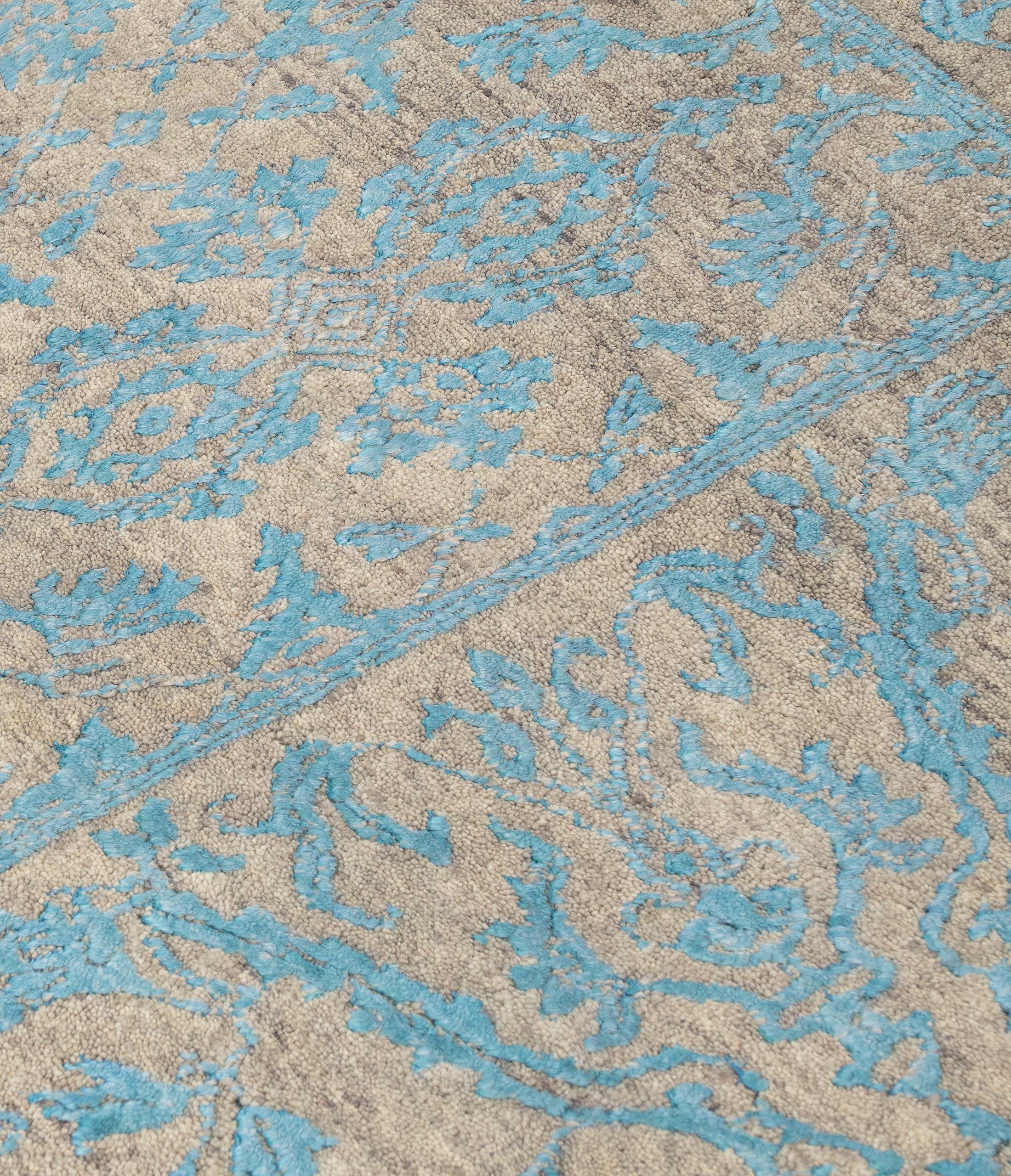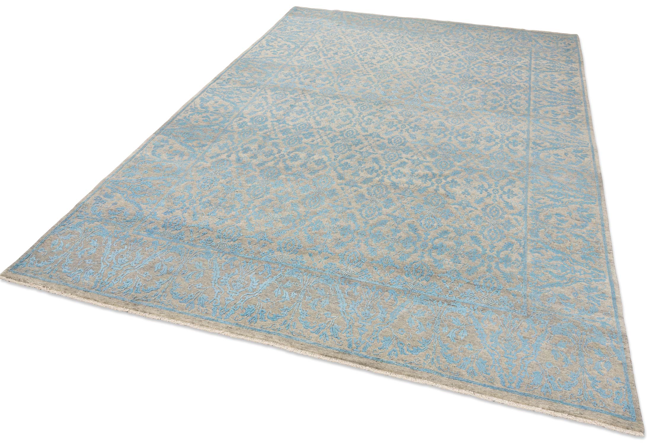 Dieser handgeknüpfte Designerteppich aus der Eterno-Kollektion besticht durch seine harmonische Farbgebung, die von einem sanften Beige dominiert wird. Ergänzt wird diese Hauptfarbe durch ein beruhigendes Hellblau, das kunstvoll in das florale Muster eingearbeitet ist. Traditionelles Design neu interpretiert - mit moderner Note und feinem Hauch von Eleganz, welche durch die Verwendung hochwertiger Materialien wie handkardierter Schafwolle und glänzender Bambusseide noch verstärkt wird. Der Teppich zeigt eine feine Knüpfung mit persischen Knoten, die seine Langlebigkeit und Strapazierfähigkeit unterstreichen. Jeder Teppich wird in aufwendiger Handarbeit gefertigt, wobei der Reliefschnitt dem Design Tiefe und Charakter verleiht. Diese Unikate sind nicht nur ein Blickfang, sondern auch ein Zeugnis für höchste Handwerkskunst, die ausschließlich natürliche Materialien verwendet. Ein Eterno-Teppich bringt Wärme und Stil in jedes Zuhause und kann auf Wunsch in nahezu jeder Größe angefertigt werden.