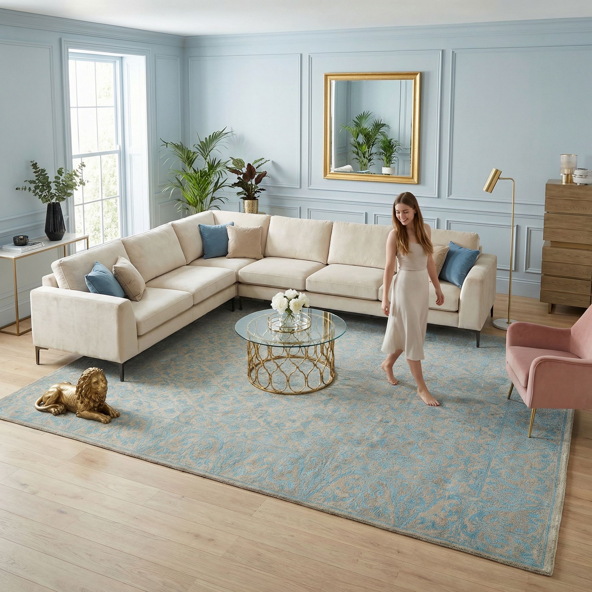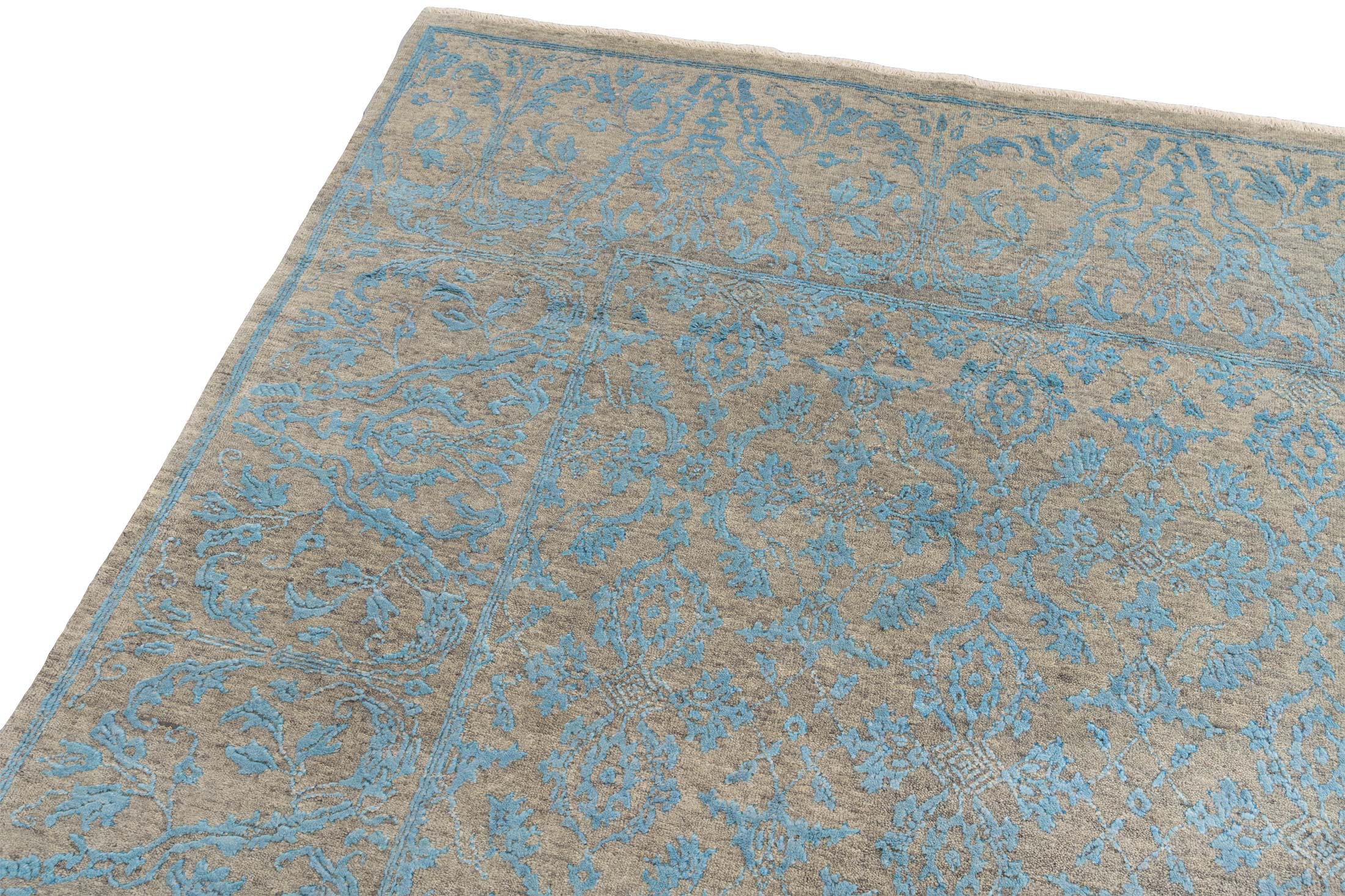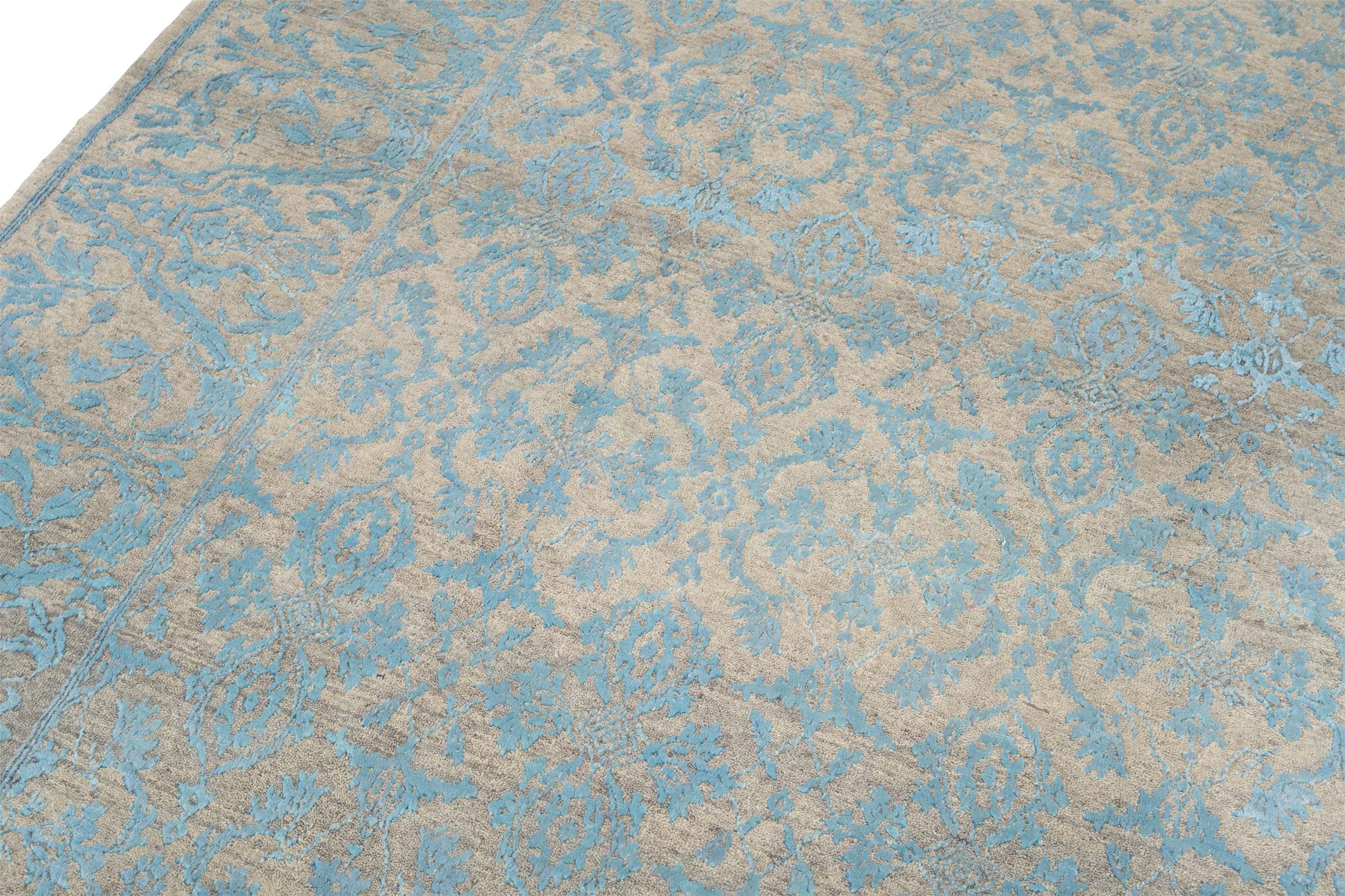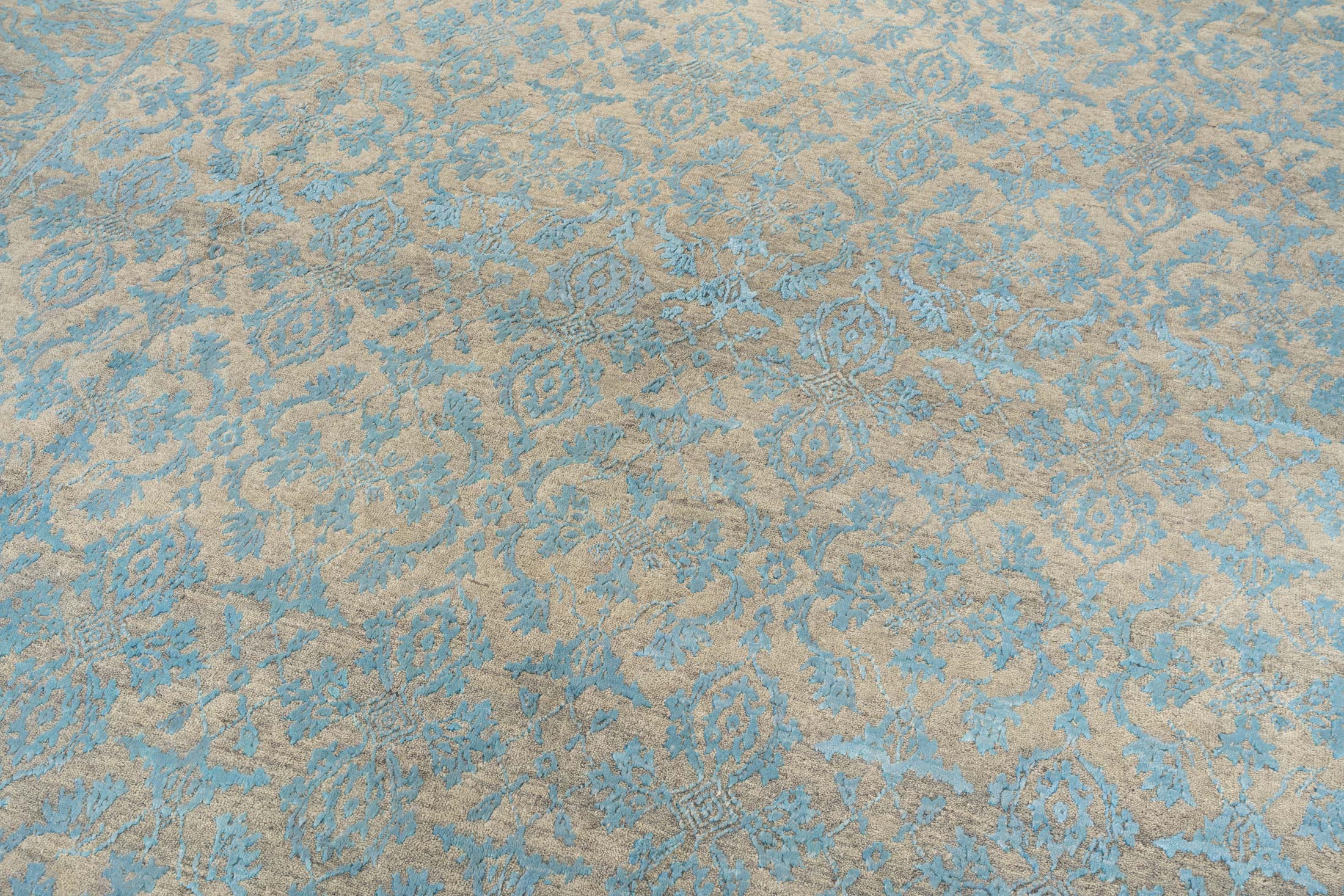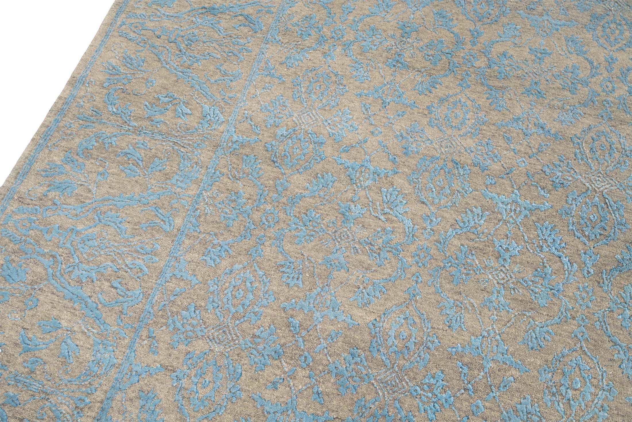 Dieser handgeknüpfte Designerteppich aus der Eterno-Kollektion besticht durch seine harmonische Farbgebung, die von einem sanften Beige dominiert wird. Ergänzt wird diese Hauptfarbe durch ein beruhigendes Hellblau, das kunstvoll in das florale Muster eingearbeitet ist. Traditionelles Design neu interpretiert - mit moderner Note und feinem Hauch von Eleganz, welche durch die Verwendung hochwertiger Materialien wie handkardierter Schafwolle und glänzender Bambusseide noch verstärkt wird. Der Teppich zeigt eine feine Knüpfung mit persischen Knoten, die seine Langlebigkeit und Strapazierfähigkeit unterstreichen. Jeder Teppich wird in aufwendiger Handarbeit gefertigt, wobei der Reliefschnitt dem Design Tiefe und Charakter verleiht. Diese Unikate sind nicht nur ein Blickfang, sondern auch ein Zeugnis für höchste Handwerkskunst, die ausschließlich natürliche Materialien verwendet. Ein Eterno-Teppich bringt Wärme und Stil in jedes Zuhause und kann auf Wunsch in nahezu jeder Größe angefertigt werden.