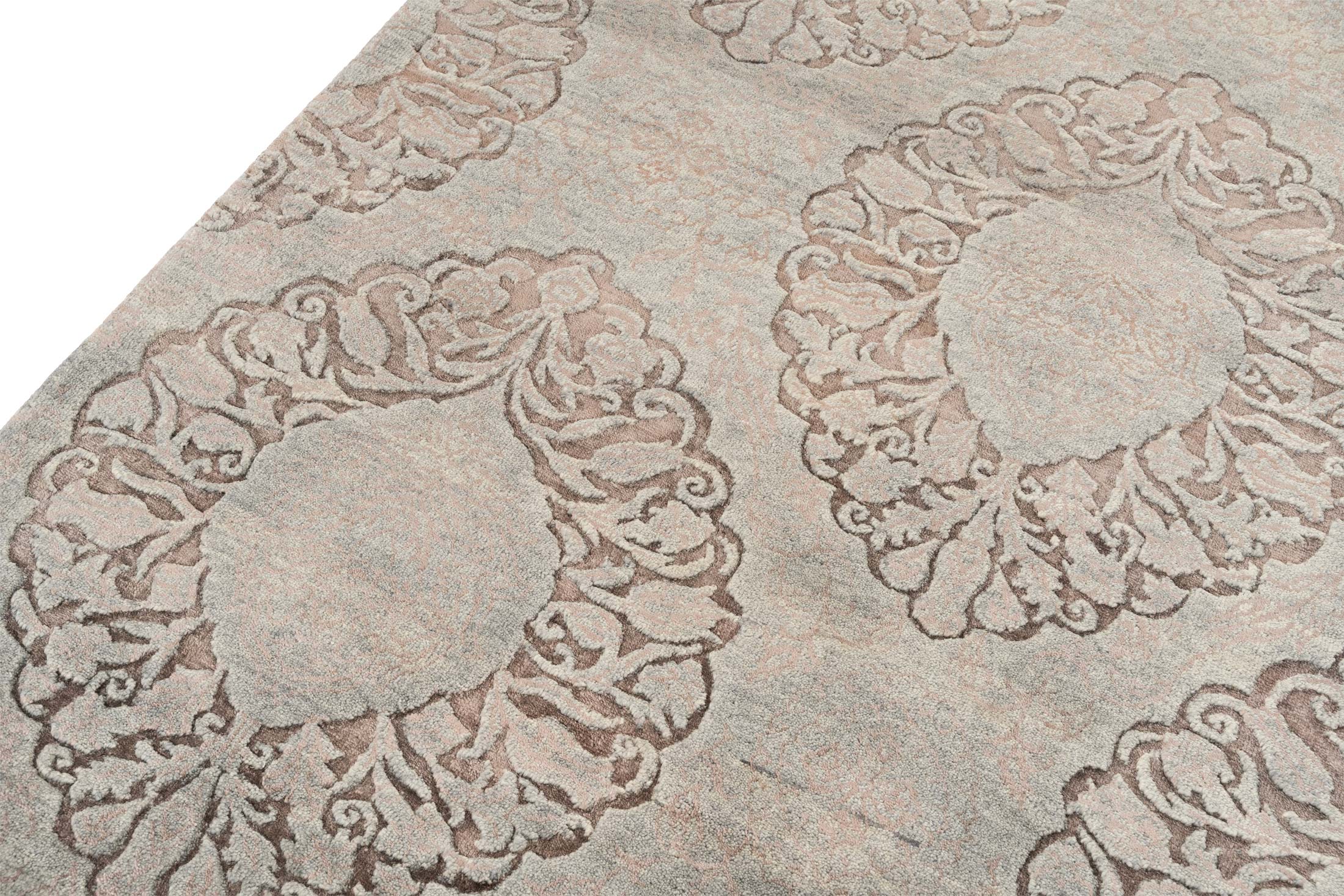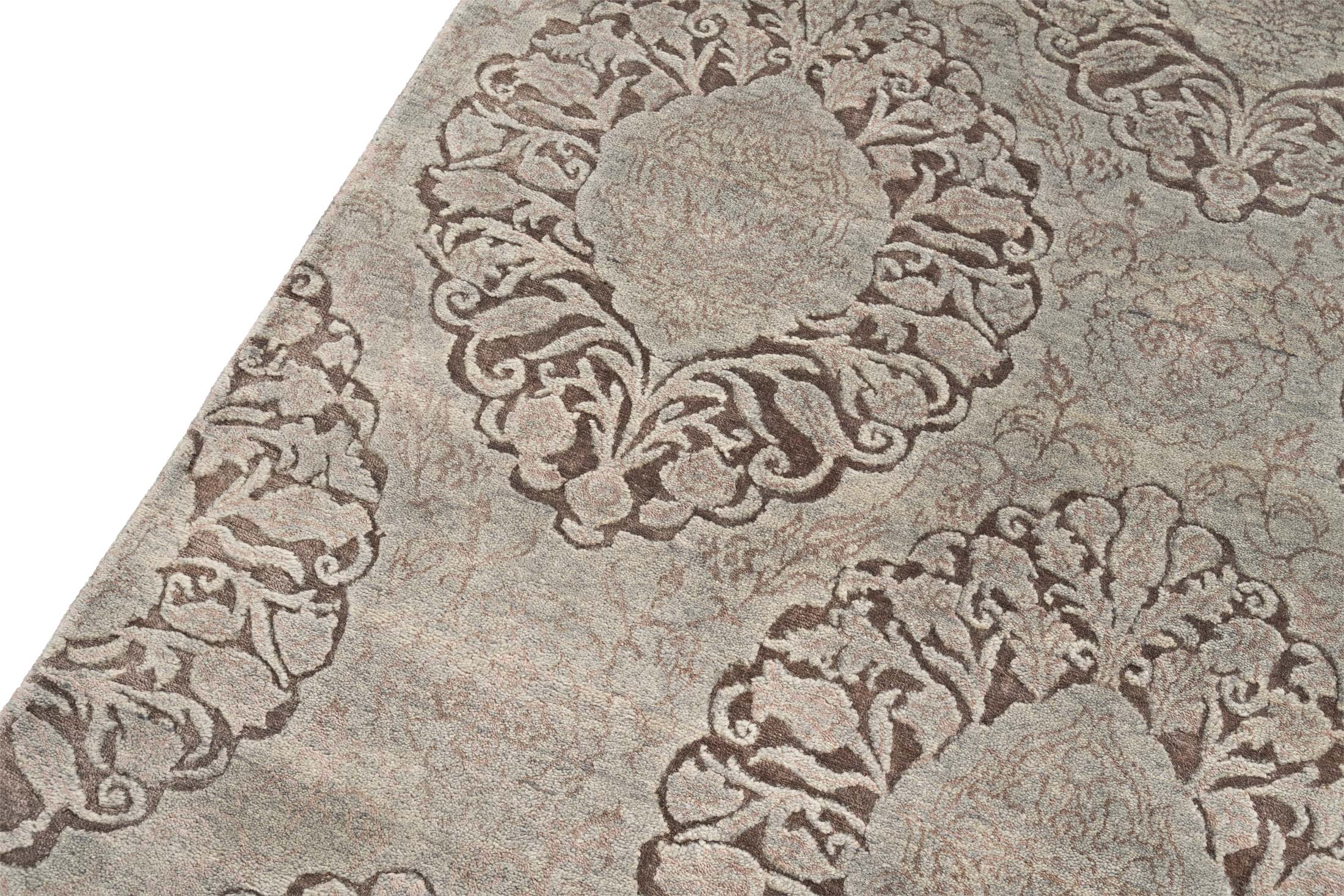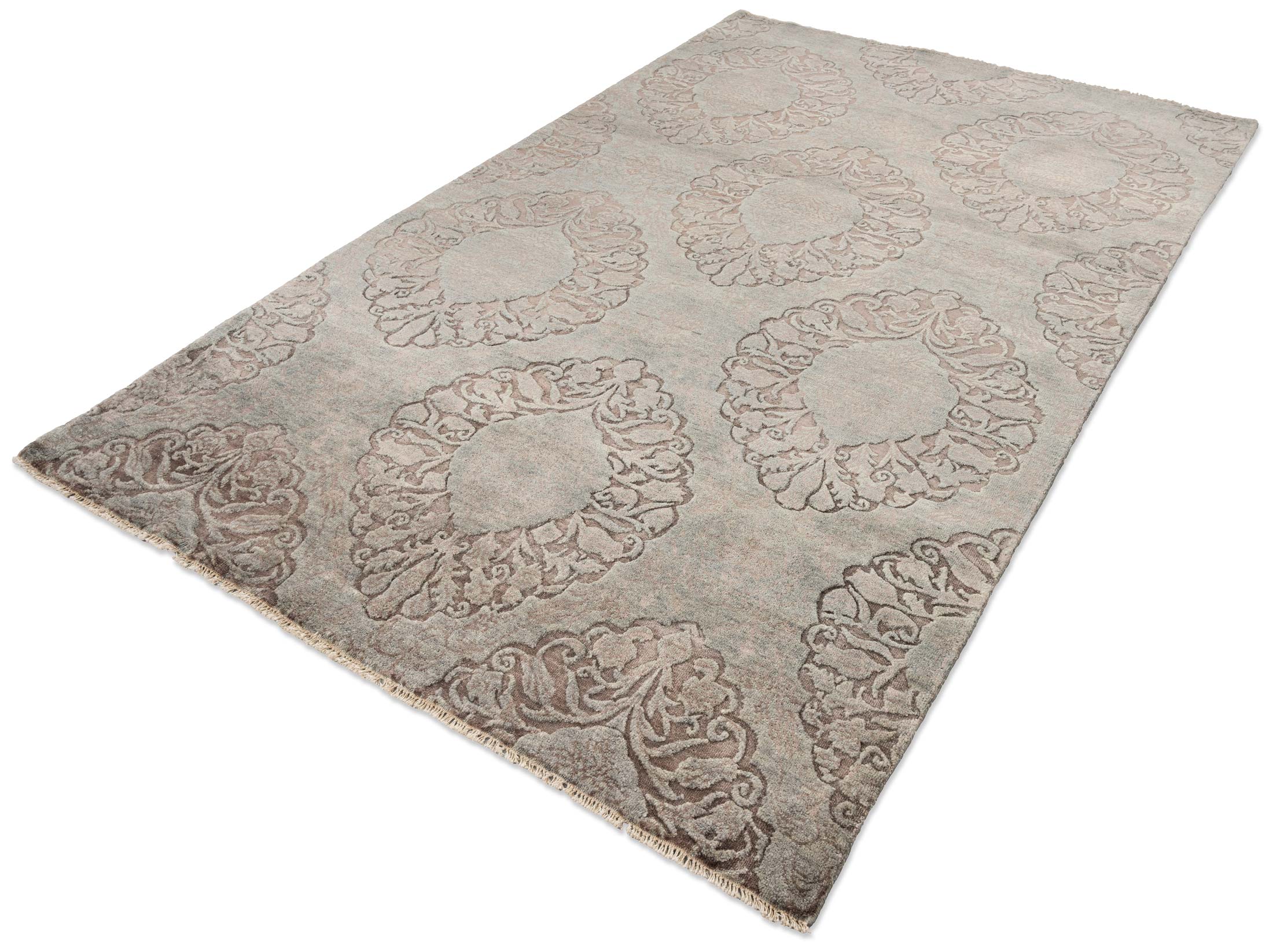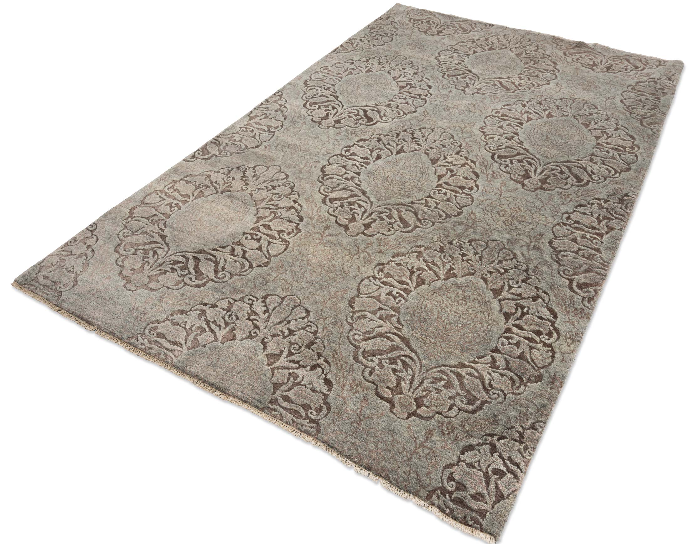Dieser handgeknüpfte Teppich aus der Eterno-Kollektion besticht durch seine elegante Farbgebung und hochwertige Materialien. Die Hauptfarbe ist ein sanftes Graublau, das eine beruhigende und zeitlose Basis bietet. Dazu gesellen sich Nuancen von warmem Braun, das in den kunstvollen Mustern hervorsticht und dem Teppich Tiefe und Charakter verleiht. Ein dezentes Beige rundet das Farbspektrum ab, wodurch ein harmonisches Gesamtbild entsteht. Das Design zeigt ein symmetrisches Muster mit ...mehr Beschreibung