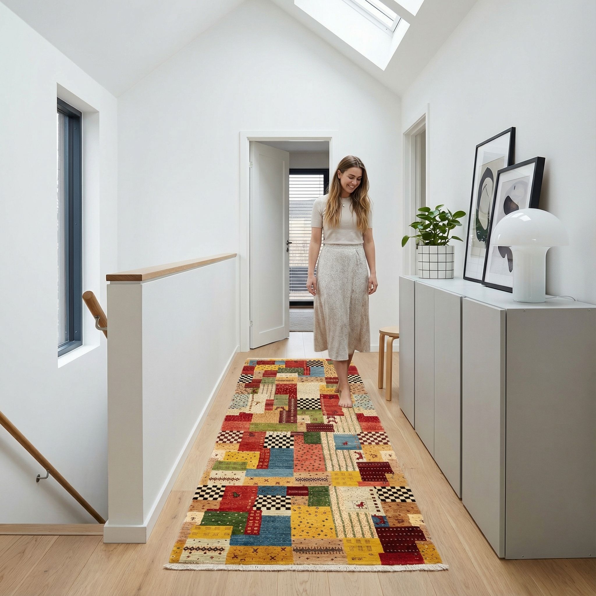 Dieser Bidjar-Novum-Teppich besticht durch seine warme, rote Hauptfarbe, die durch Gelb und Blau ergänzt wird. Die harmonische Farbpalette wird durch ein lebhaftes Zusammenspiel weiterer Töne wie Grün, Schwarz und Weiß ergänzt, was dem Teppich ein fröhliches und vielseitiges Erscheinungsbild verleiht. Die Musterung ist von traditionellen Nomadenmotiven inspiriert, bestehend aus geometrischen Formen und stilisierten Figuren, die modern arrangiert sind. Mit etwa 260.000 Knoten pro Quadratmeter zeigt dieser Teppich eine außergewöhnlich feine Knüpfung. Er wurde aus handversponnener Schafwolle gefertigt und mit natürlichen Farben gefärbt, was ihm eine besondere Strapazierfähigkeit und Langlebigkeit verleiht. Die unterschiedlichen Farbnuancen und die variierende Materialstruktur unterstreichen die handgefertigte Qualität und Einzigartigkeit dieses originalen Stücks aus dem persischen Kurdistan. Ein wahrer Schatz für jeden Raum, der sowohl traditionelles Handwerk als auch moderne Ästhetik verkörpert. ...