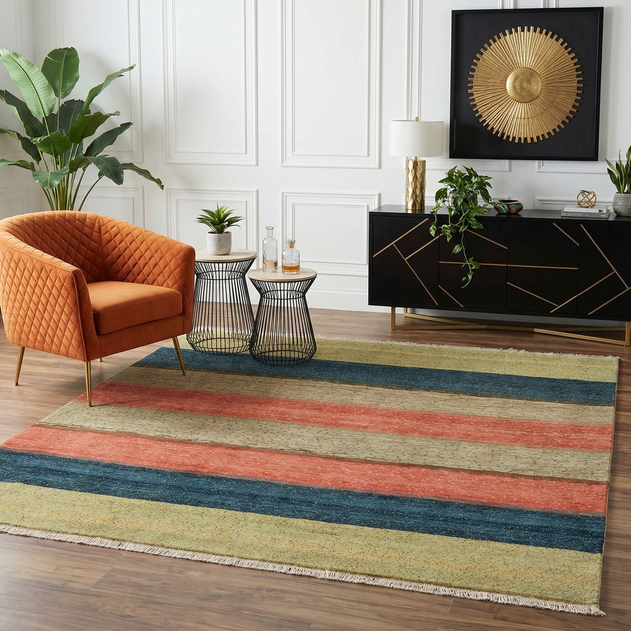Dieser handgeknüpfte Bidjar-Novum Teppich präsentiert sich in einem harmonischen Zusammenspiel aus warmen, erdigen Farben. Die Hauptfarbe ist ein kräftiges Ziegelrot, das dem Teppich eine lebendige Ausstrahlung verleiht. Ergänzt wird das Farbspiel durch ein tiefes Blau und ein sanftes Olivgrün, die dem Gesamtbild eine beruhigende Balance geben. Diese Farbnuancen sind in horizontalen Streifen angeordnet, die durch ihre klare Struktur eine moderne Note erhalten.