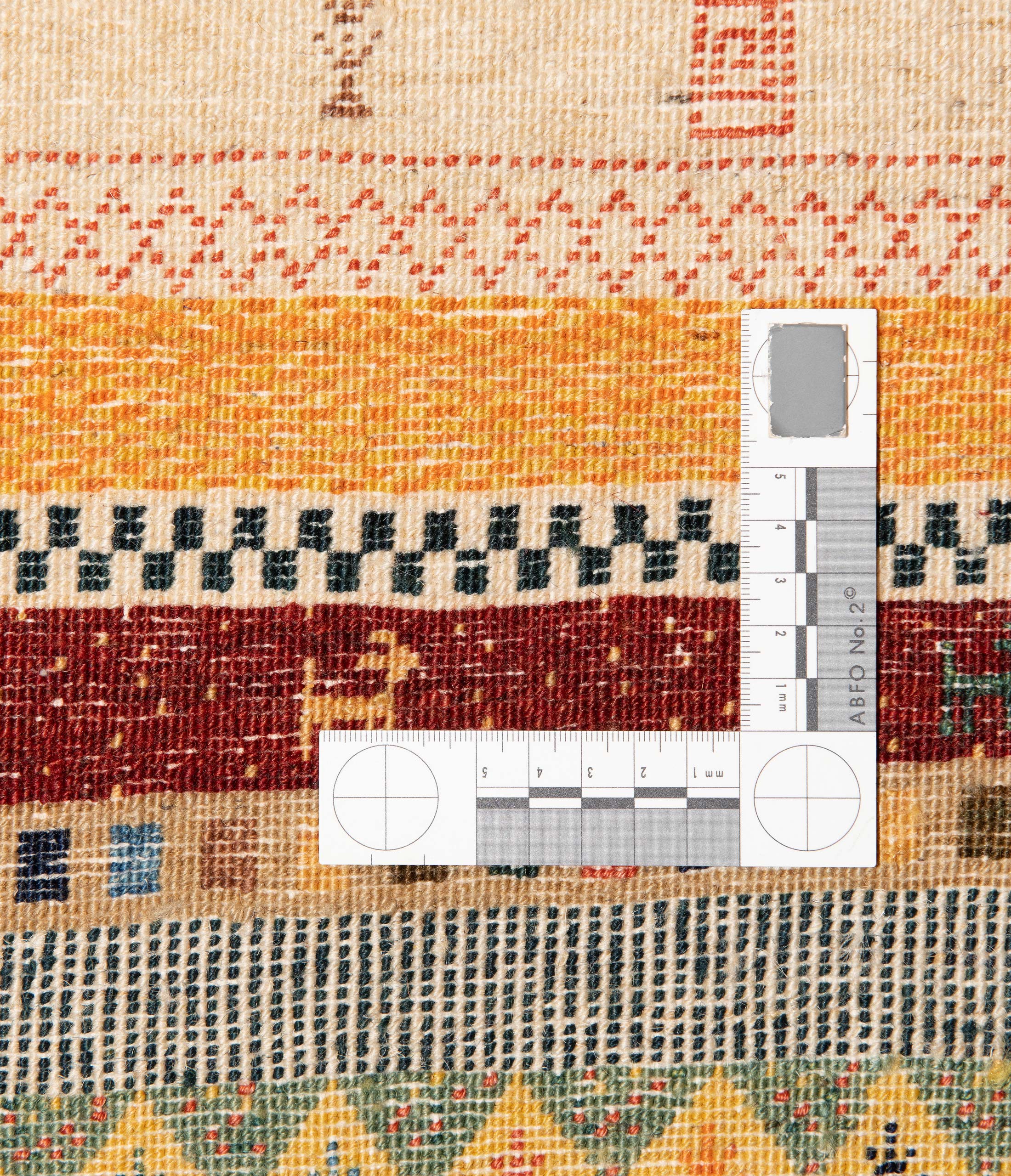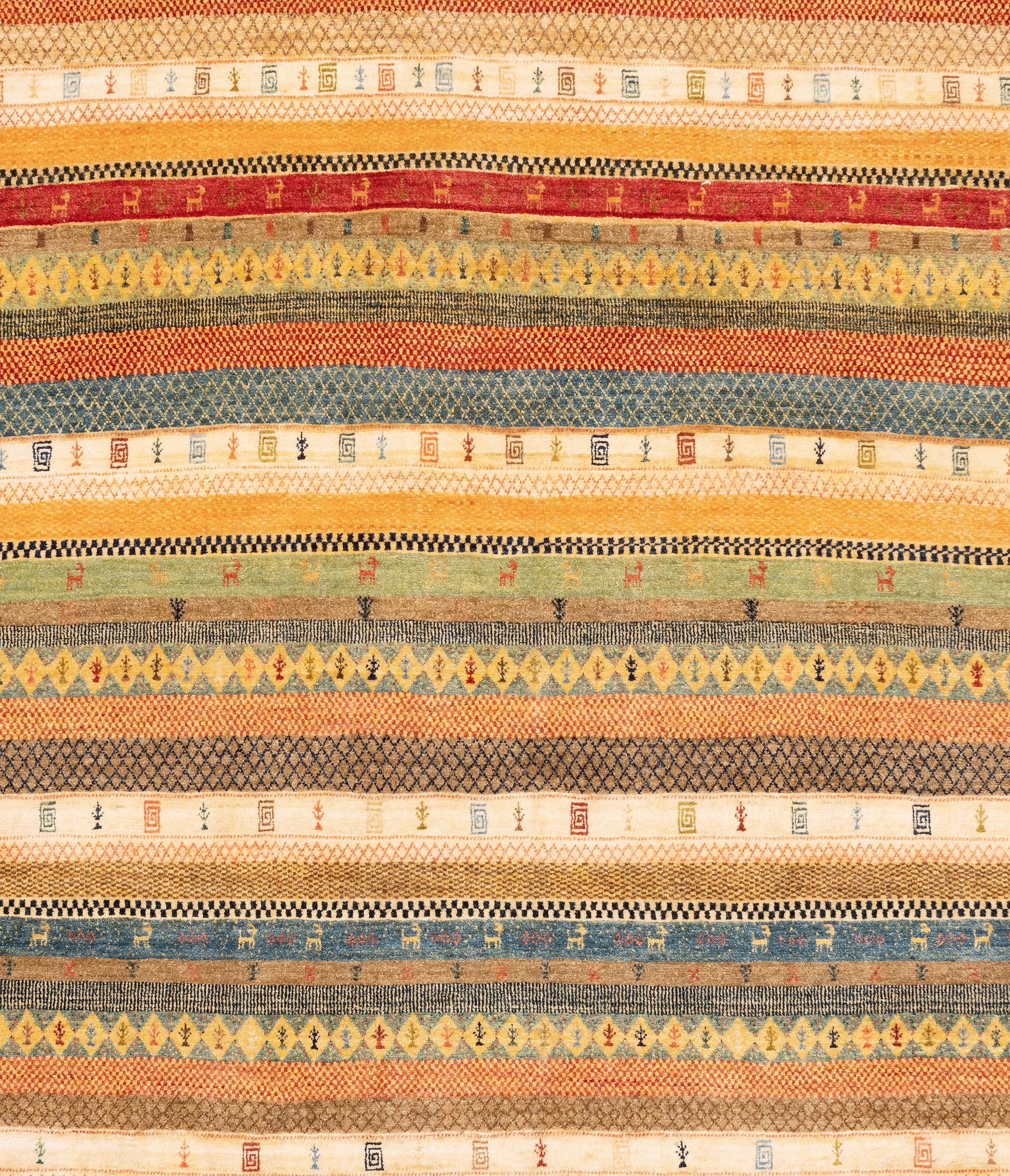 Dieser handgeknüpfte Bidjar-Novum Teppich aus Persien beeindruckt durch seine harmonische Farbpalette und künstlerische Musterung. Die Hauptfarbe ist ein warmes Goldgelb, das den Teppich lebendig und einladend erscheinen lässt. Begleitet wird diese Farbe von einem tiefen Rot und einem satten Blau, die den Teppich kontrastreich und ausgewogen gestalten. Die Musterung ist reich an Details und vereint traditionelle Nomadenmotive mit modernen Elementen, was dem Teppich eine dynamische und dennoch zeitlose Ausstrahlung verleiht.