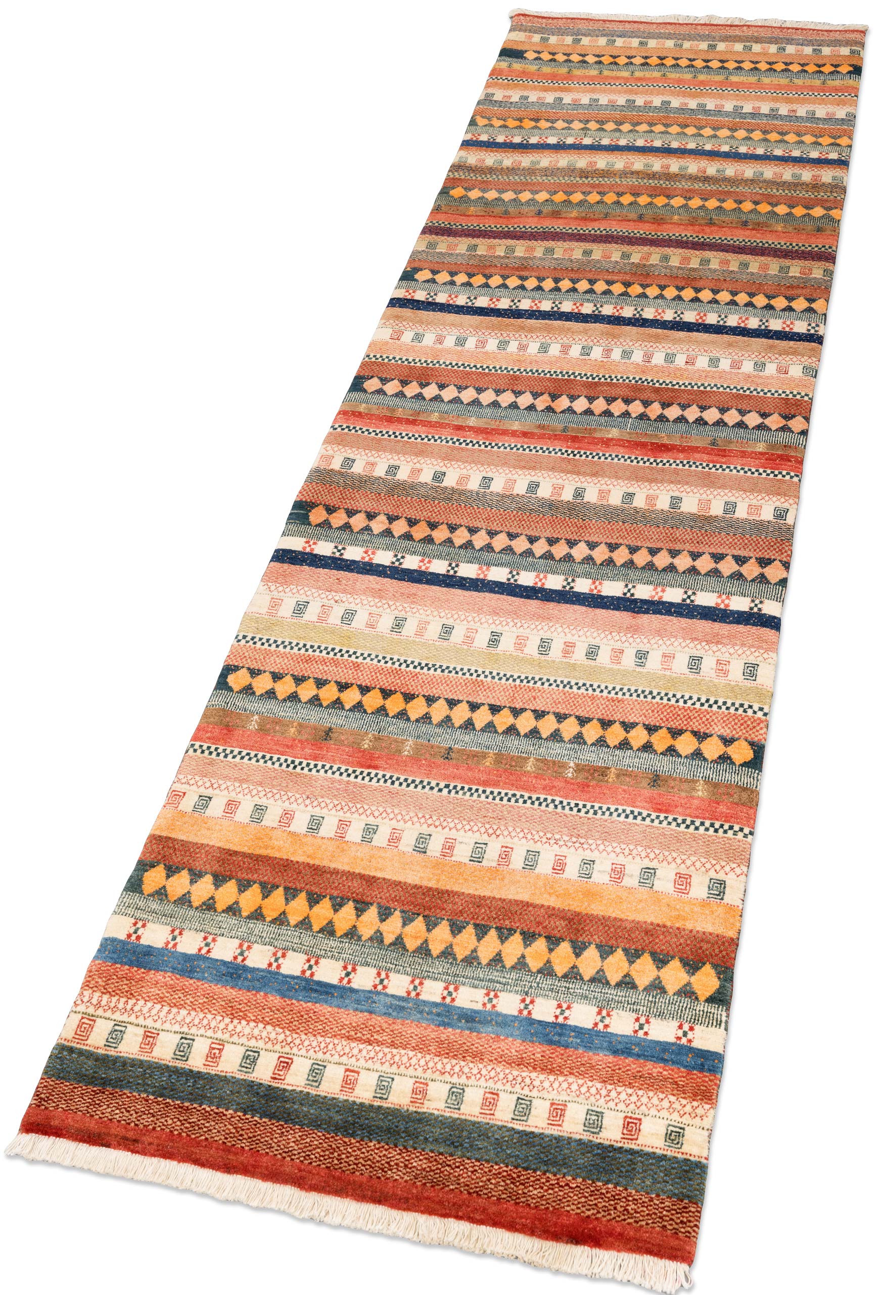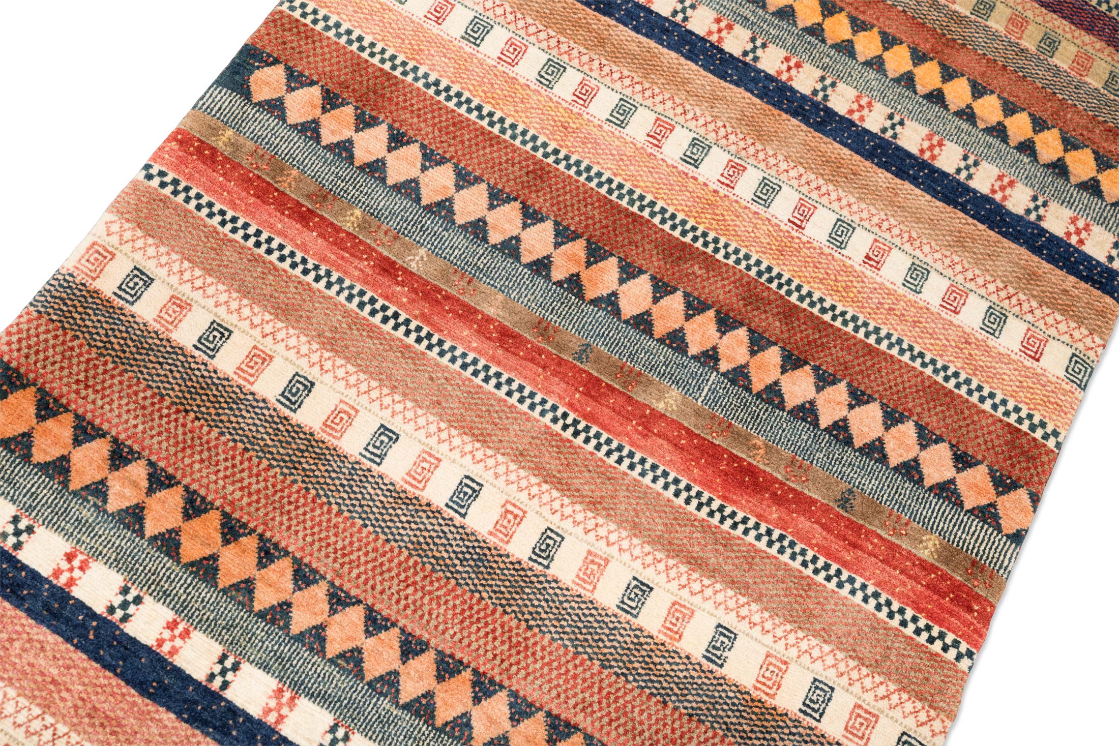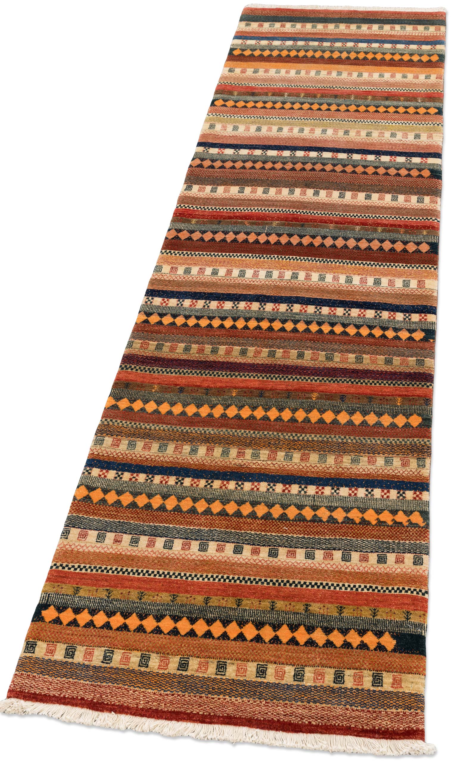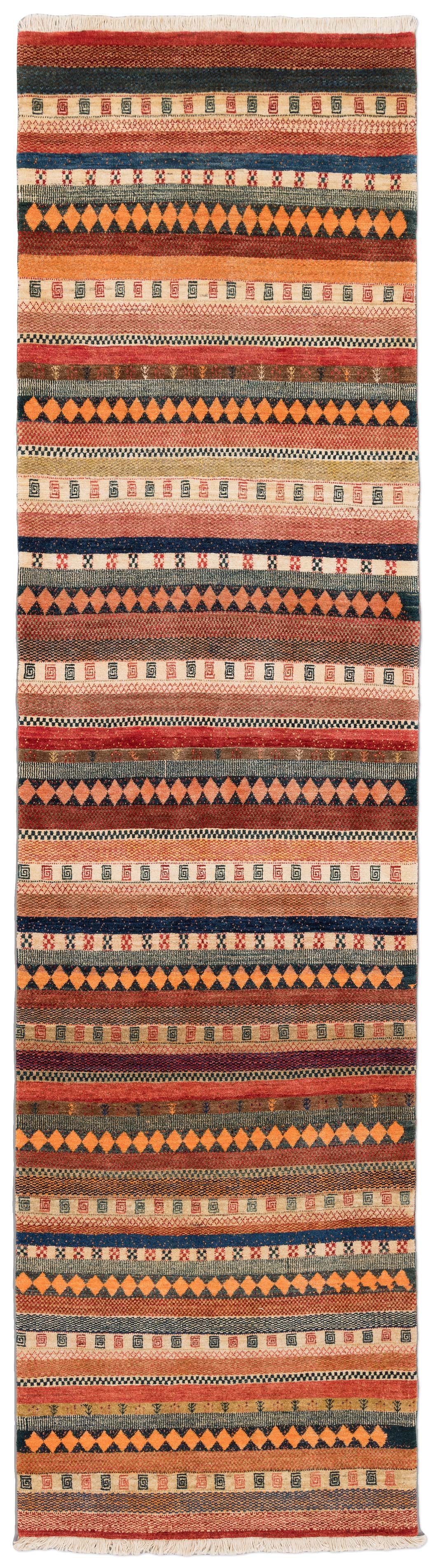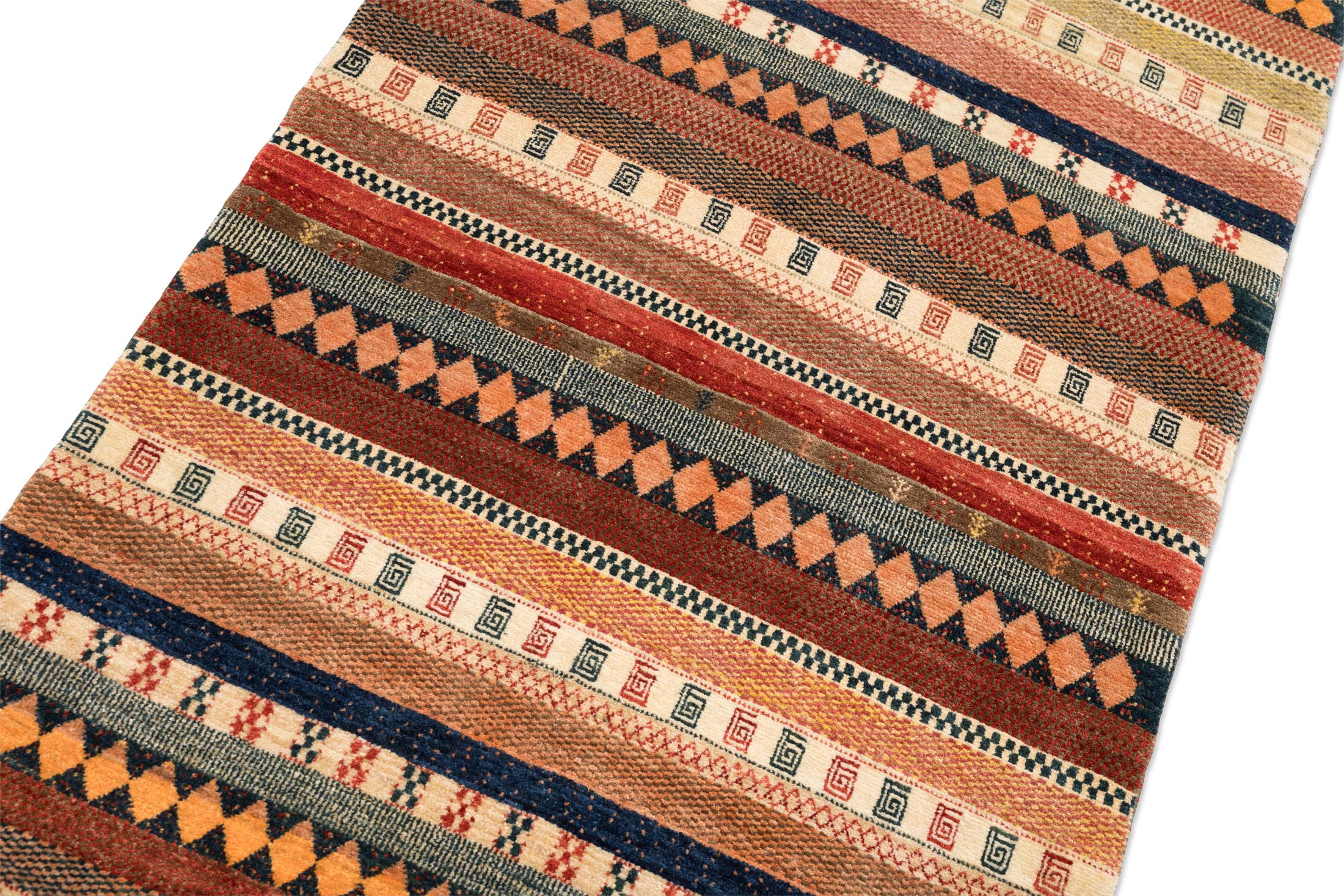 Das Muster ist modern arrangierte Nomadenornamentik in klarer Streifenkomposition. Über die gesamte Länge wechseln breite und schmale Horizontalbänder mit unterschiedlichen Strukturen: Rautenreihen in Orange auf dunklem Grund, kleine Spiral und Hakenmotive in wiederkehrenden Bordüren, feine Zickzacklinien und punktierte Reihen. Die vielen Detailwechsel erzeugen eine textile Bildwirkung, bleiben aber durch die regelmäßige Streifenordnung harmonisch. Gefertigt aus handversponnener Schafwolle mit Naturfarben, hochfein geknüpft mit ca. 200000 Knoten per qm, ist dieser Teppich eine Eigenproduktion der Firma Mesgarzadeh und ein authentisches Original aus dem persischen Kurdistan, strapazierfähig und unempfindlich im Alltag.