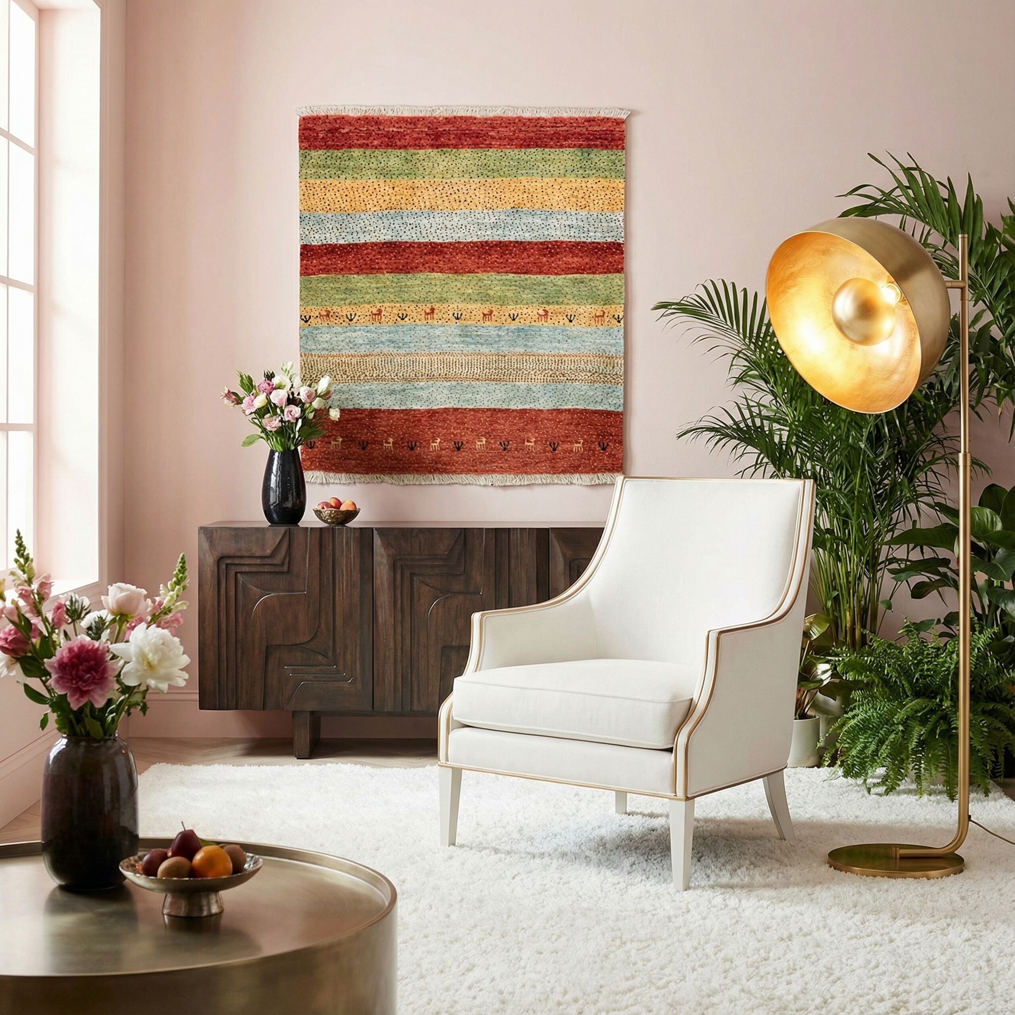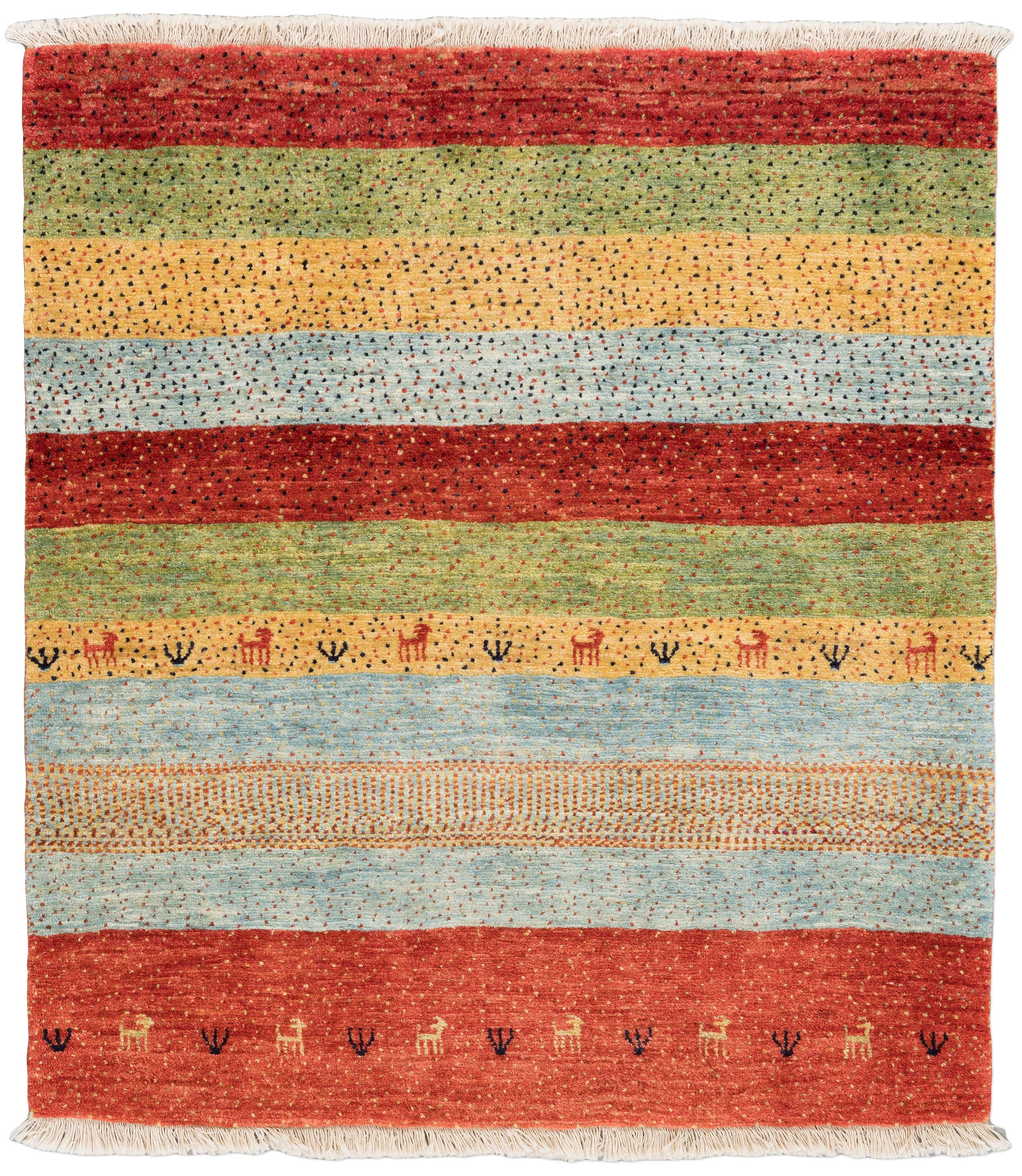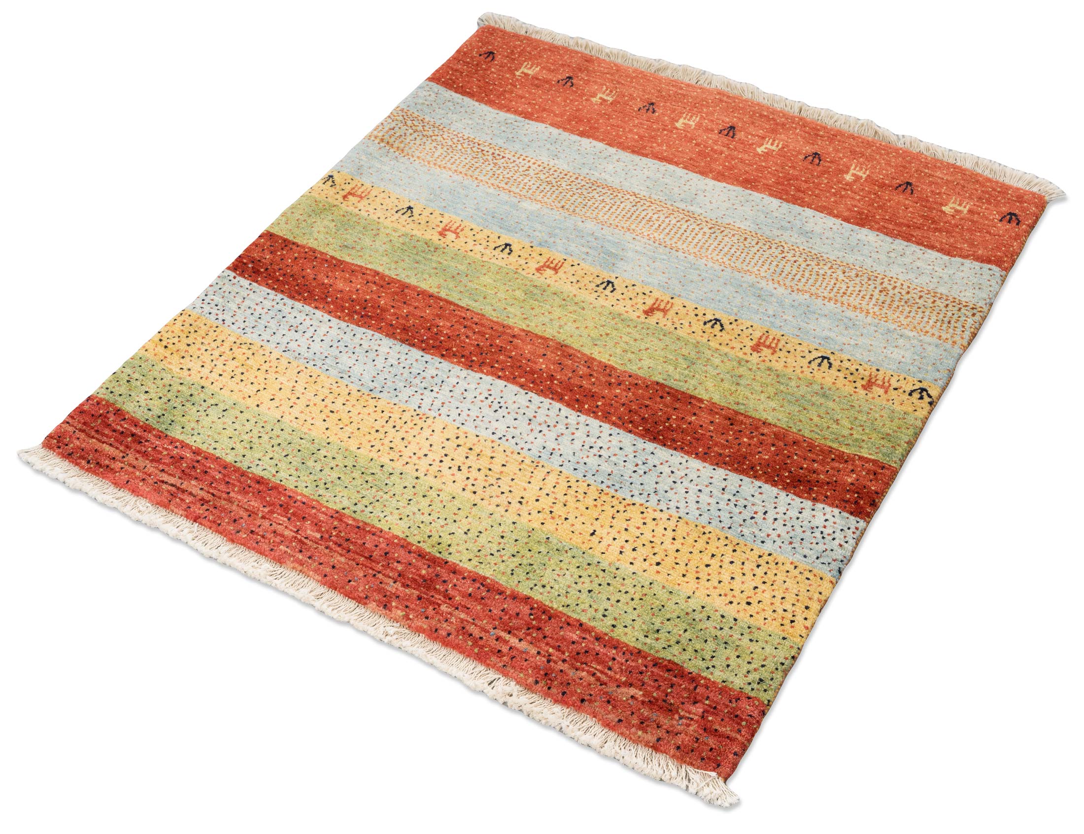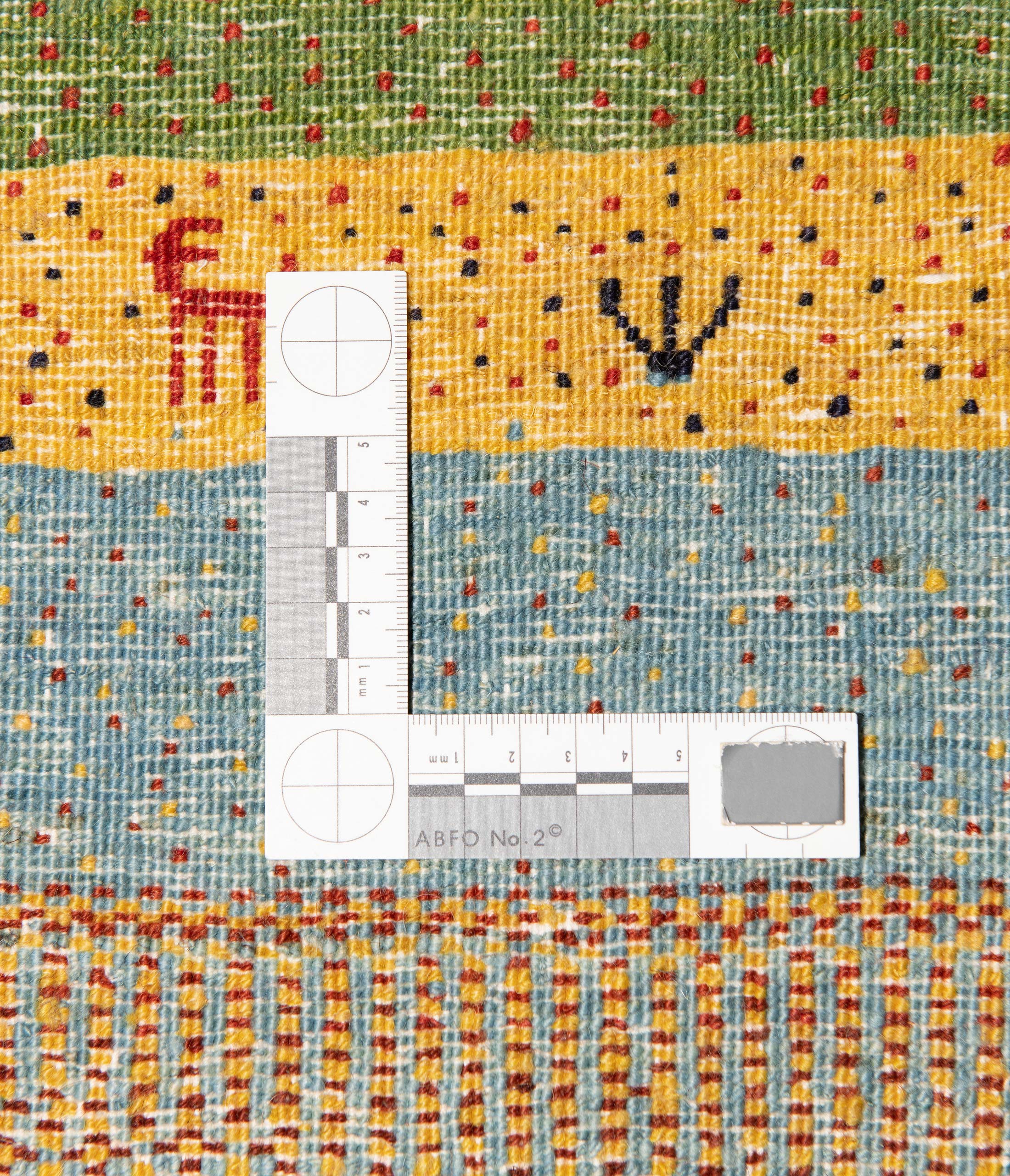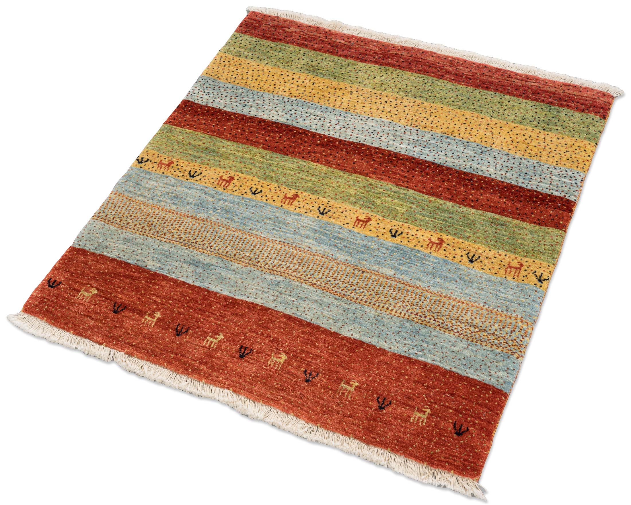 Die Musterung des Teppichs ist geprägt von horizontalen Streifen, die in unterschiedlichen Breiten und Farben angeordnet sind. Diese Streifen sind mit kleinen, punktartigen Details versehen, die dem Design eine dezente Lebendigkeit verleihen. Zwischen den Streifen finden sich kleine, stilisierte Tiermotive, die an die reiche Tradition der Nomaden erinnern und dem Teppich einen zusätzlichen Hauch von Authentizität verleihen.