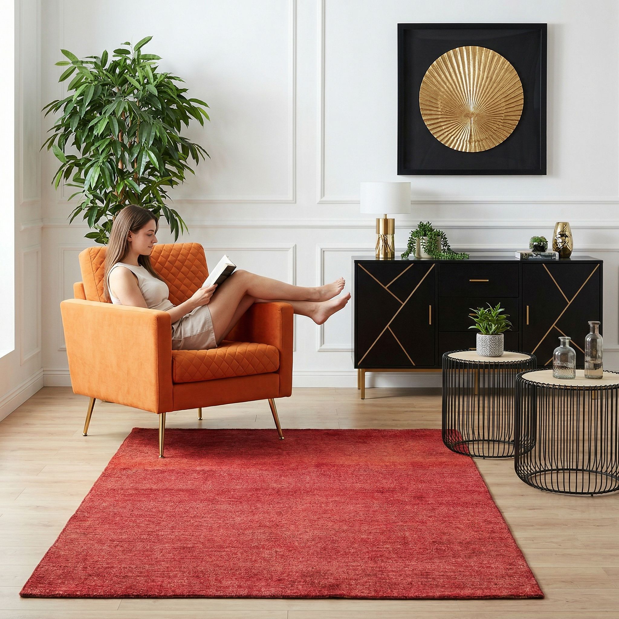 Während der skandinavische Stil meist auf helle Töne setzt, dient dieser Teppich als kraftvoller, wärmender Akzent, der der nordischen Kühle ein „Hygge“-Upgrade verpasst. Das reduzierte Design und der Fokus auf nachhaltige, natürliche Materialien wie feinste Schafwolle passen perfekt zur nordischen Philosophie von Qualität und Langlebigkeit. Das tiefe Rot fungiert als optischer Anker in hellen, minimalistischen Räumen und verhindert, dass das Interieur zu steril oder kühl wirkt. Mit seiner unvergleichlich weichen Oberfläche und der natürlichen Farbstruktur bringt er genau die Geborgenheit, die das skandinavische Zuhause so erstrebenswert macht.