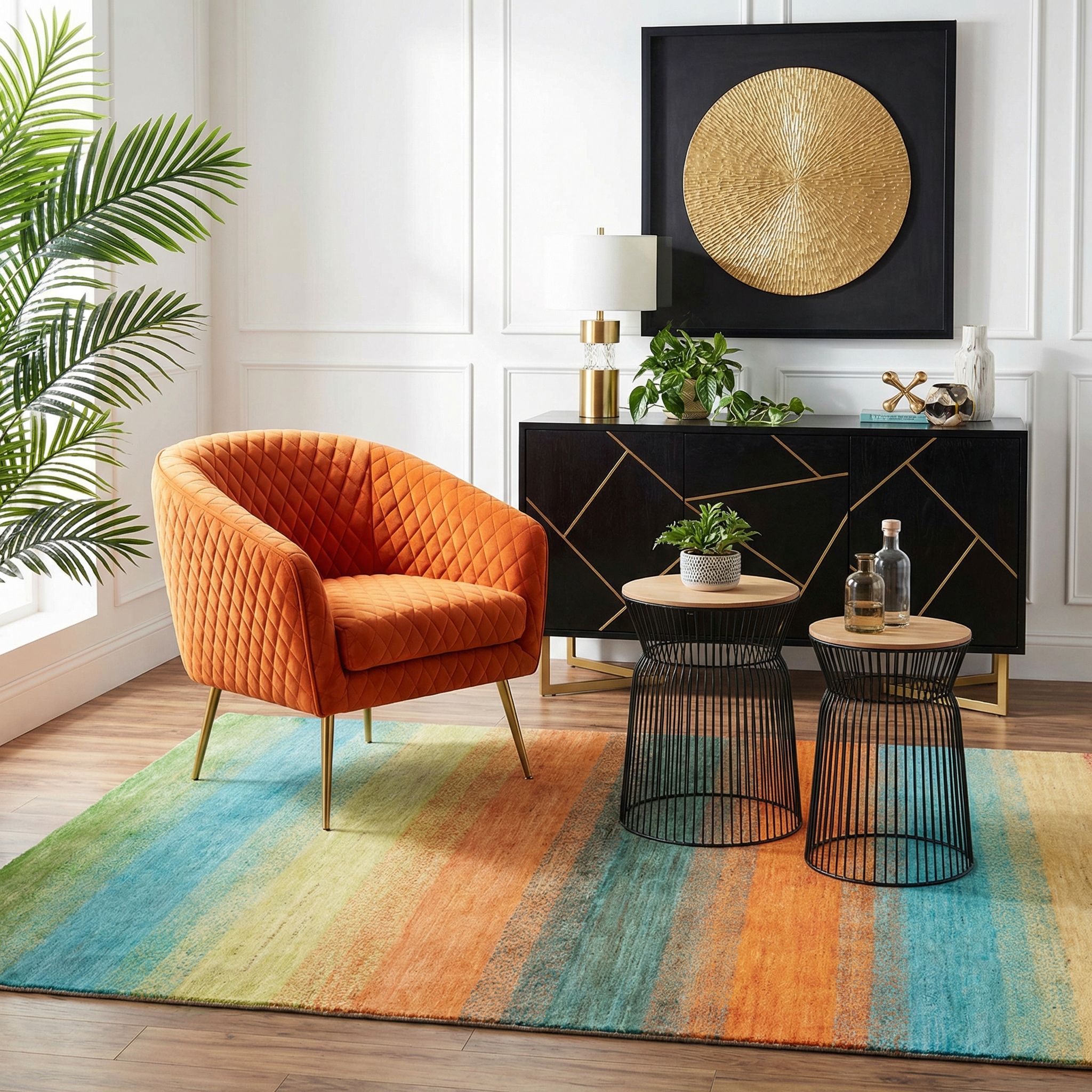 Hier präsentieren wir einen beeindruckenden, handgeknüpften Zarubi-Teppich aus Afghanistan. Die Hauptfarbe ist ein lebhaftes Türkis, das den Teppich in Szene setzt und von einem warmen Orange begleitet wird. Ergänzt wird die Farbpalette durch ein sanftes Gelb und ein kräftiges Korallenrot. Die harmonische Kombination dieser Farben verleiht dem Teppich eine fröhliche und lebendige Ausstrahlung, die jedes Zimmer bereichert.Die Musterung ist einfach, aber elegant, mit horizontalen ...