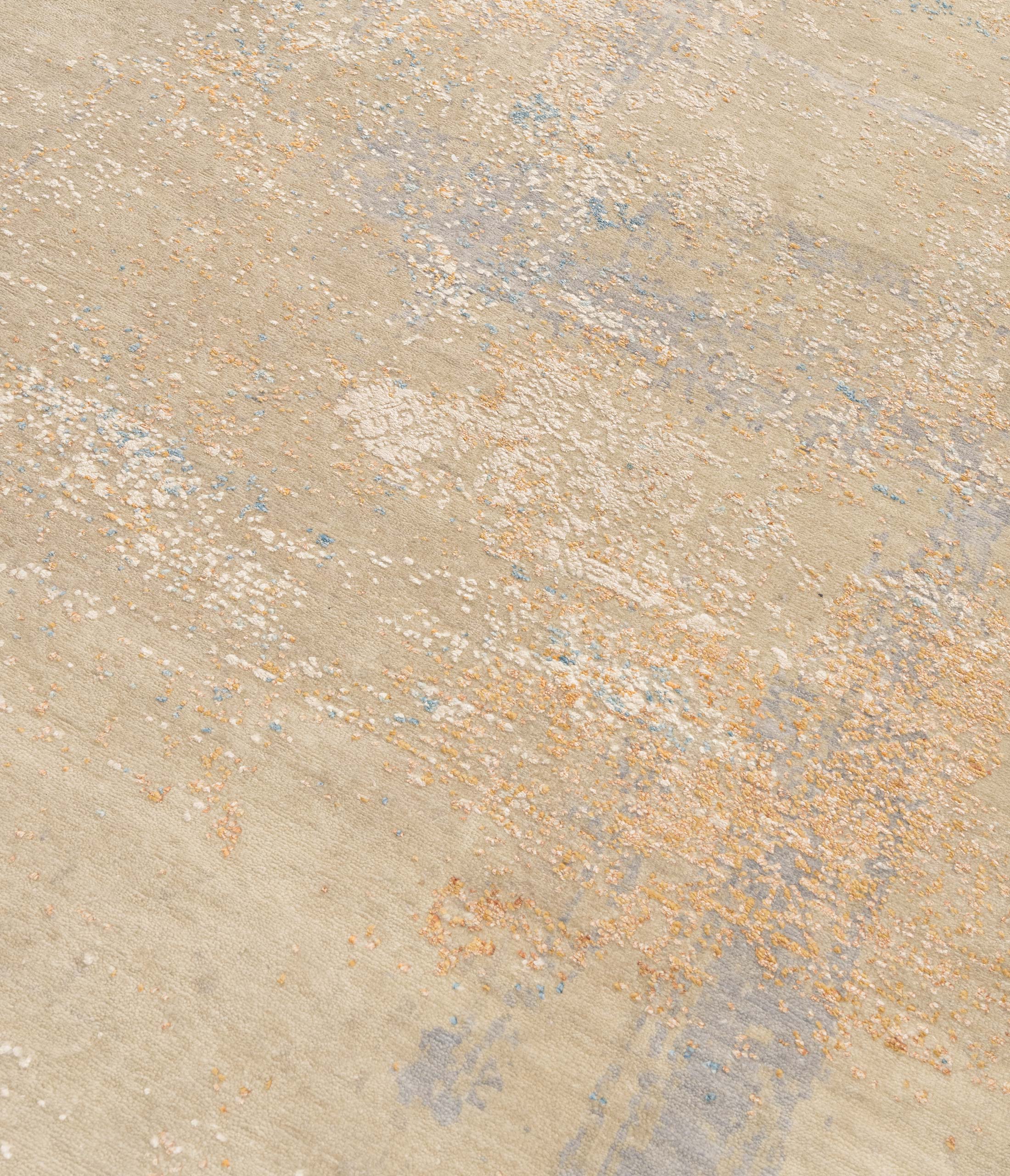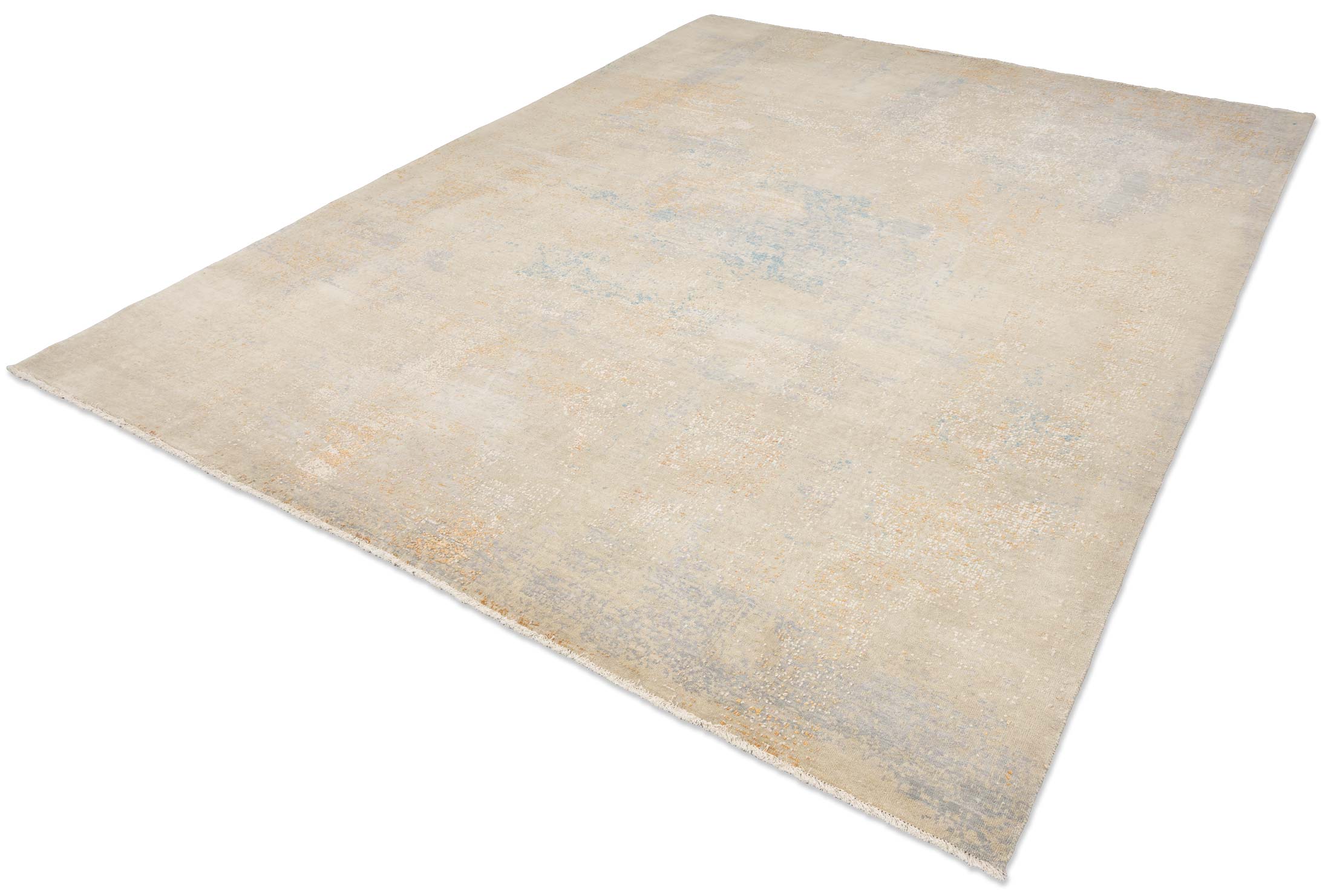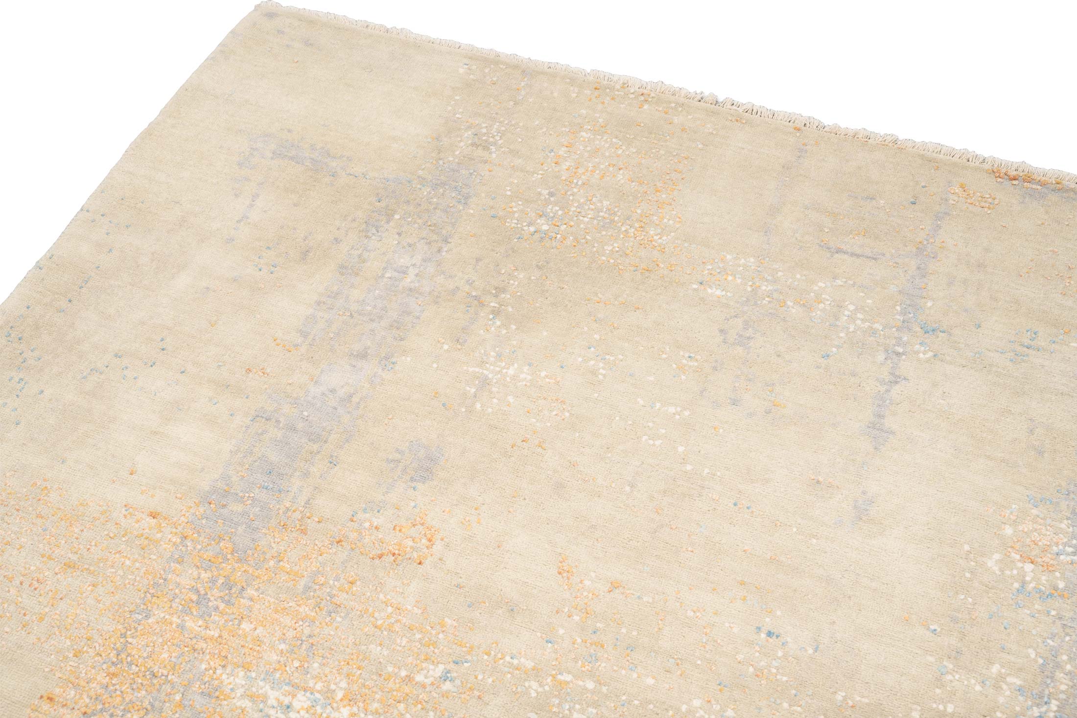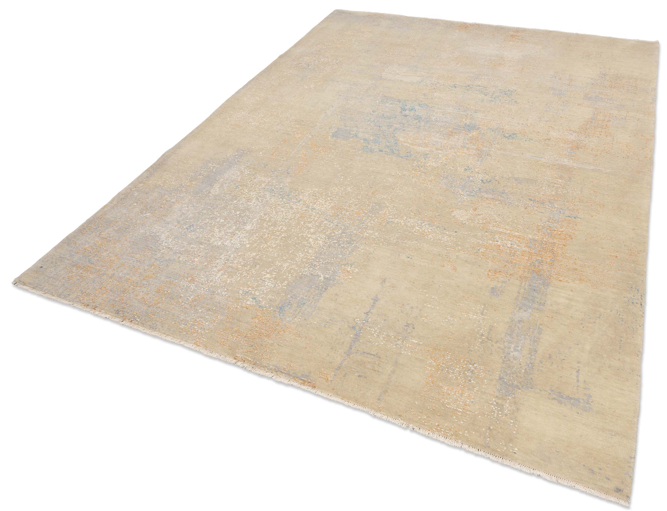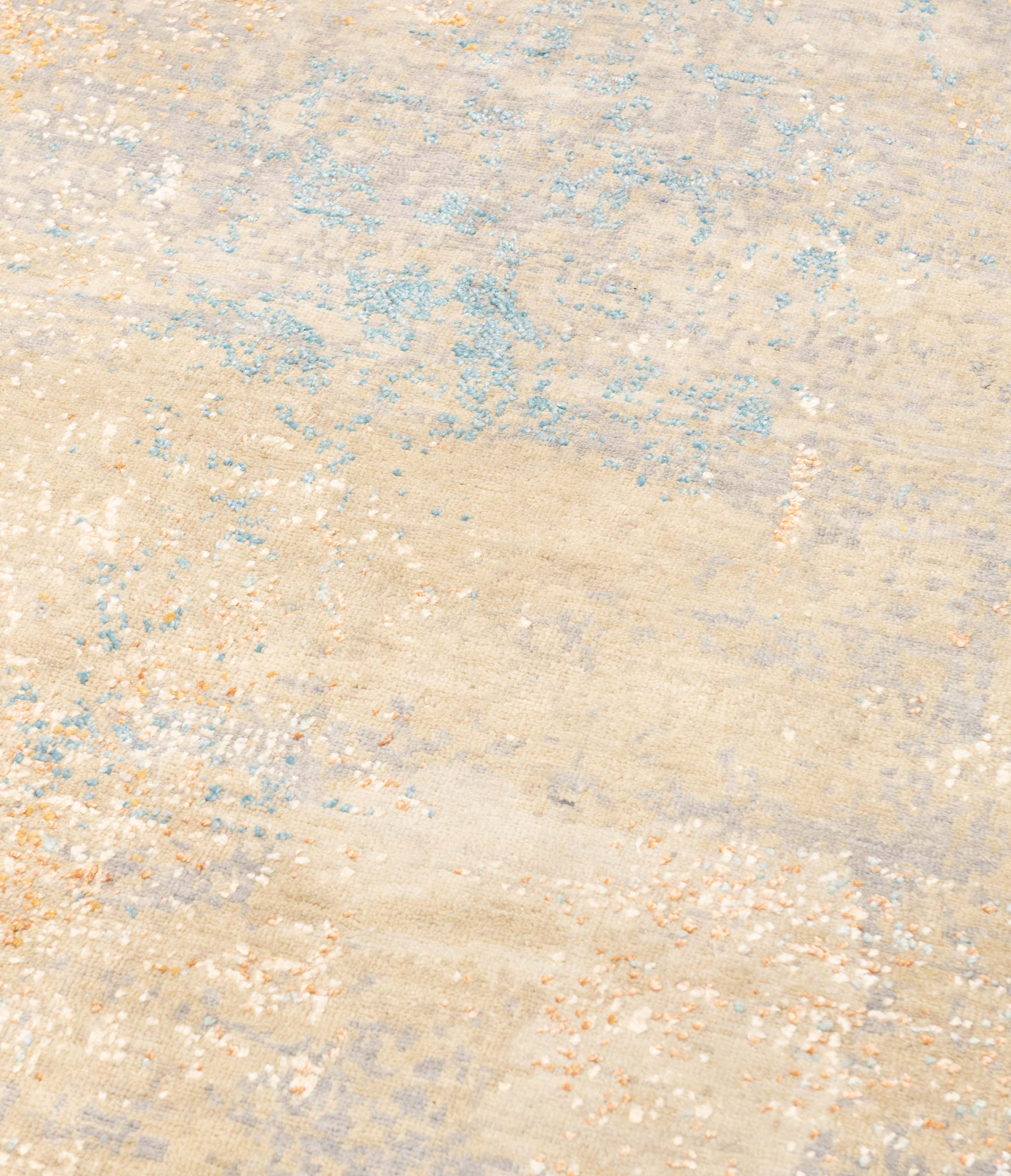 Hier präsentieren wir einen exquisiten handgeknüpften Teppich aus Indien, der durch seine sanften Farben besticht. Die Hauptfarbe dieses Teppichs ist ein sanftes Beige, das eine warme und einladende Atmosphäre schafft. Akzentuiert wird dieses durch Nuancen von zartem Blau und weichem Orange, die dem Teppich eine lebendige, aber dennoch harmonische Ausstrahlung verleihen. Die Musterung ist subtil und abstrakt, was dem Design eine moderne und zeitlose Eleganz verleiht.Der Teppich wird aus ...