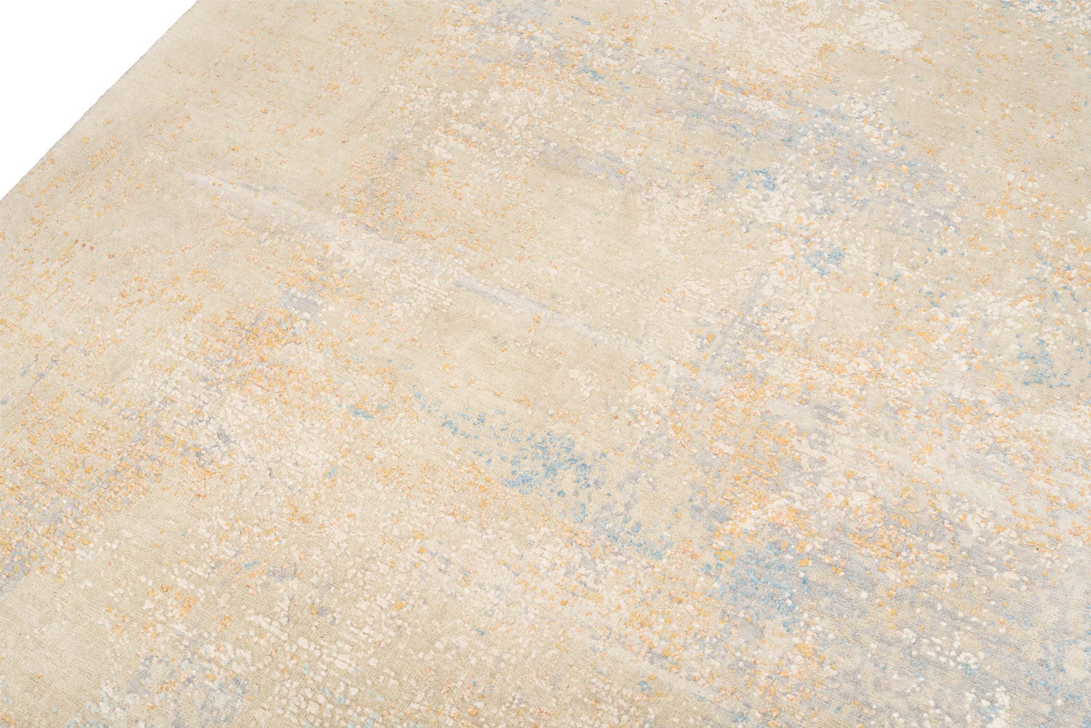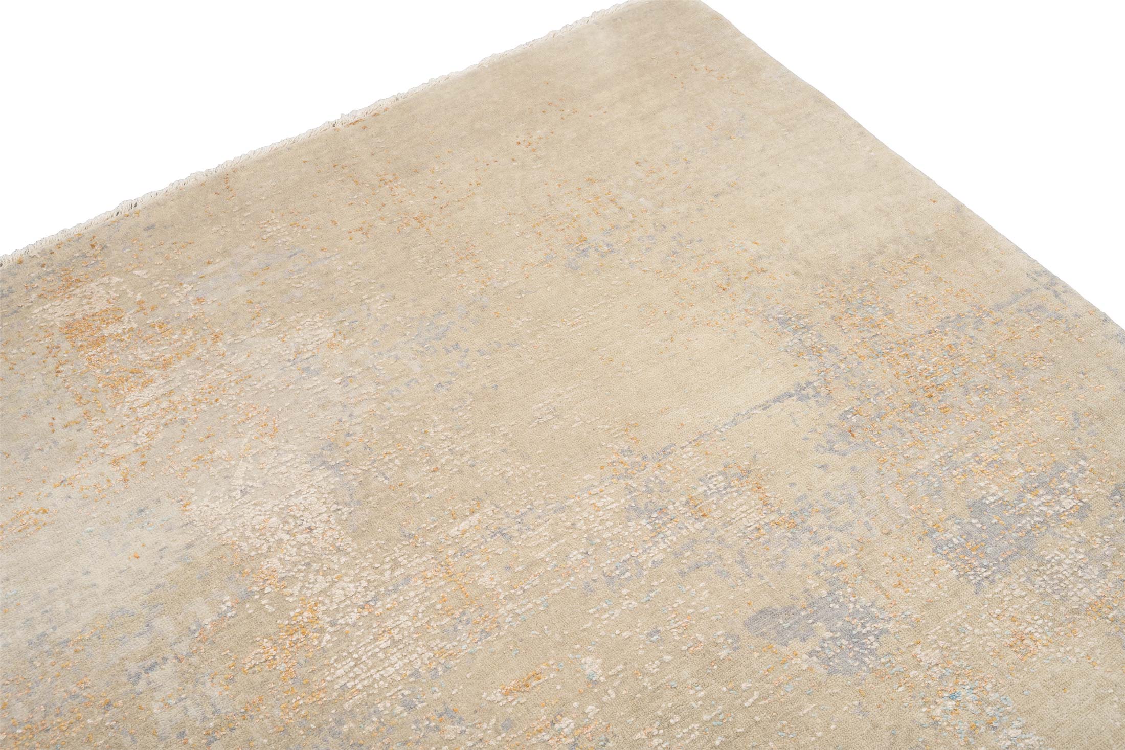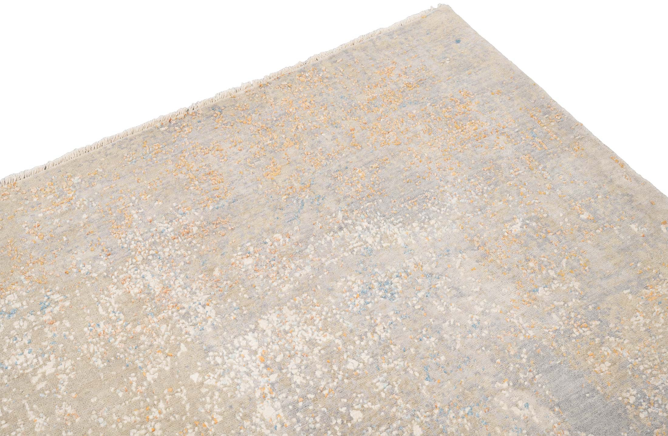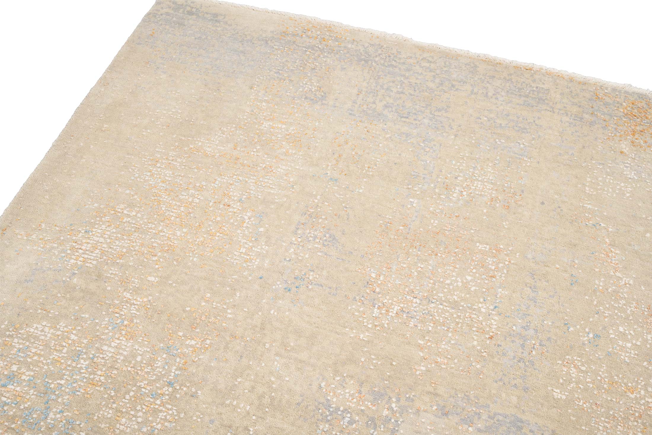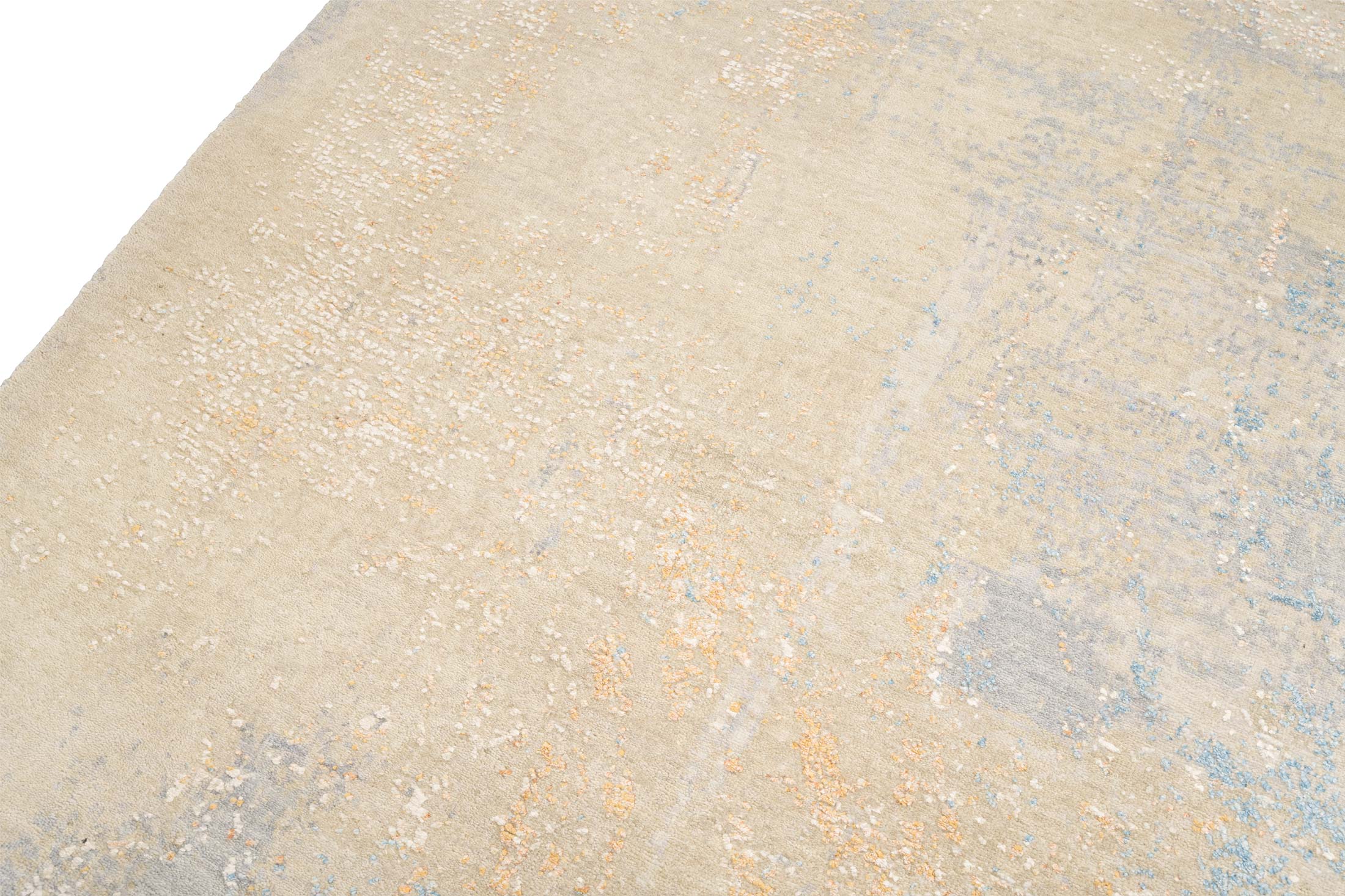 Hier präsentieren wir einen exquisiten handgeknüpften Teppich aus Indien, der durch seine sanften Farben besticht. Die Hauptfarbe dieses Teppichs ist ein sanftes Beige, das eine warme und einladende Atmosphäre schafft. Akzentuiert wird dieses durch Nuancen von zartem Blau und weichem Orange, die dem Teppich eine lebendige, aber dennoch harmonische Ausstrahlung verleihen. Die Musterung ist subtil und abstrakt, was dem Design eine moderne und zeitlose Eleganz verleiht.Der Teppich wird aus ...